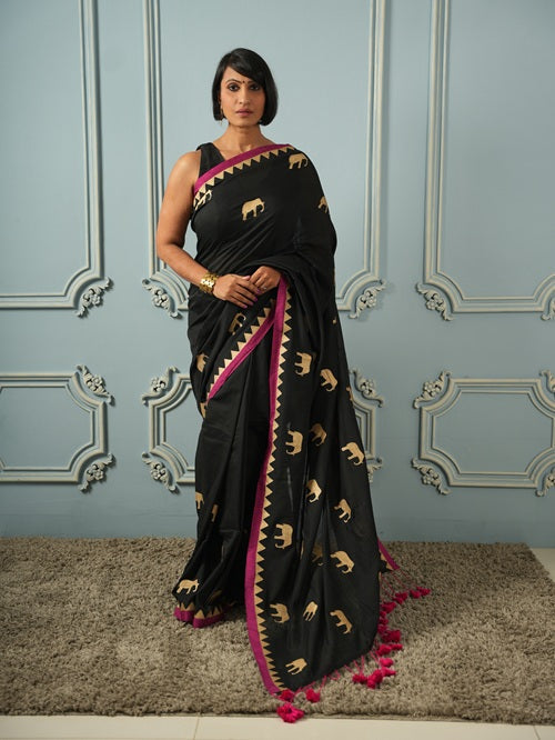 Not A Blank Canvas - Black Handloom Print Sarees | Shobitam