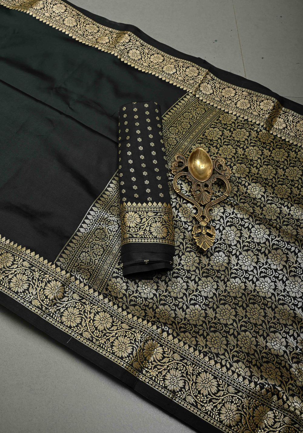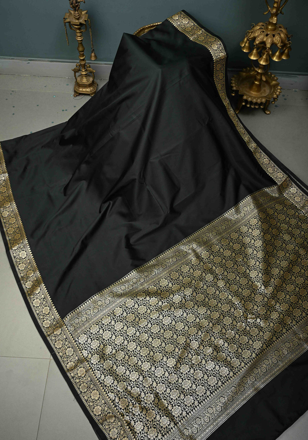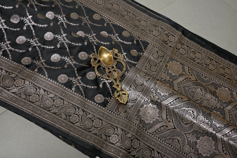 Black Pure Banarasi Kora Silk Saree with Floral Antique Zari Buttas and Contrast Zari Border| SILK MARK CERTIFIED | Shobitam