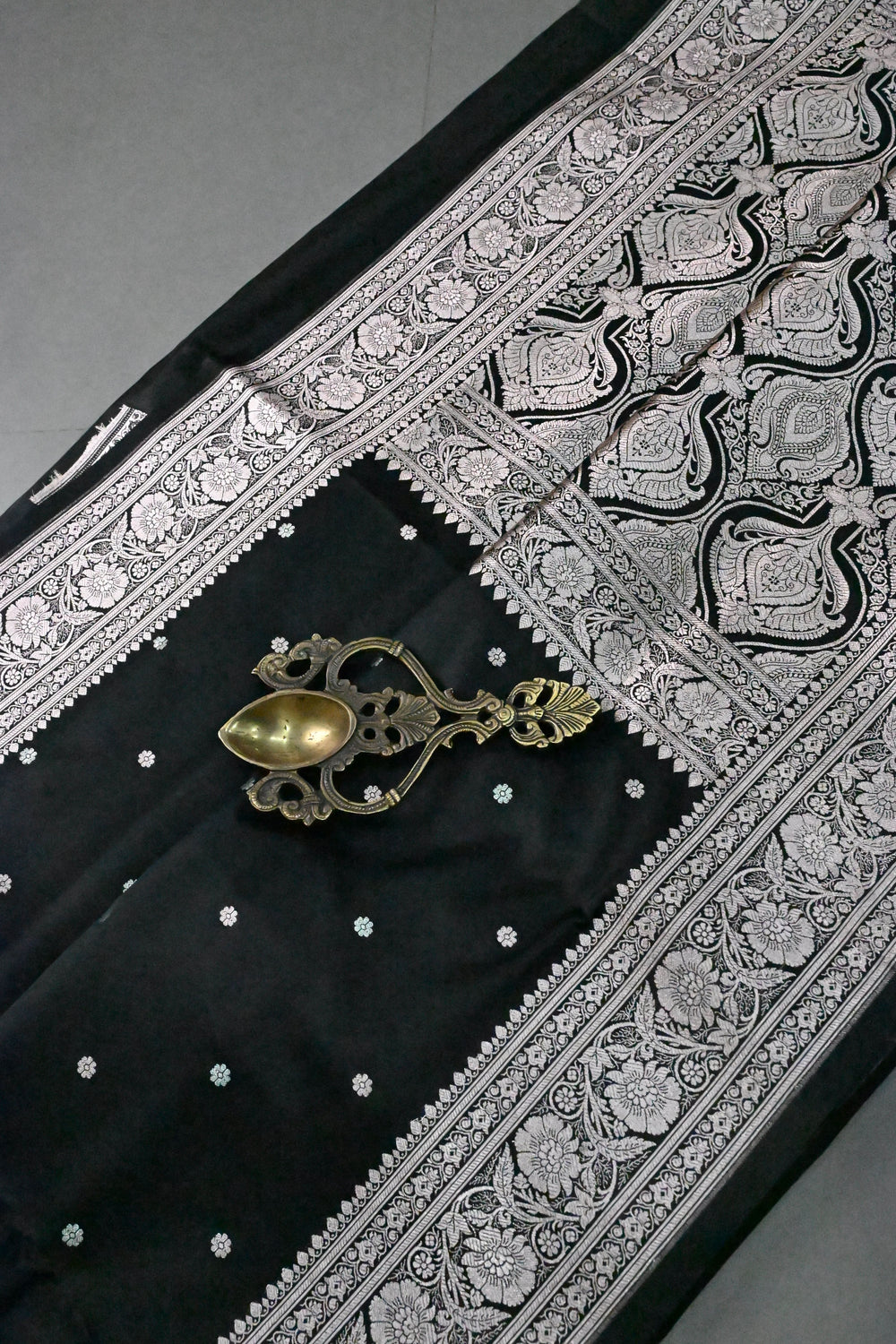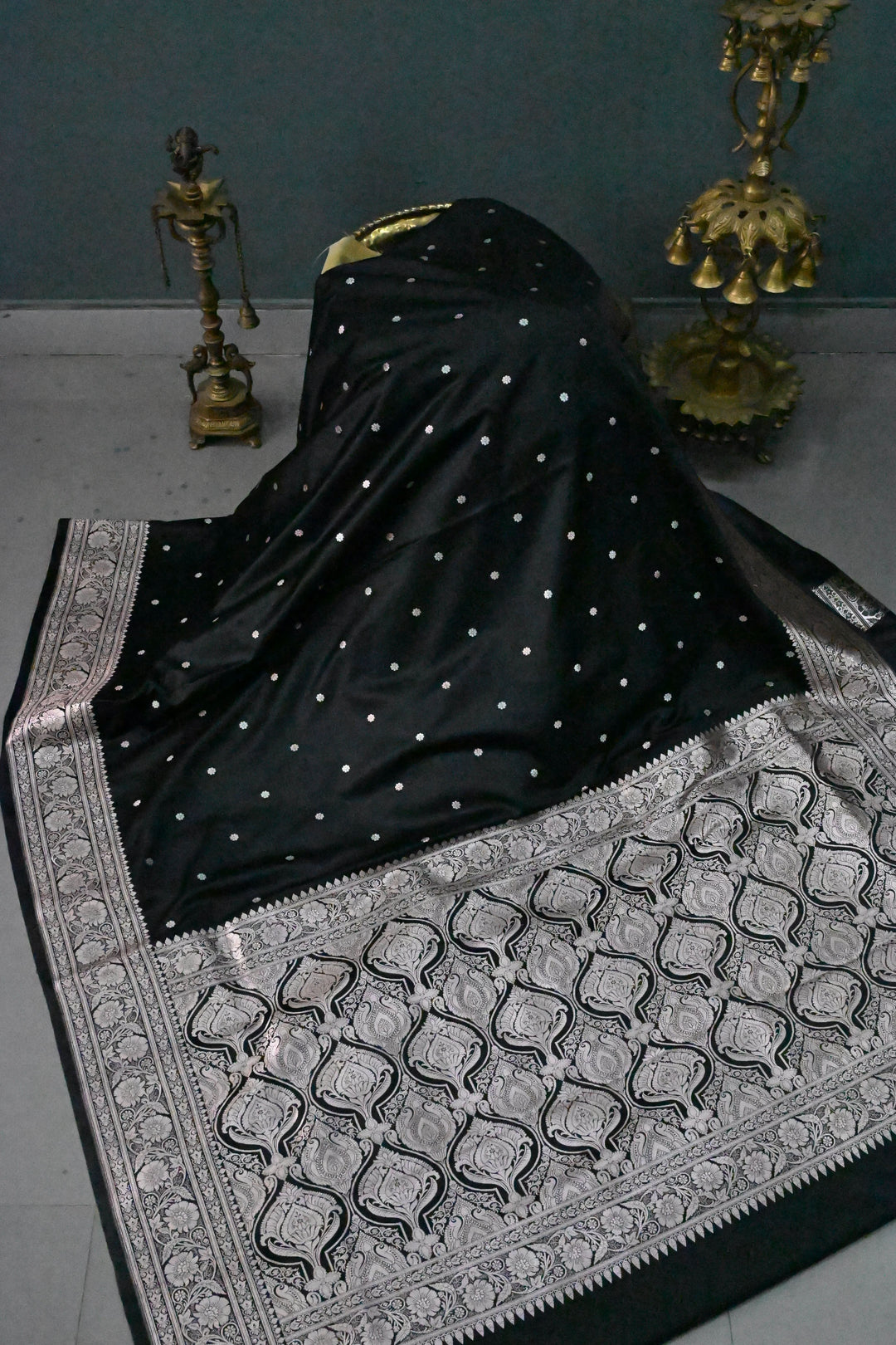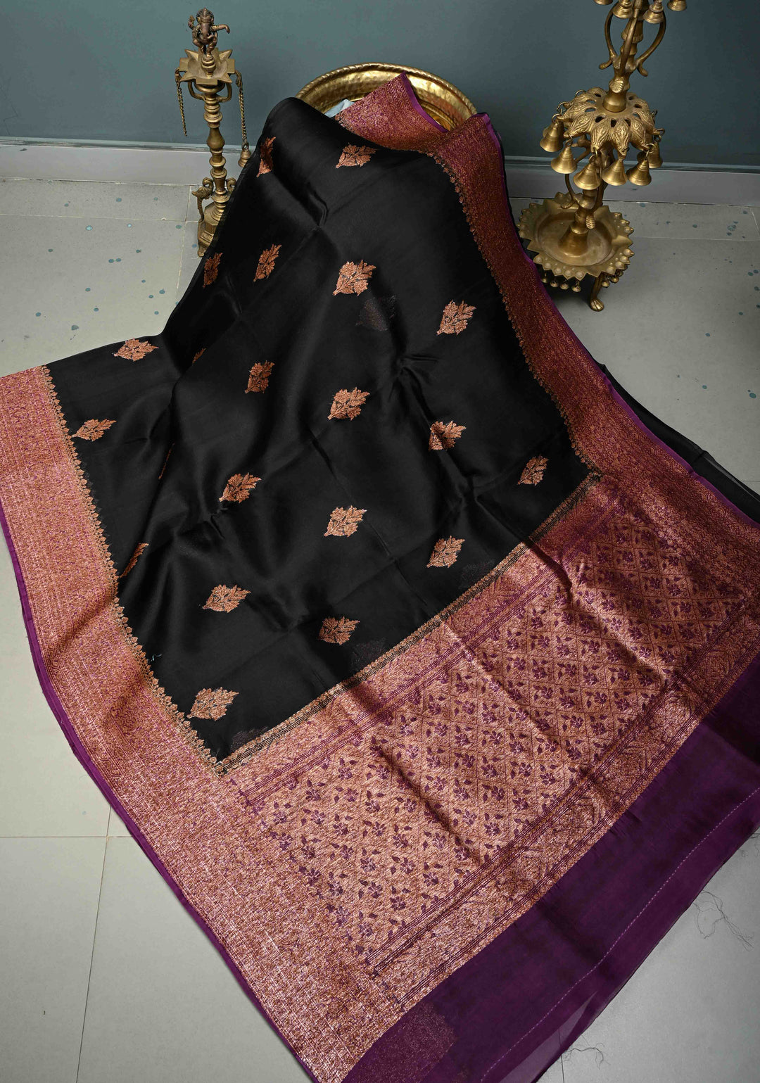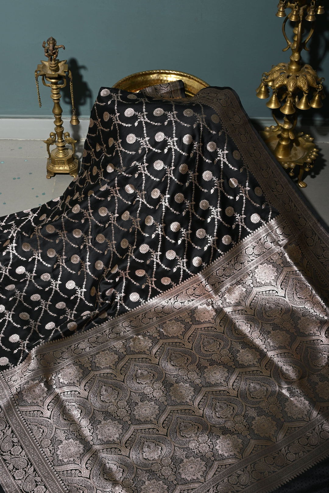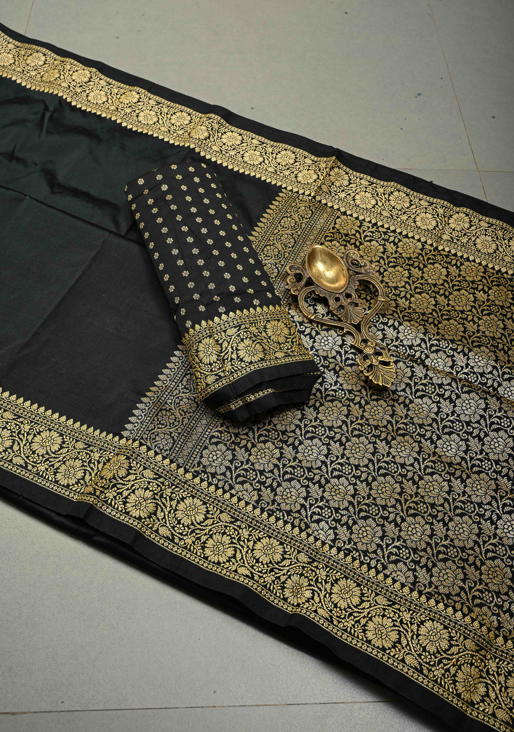 Black Pure Banarasi Kora Silk Saree with Floral Antique Oxidized Zari Buttas and Contrast Zari Border | SILK MARK CERTIFIED | Shobitam