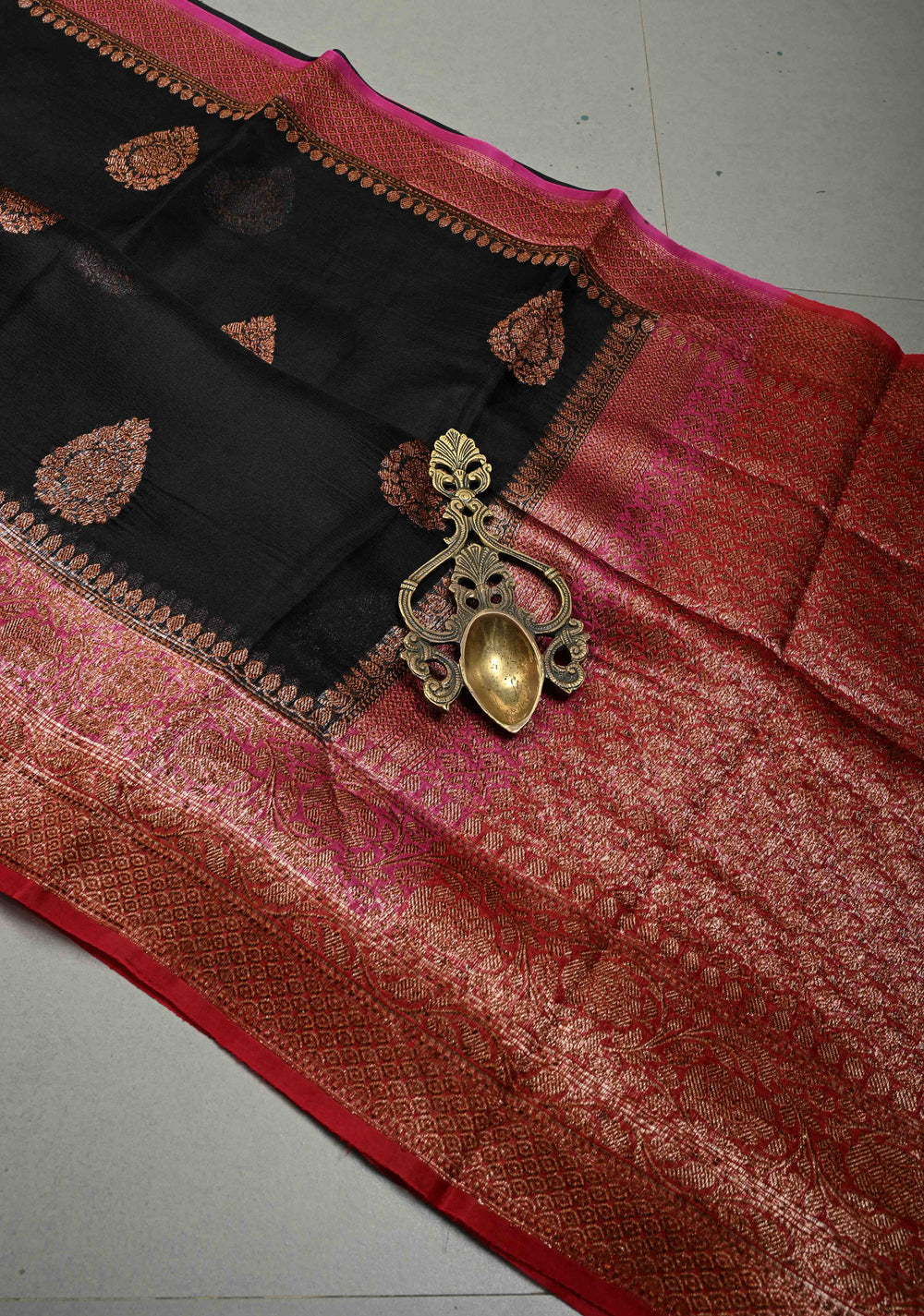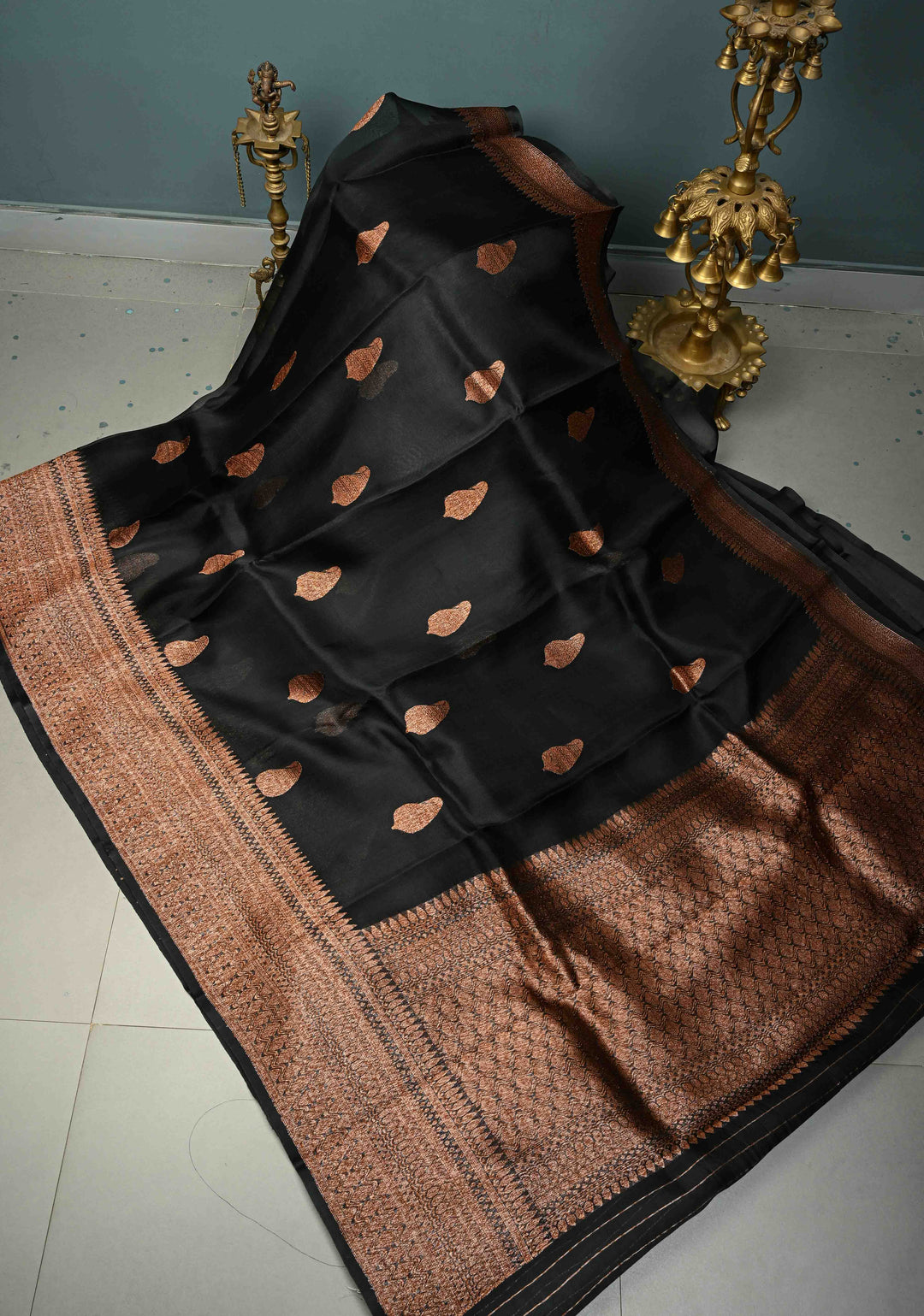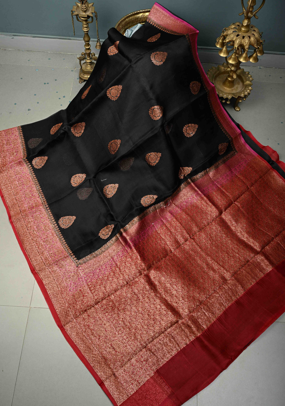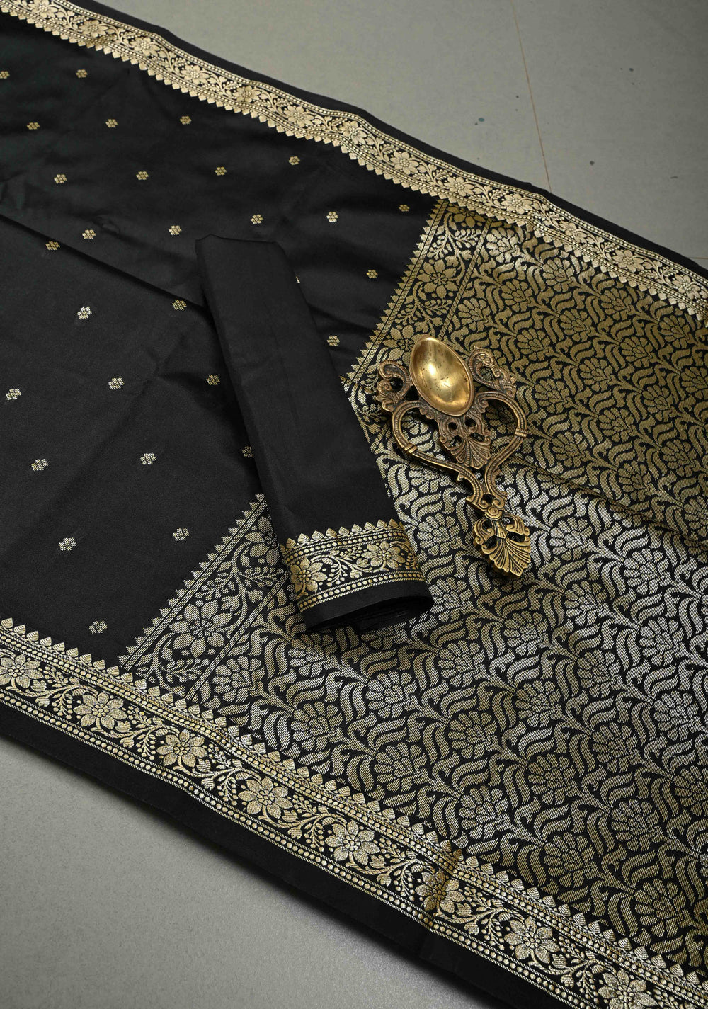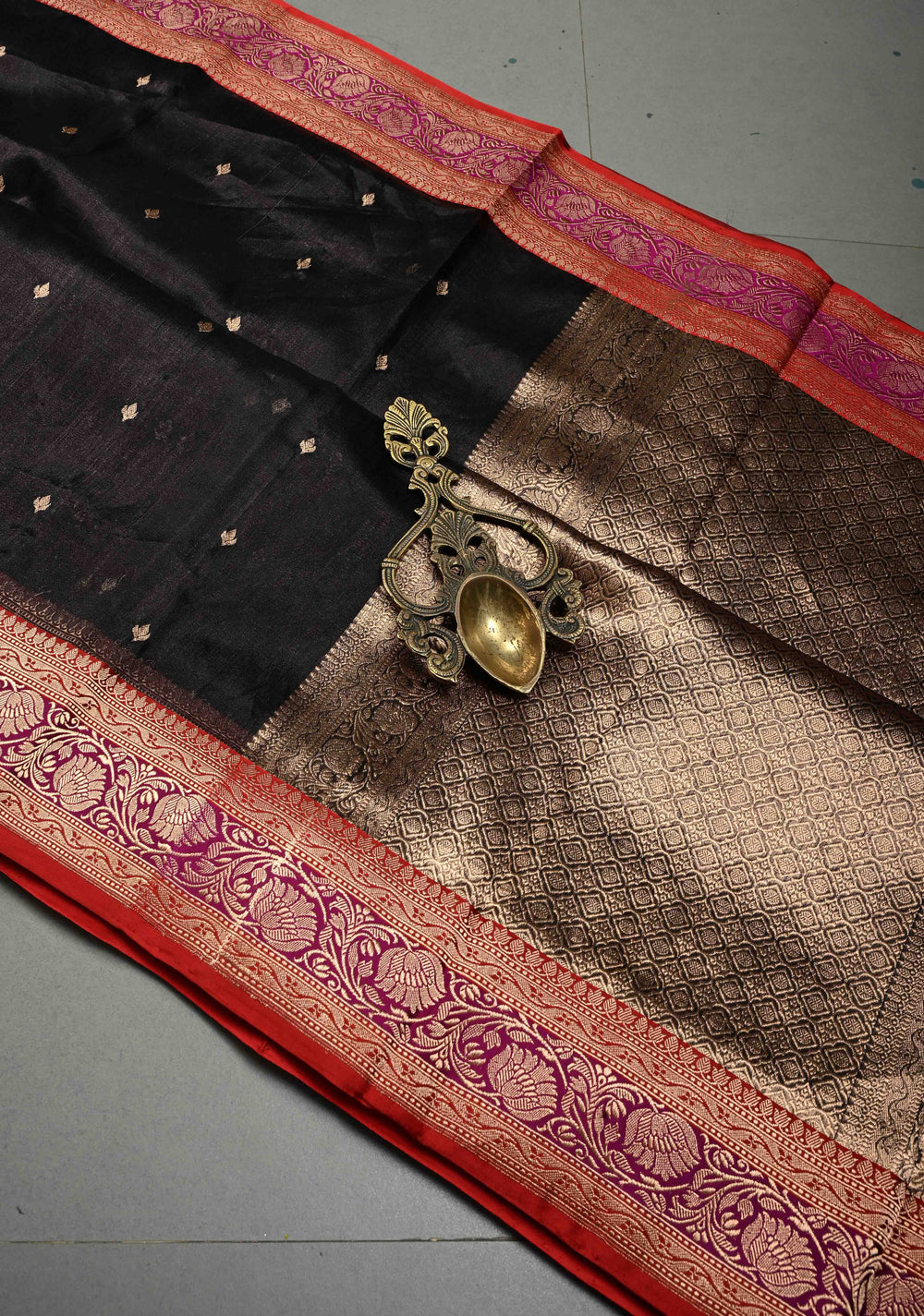 Black Pure Banarasi Kora Silk Saree with Floral Antique Oxidized Zari Buttas and Contrast Zari Border | SILK MARK CERTIFIED | Shobitam