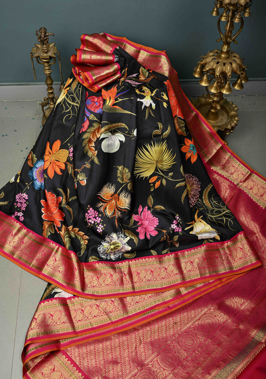 Stunning Black Pure Kanjivaram Silk Saree with Tropical Floral Digital Print and Contrast Pink-Mustard Zari Border | SILK MARK CERTIFIED | Shobitam