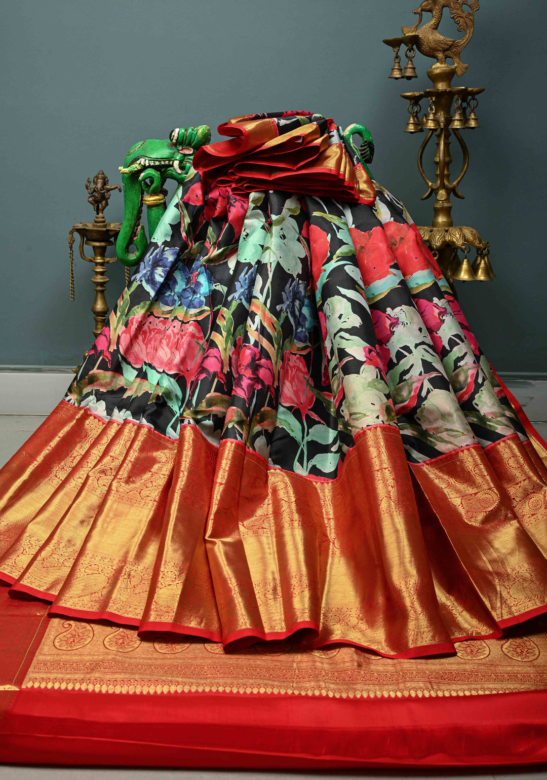 Black Pure Kanjivaram Silk Saree with Abstract Floral Digital Print and Contrast Red Wide Zari Border | SILK MARK CERTIFIED | Shobitam