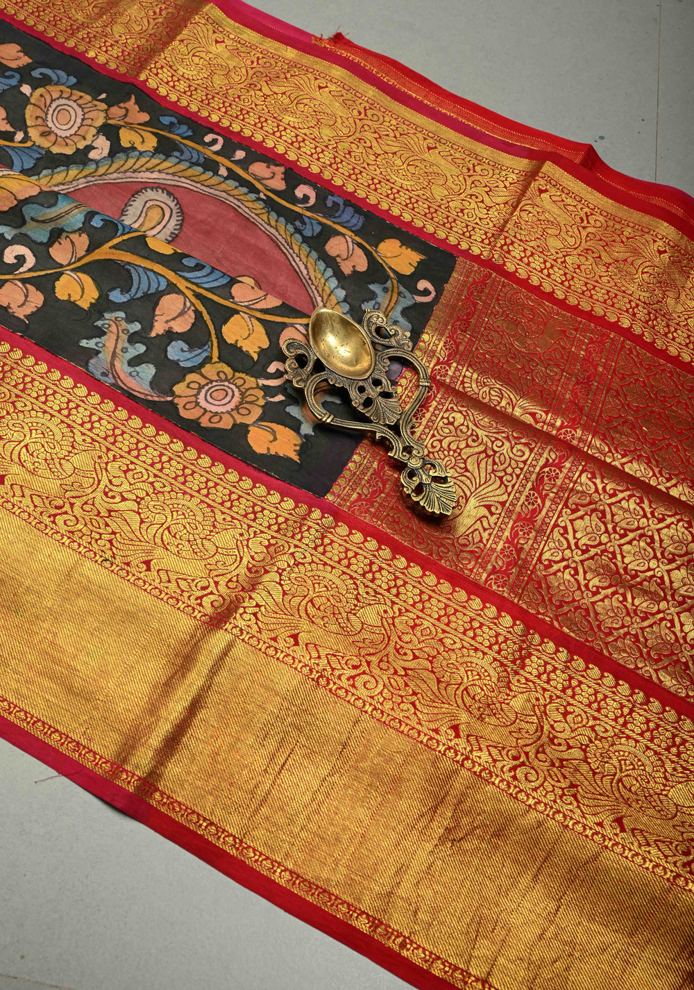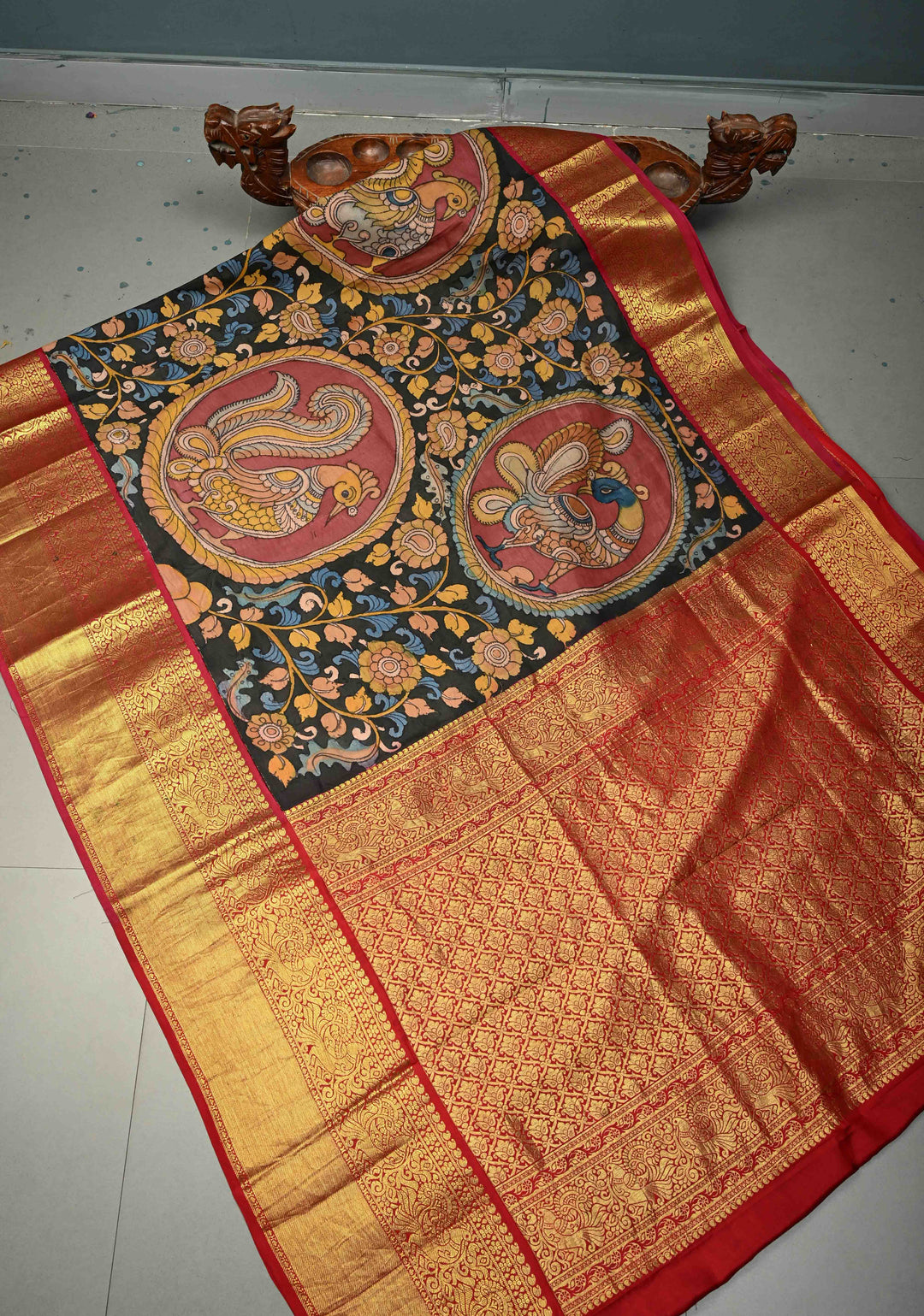 Peacock and Floral Theme : Authentic Pen Kalamkari Handpainted on Pure Kanjivaram Silk Saree with Contrast Wide Zari Border | SILK MARK CERTIFIED | Shobitam