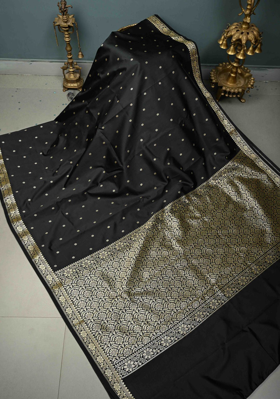 Black Banarasi Semi Mashru Silk Saree with Sona Rupa Chunri Buttis and Zari Border | Shobitam