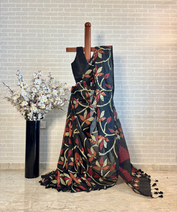 Black Semi Silk Saree with Meenakari Floral Minimal Zari Border | Shobitam