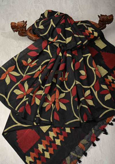 Black Uppada Handloom Cotton Saree with Tree of life Buttas on Minimal Border-Pallu and Long Tassels