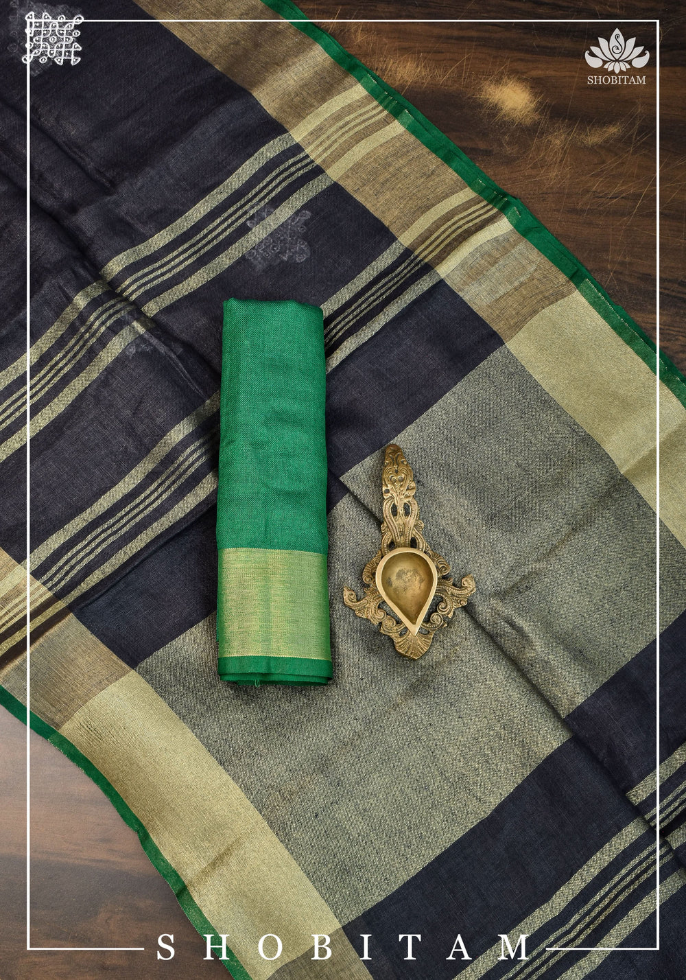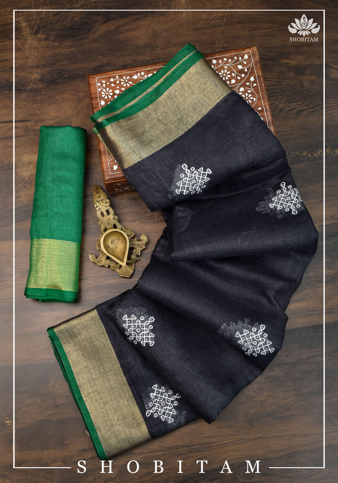 Kolam Linen By Linen embroidery Saree in Black with green selvedges | Sarees By shobitam