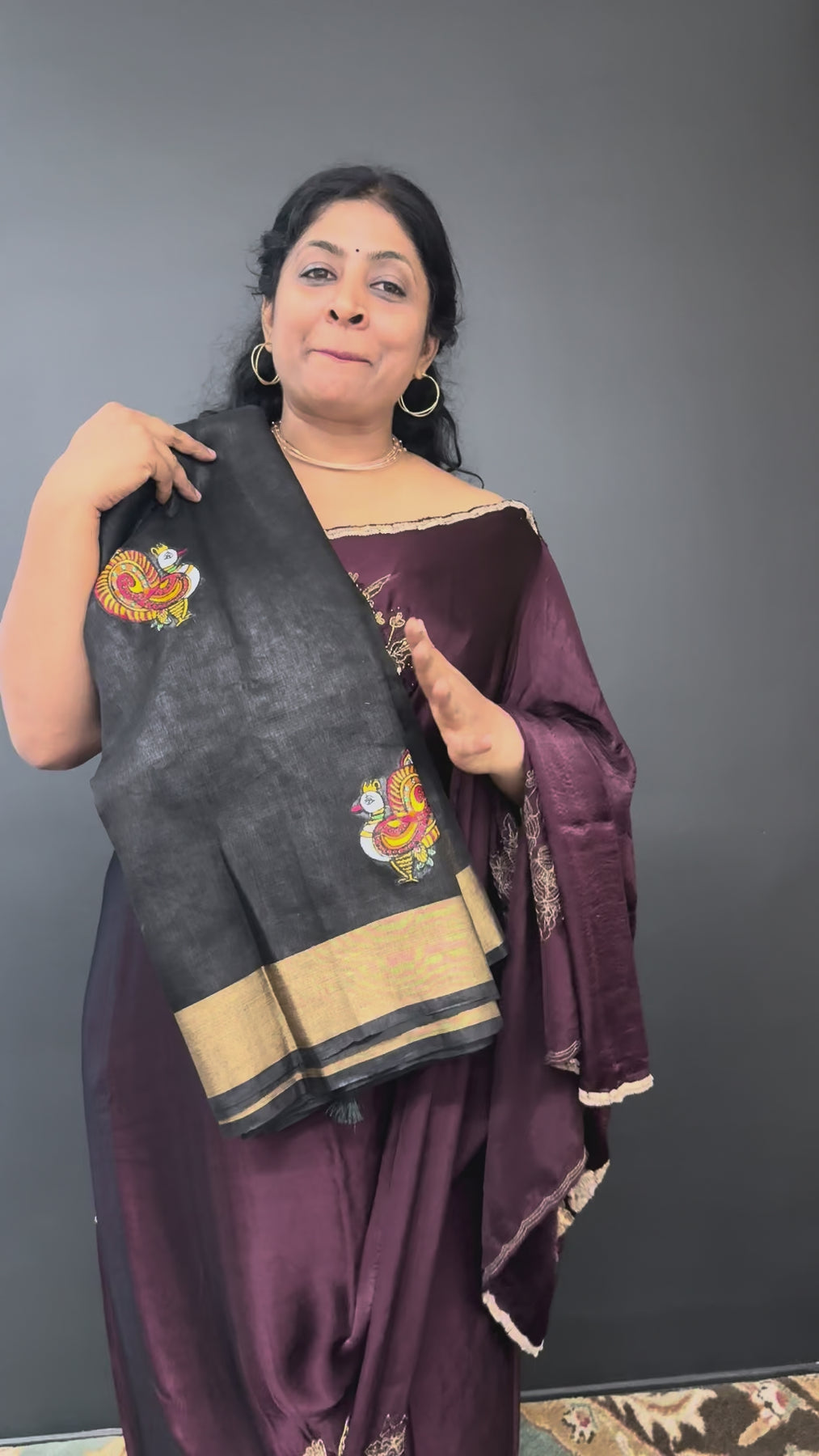 Annapakshi -the divine Swan embroidered motifs on Black Silk Linen Saree
