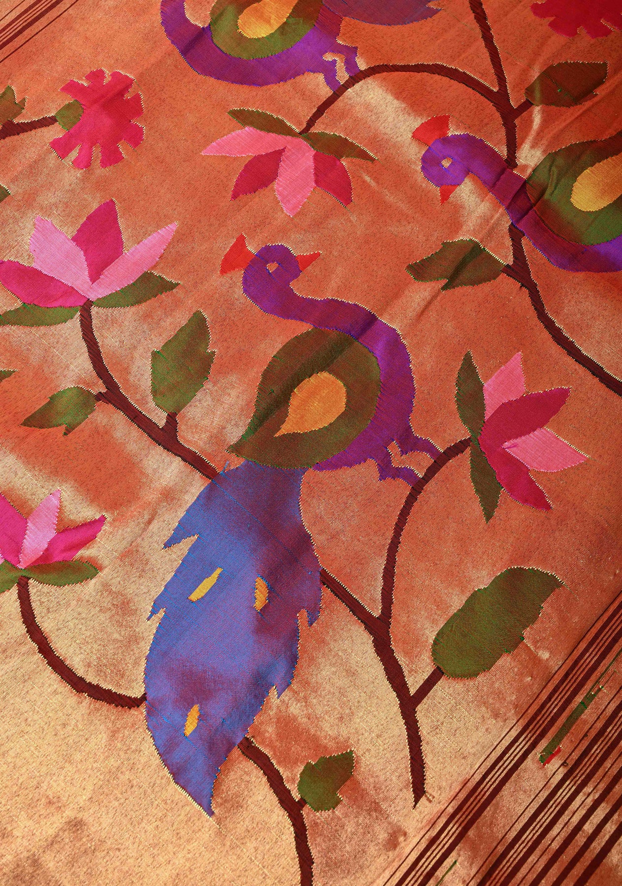 The saree is framed by classic single Muniya borders—a signature motif in Paithani weaving—crafted in radiant zari. The pallu steals the spotlight with an intricately woven peacock motif, symbolizing grace, beauty, and prosperity. Made from pure silk this heirloom-worthy piece is ideal for festive occasions or cultural events.