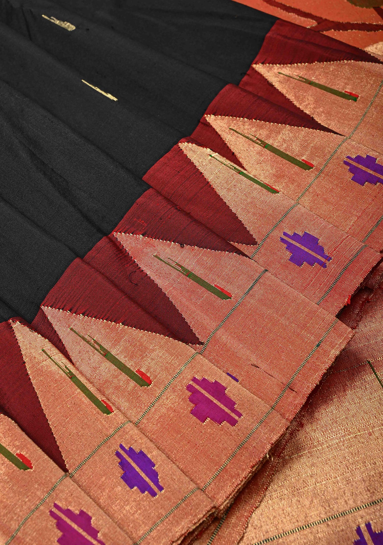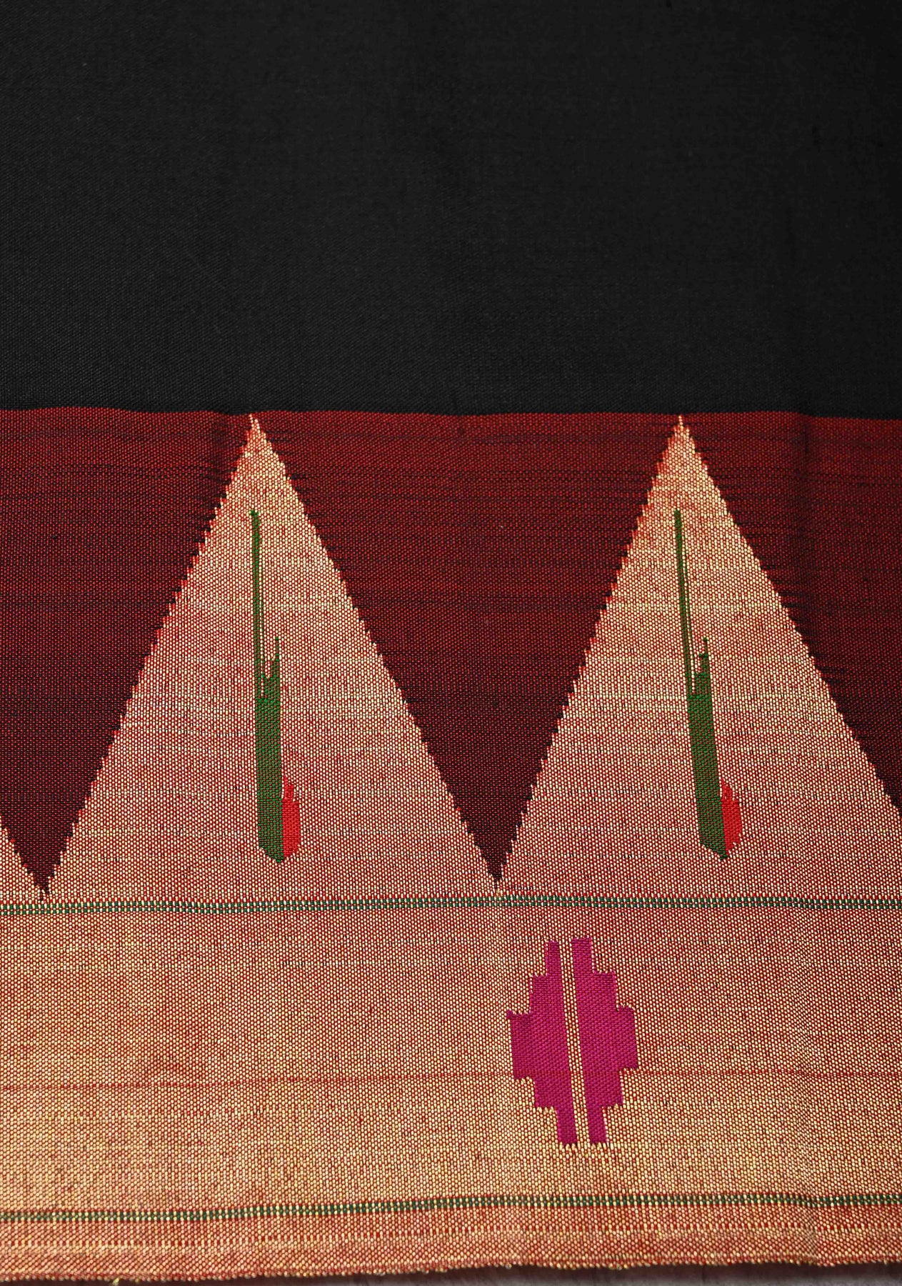 A symbol of heritage and timeless sophistication, this Authentic Black Yeola Paithani Handloom Silk Saree is a masterwork of traditional craftsmanship. Woven in the famed looms of Yeola, the saree features a deep, regal black base adorned with delicate golden zari buttas throughout the body, offering a subtle yet luxurious shimmer.