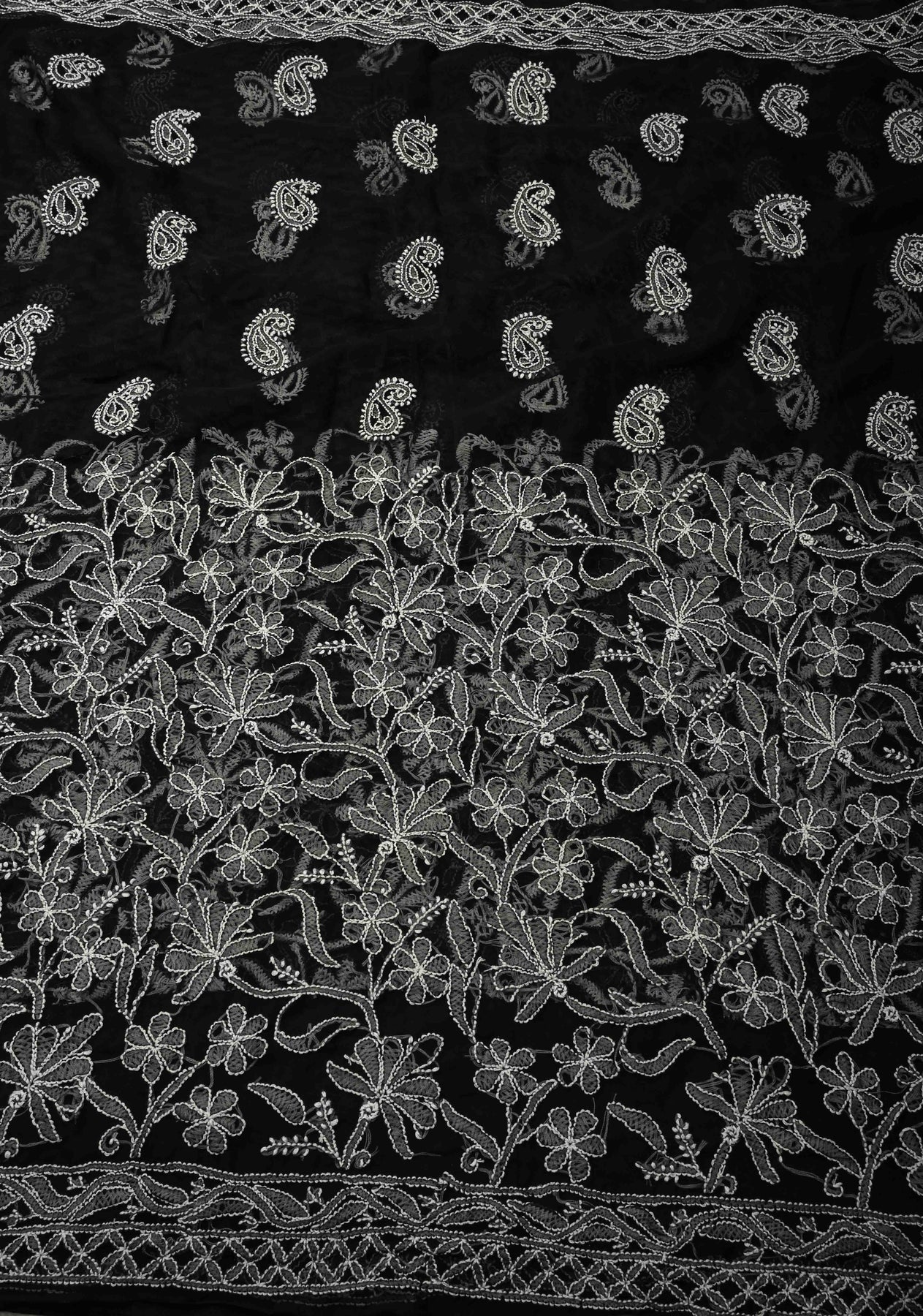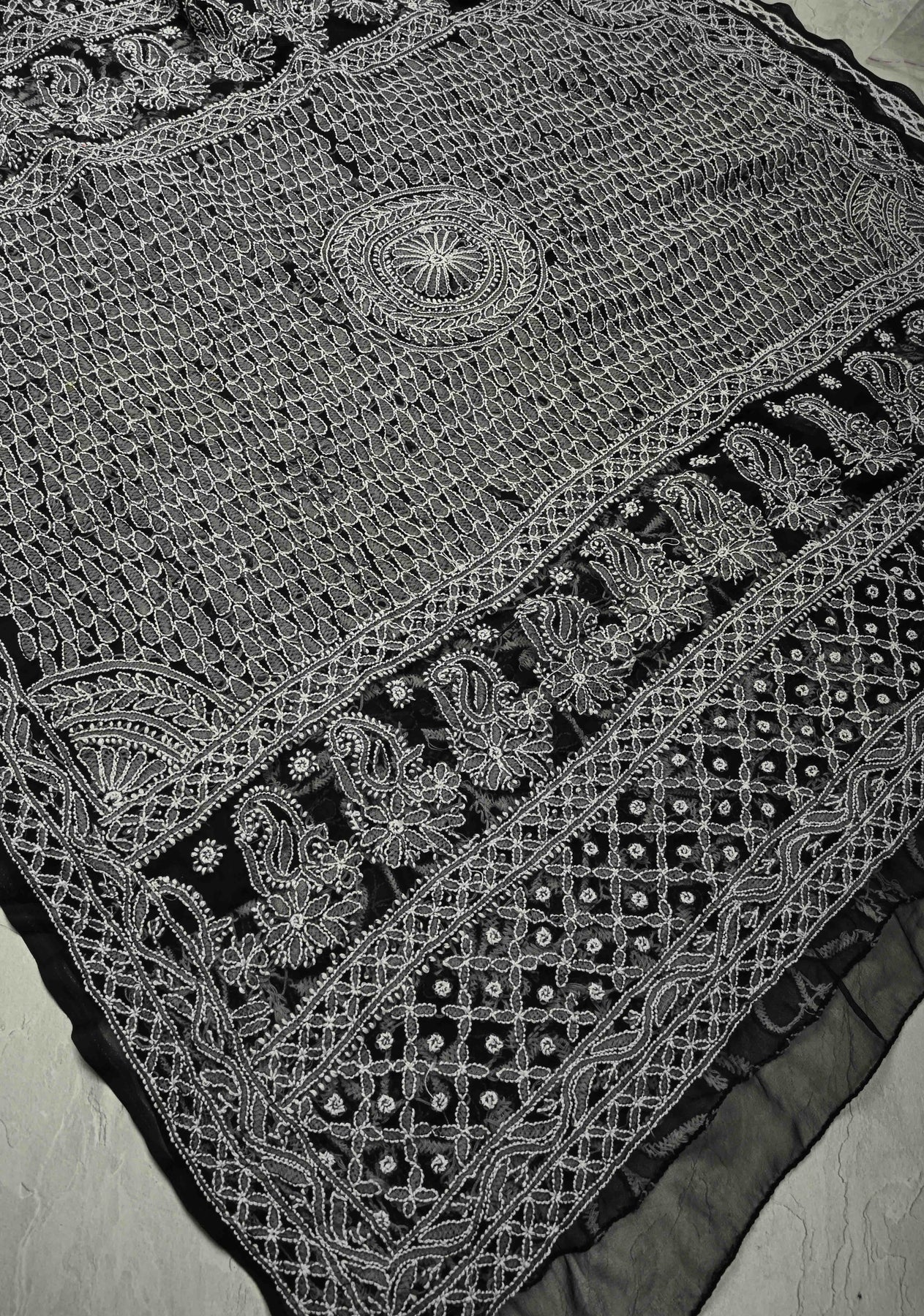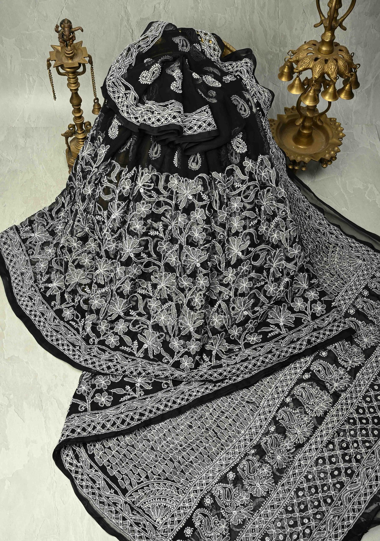 Black Authentic Hand-Embroidered Full Jaal Chikankari Georgette Saree with Skirt Border