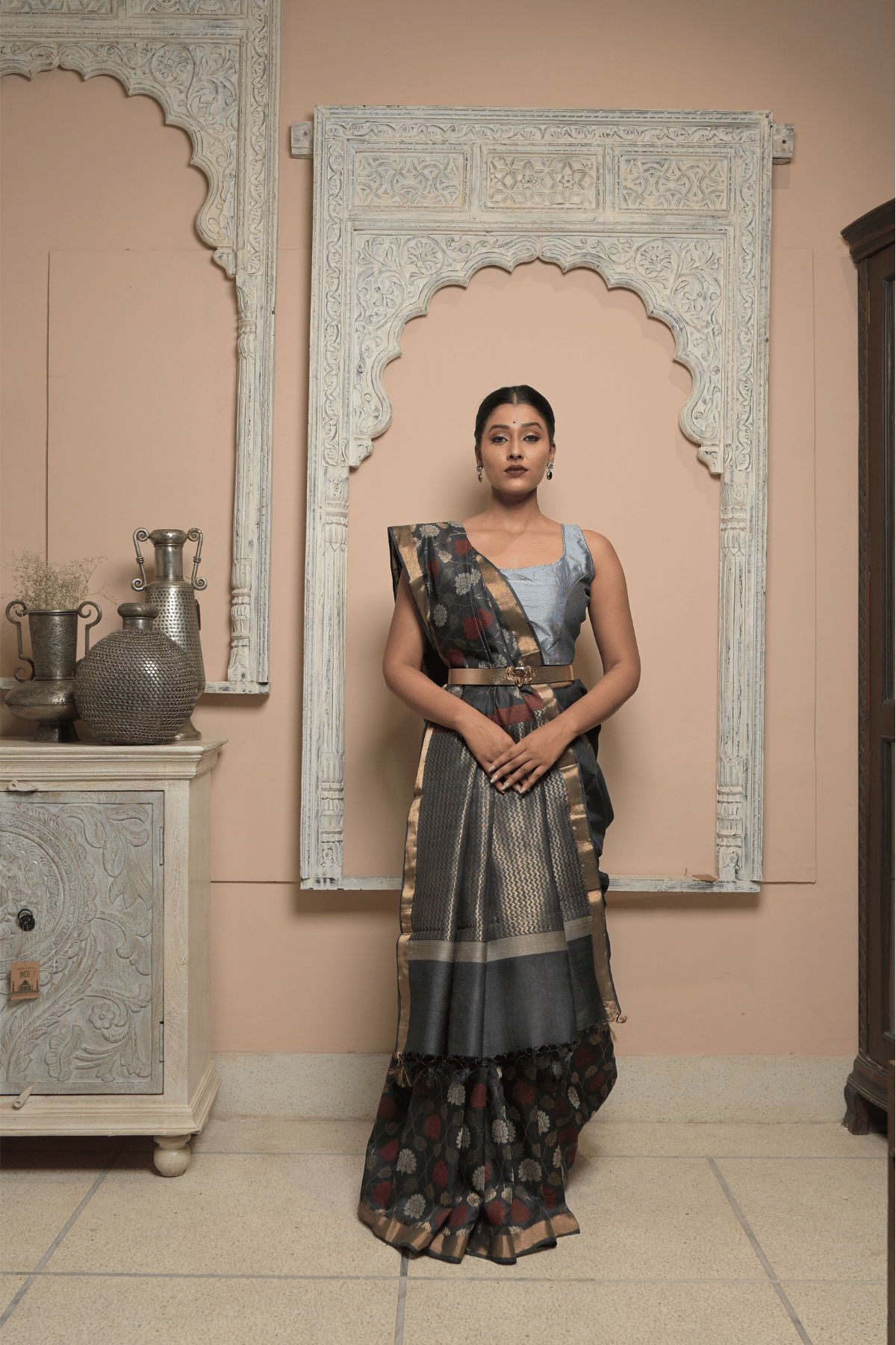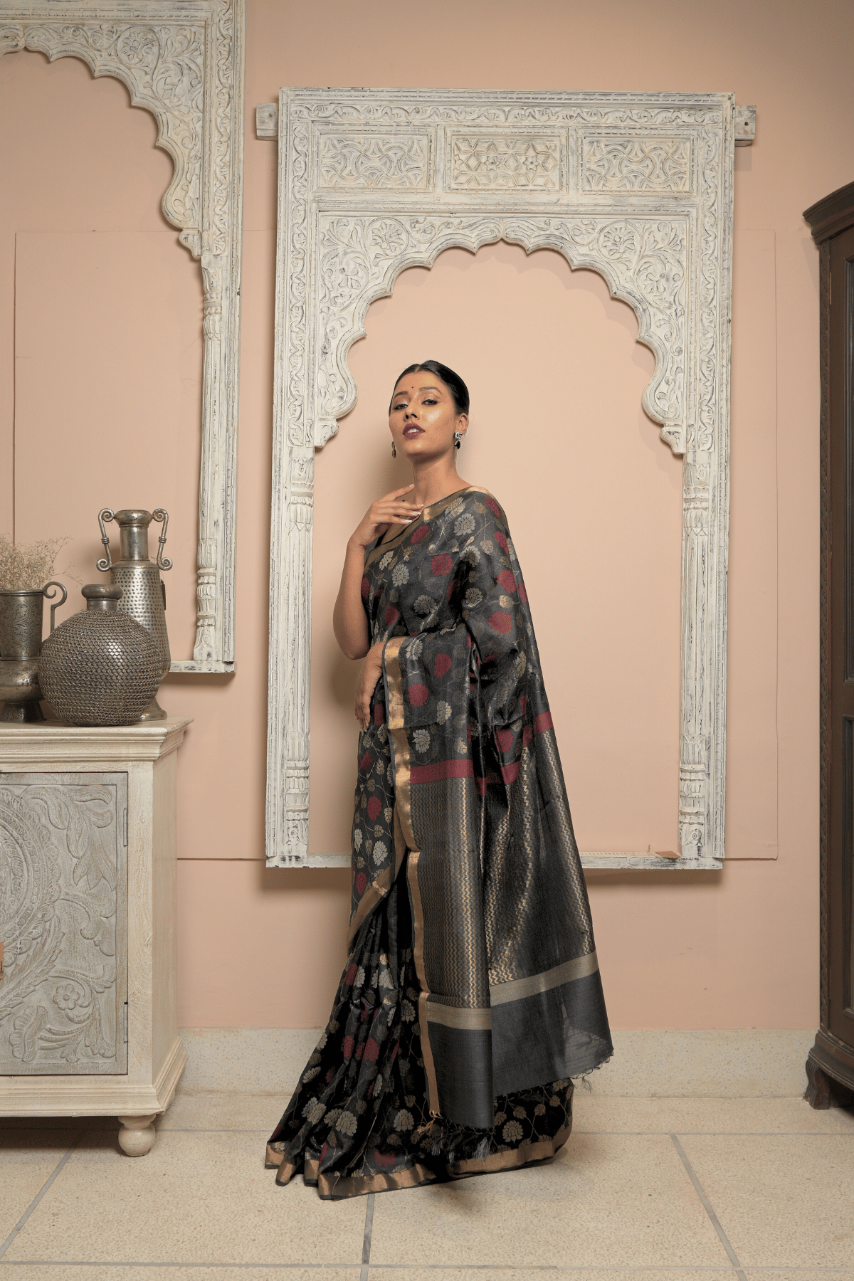 Each saree is crafted by skilled artisans using traditional techniques, ensuring that every piece is unique and of the highest quality. The Muktakesha spun silk saree is a timeless piece that embodies the essence of femininity and grace. Its elegant design and superior quality make it a must-have addition to your collection, and it will remain a cherished item in your wardrobe for years to come. Dress to impress with the Muktakesha spun silk saree
