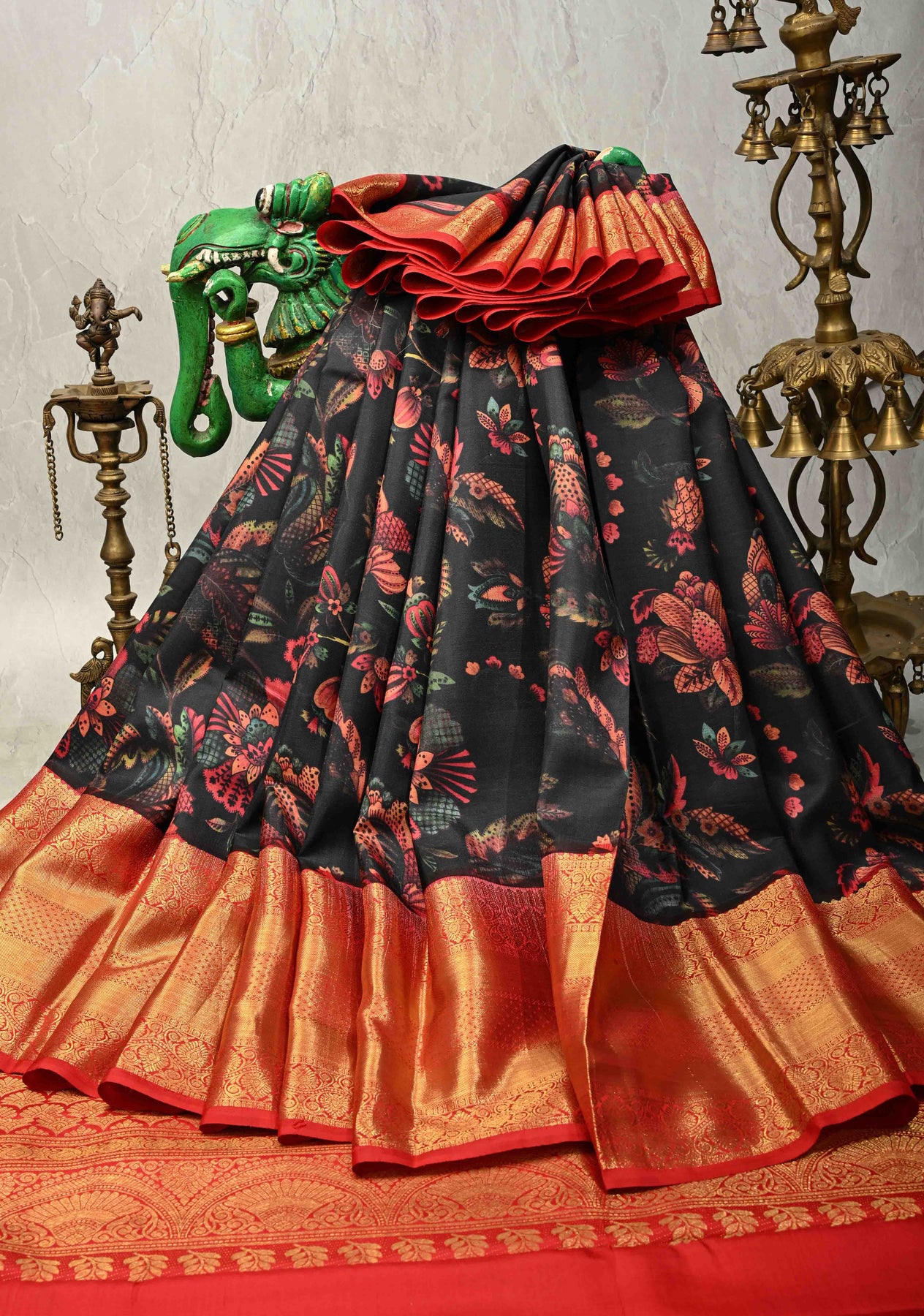 This black pure Kanjivaram silk saree is a perfect expression of timeless elegance and refined craftsmanship. Crafted from silk, it features delicate floral digital prints that add a graceful and contemporary touch to its classic base. The contrast zari border enhances the saree’s regal appeal, creating a striking visual balance. With its smooth texture and elegant drape, this saree is ideal for evening occasions. Perfect for festive celebrations, and special gatherings, it embodies sophistication and tradition in every detail.