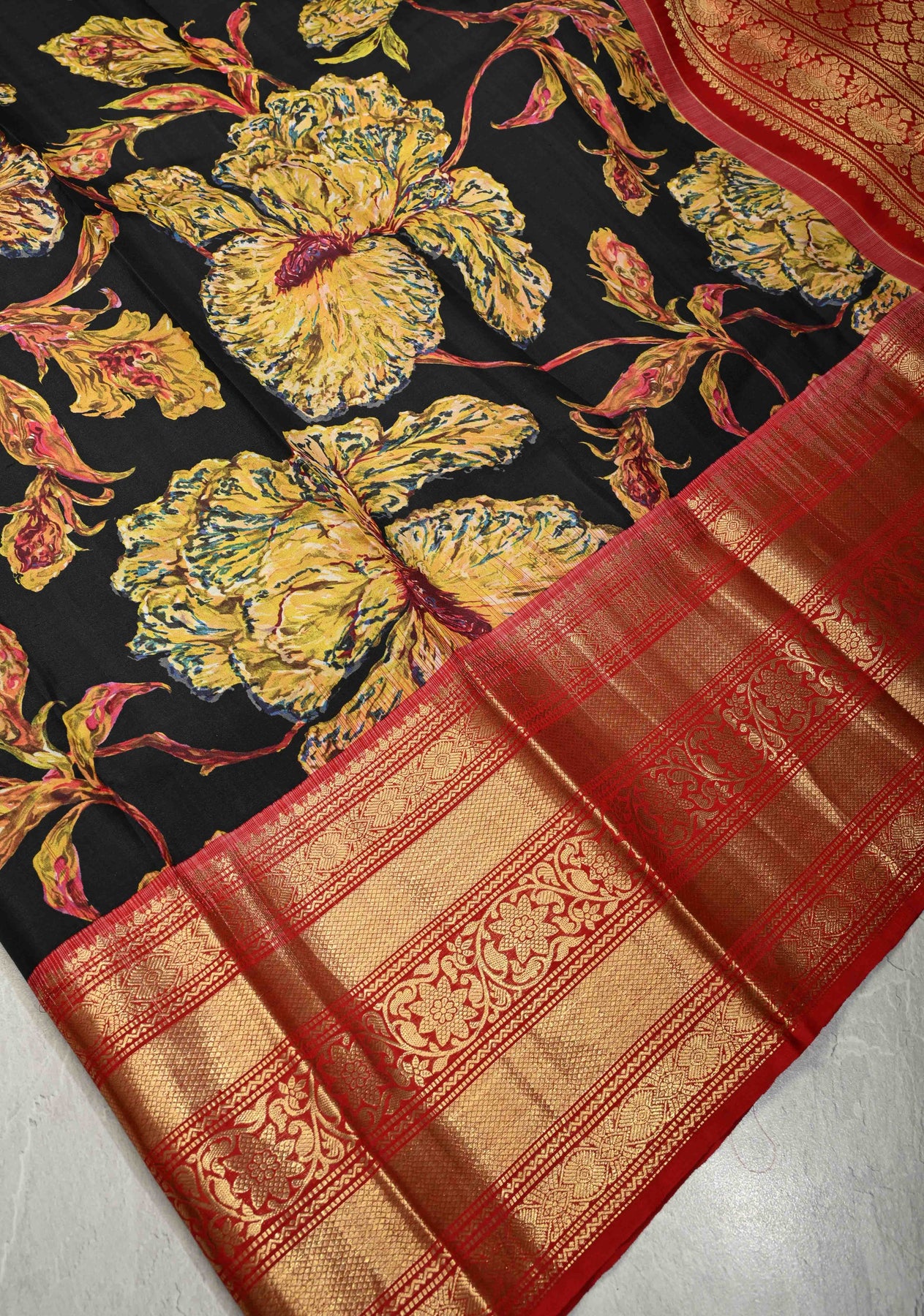 This Black Pure Kanjivaram Silk Saree is a striking fusion of classic luxury and modern design. The black silk base is enhanced with abstract floral digital prints, creating a bold and contemporary visual appeal. A wide contrast zari border adds grandeur and beautifully balances the modern artwork with traditional elegance. Crafted from pure Kanjivaram silk, the saree offers a smooth texture and graceful drape. Ideal for weddings, festive celebrations, and evening events, it makes a powerful style statement. The combination of deep color, artistic prints, and rich zari detailing reflects refined sophistication. A perfect choice for those who love timeless tradition with a modern twist.