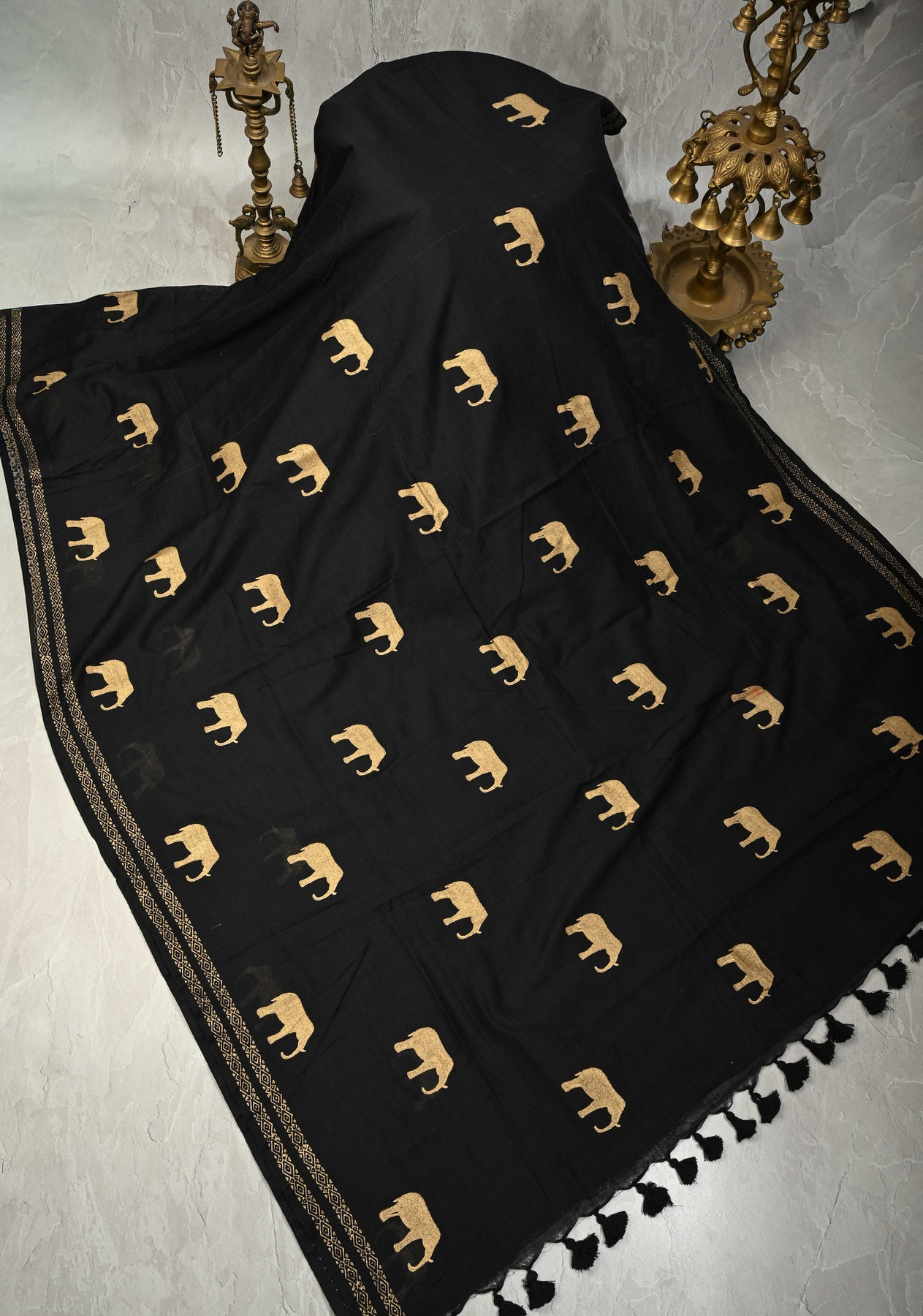 Black Uppada  Cotton Saree with Elephant Blcok Print Buttas and Minimal Border