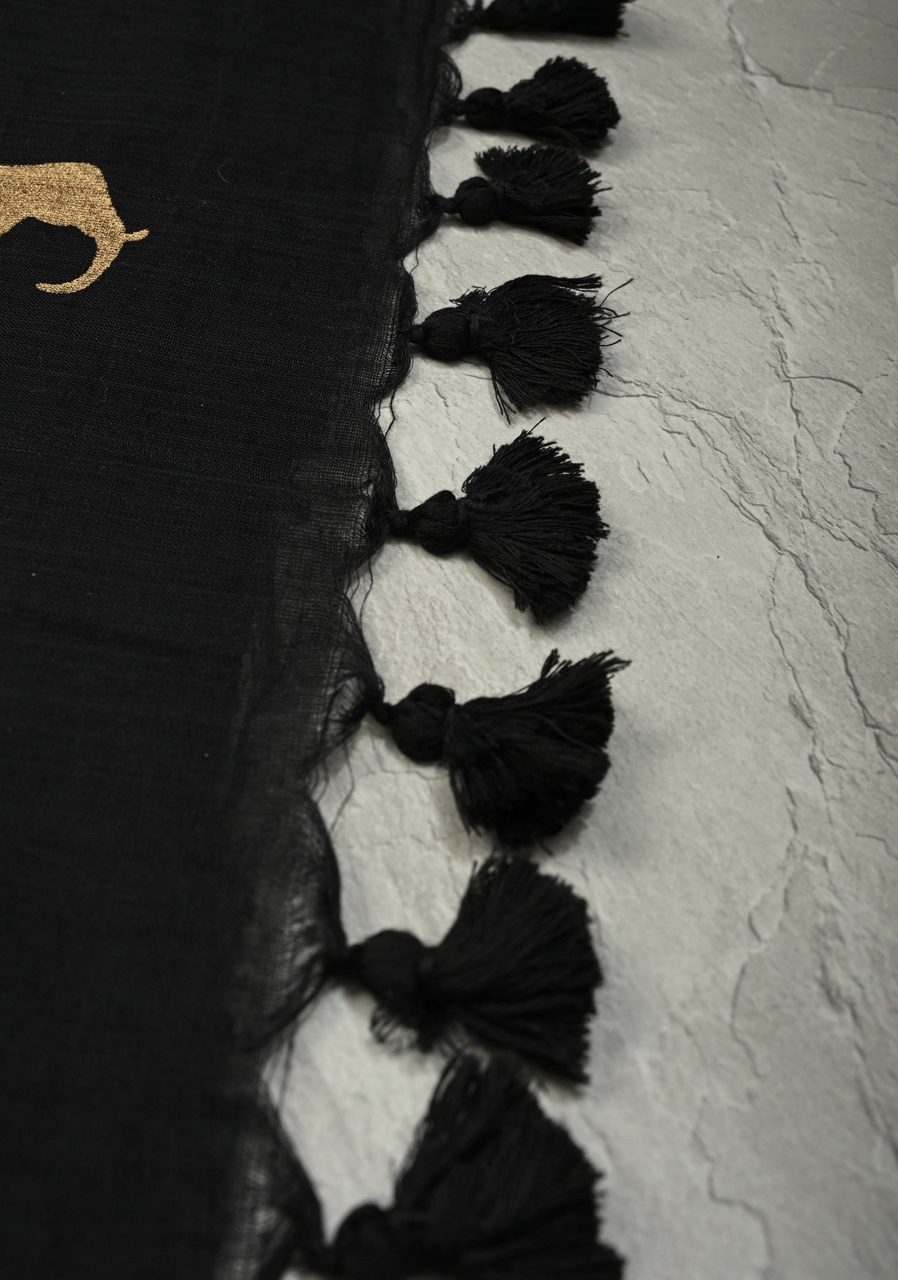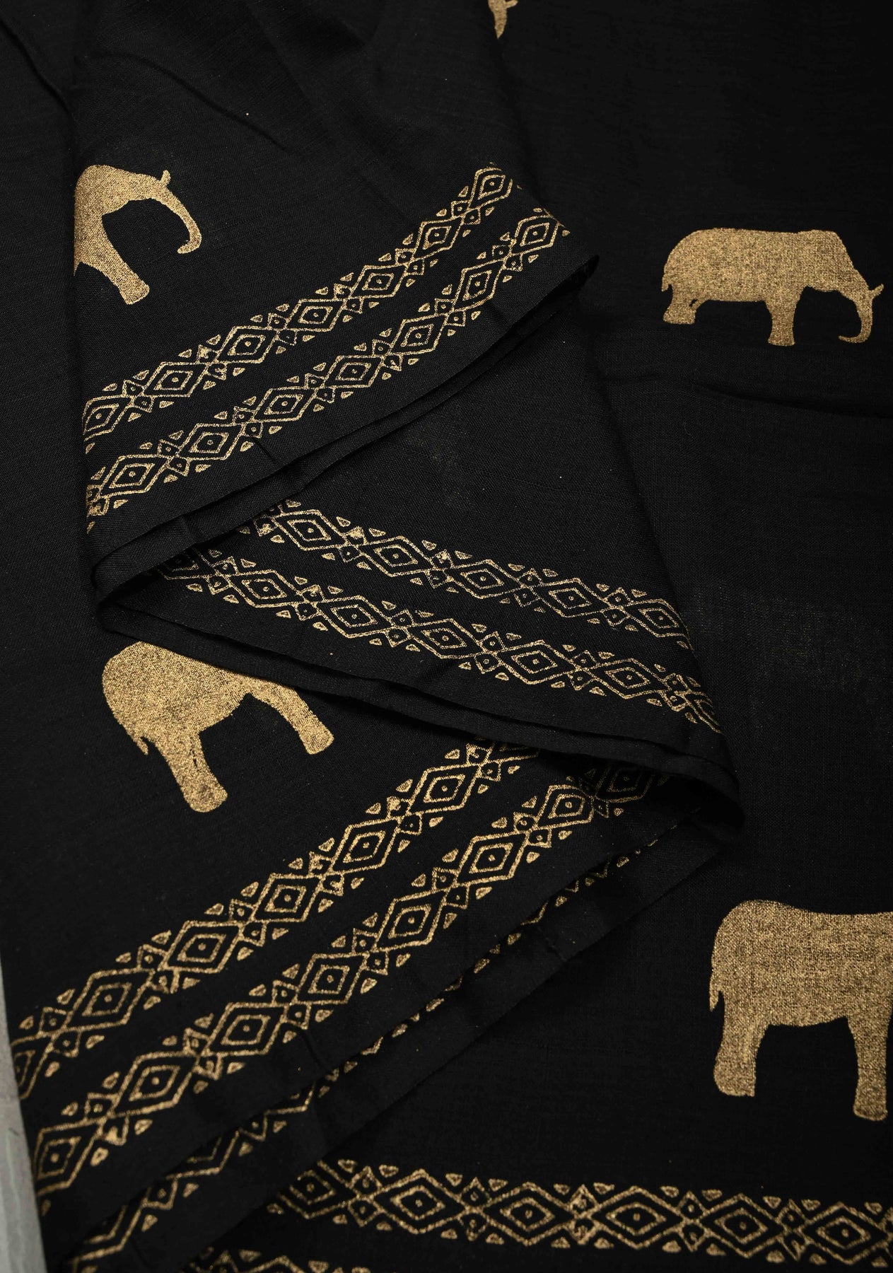Black Uppada Cotton Saree with Elephant Blcok Print Buttas and Minimal Border