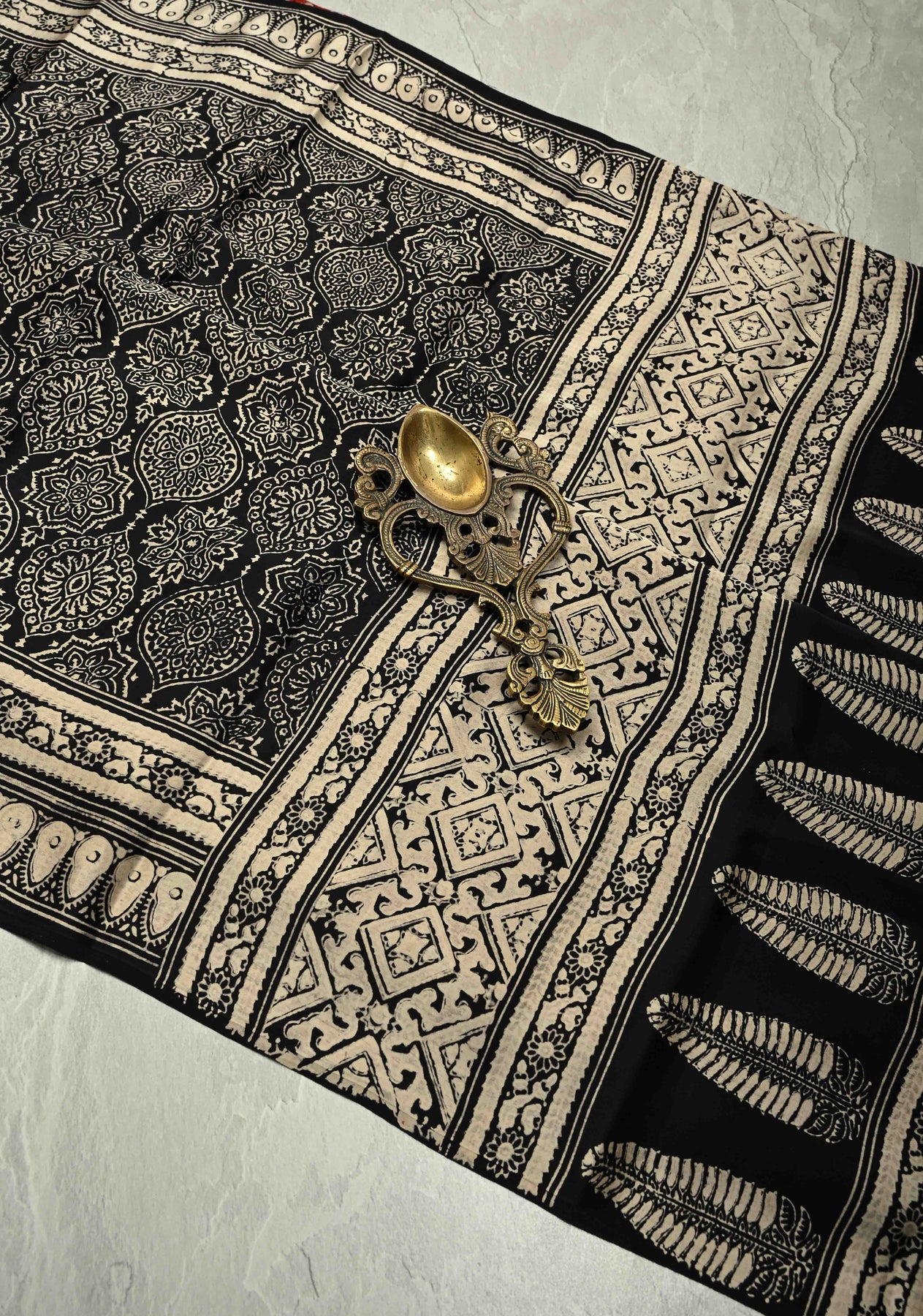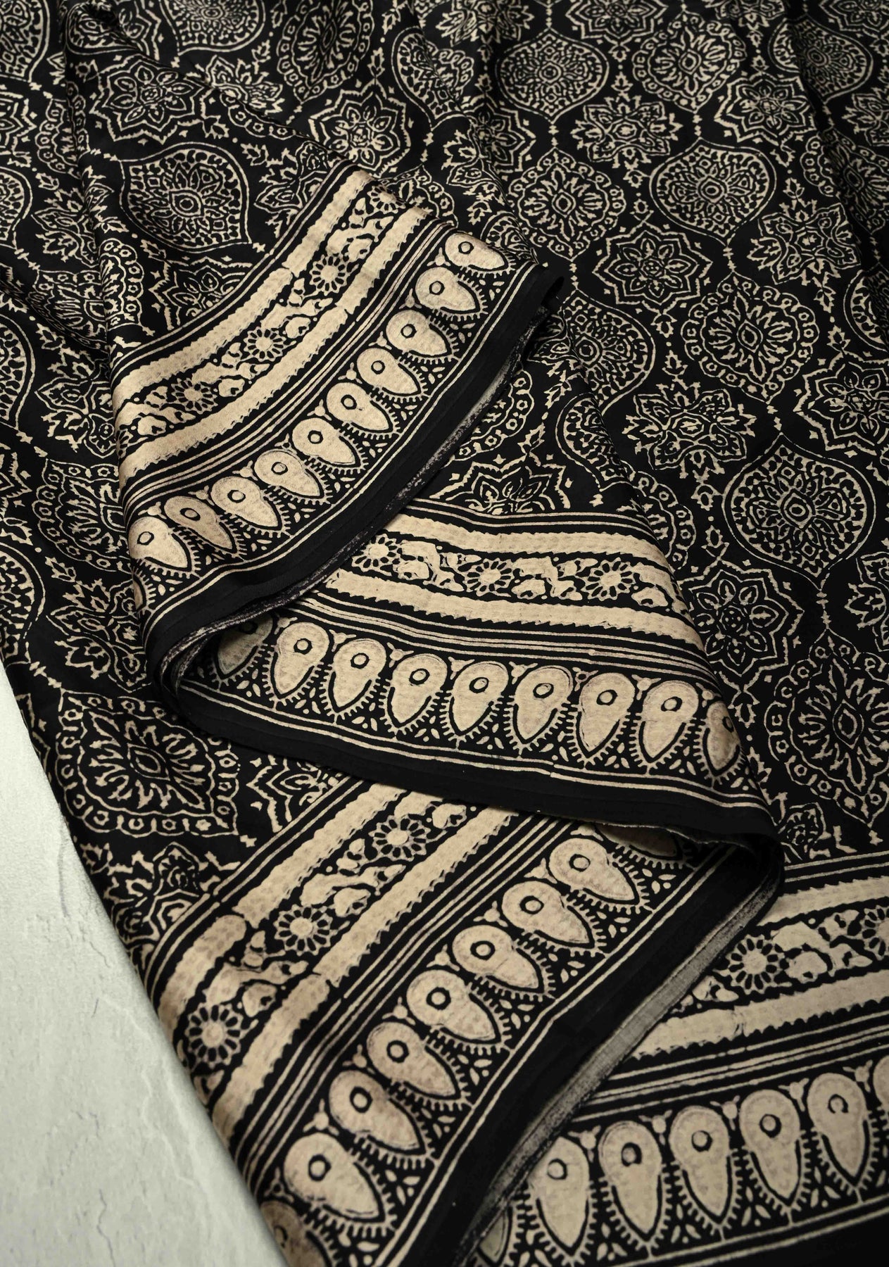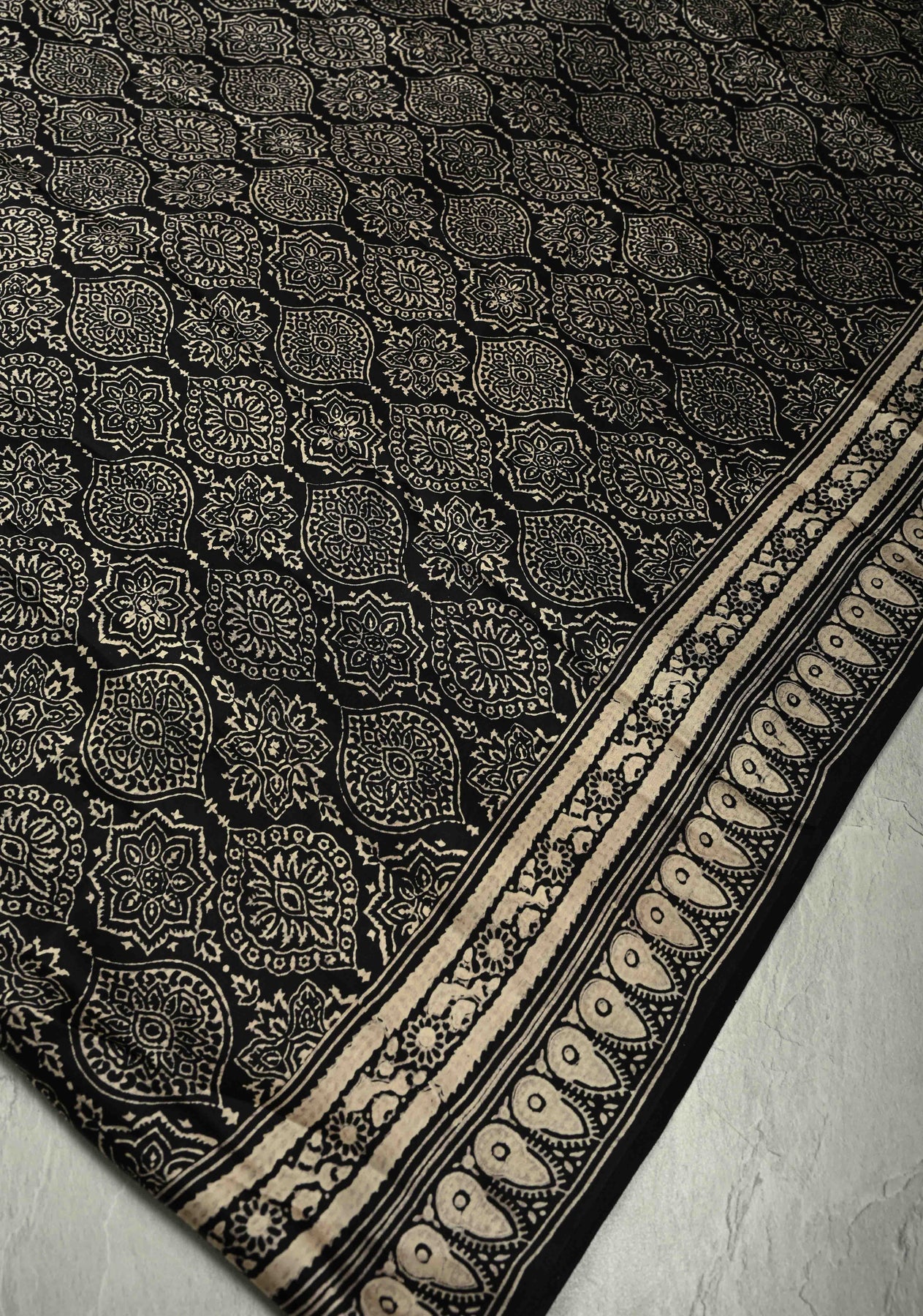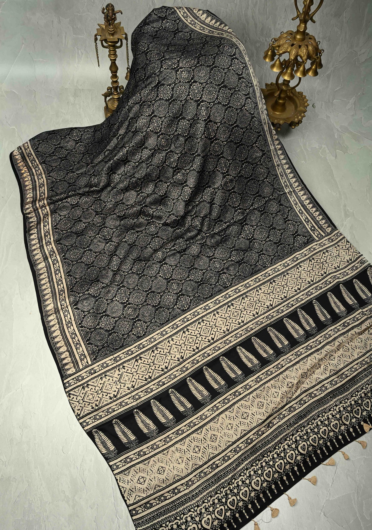 The monochrome Ajrakh patterns lend a timeless appeal, while the bold pallu adds a vibrant statement, beautifully balancing tradition with contemporary style. Perfect for festive occasions, cultural gatherings, office events, or sophisticated everyday wear, this saree radiates artisanal grace.