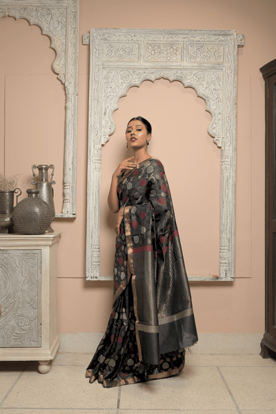 Black Muktakesha Spun Silk Saree with Meenakari Floral Brocade Jaal and Zari Border | SILK MARK CERTIFIED
