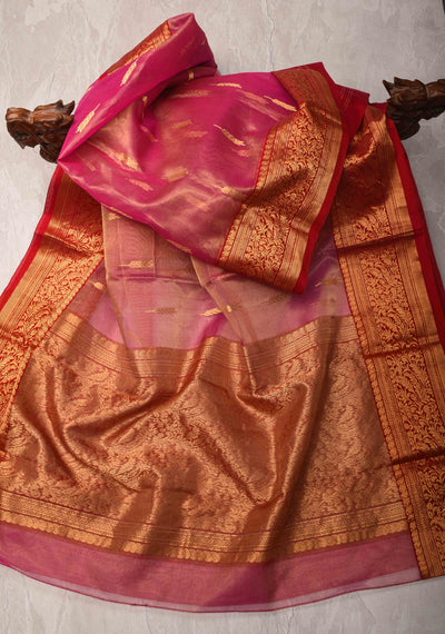 Pink Tissue Chanderi Silk Saree with Meenakari Buttas and Contrast Zari Borders