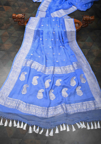 Pure Silk Chiffon Banarasi Saree in Light Blue with Silver Tone Zari Buttas & Zari Border | SILK MARK CERTIFIED