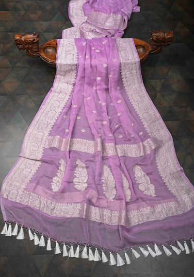 Lilac Pure Banarasi Silk Chiffon Saree with Floral Jaal and Border | SILK MARK CERTIFIED