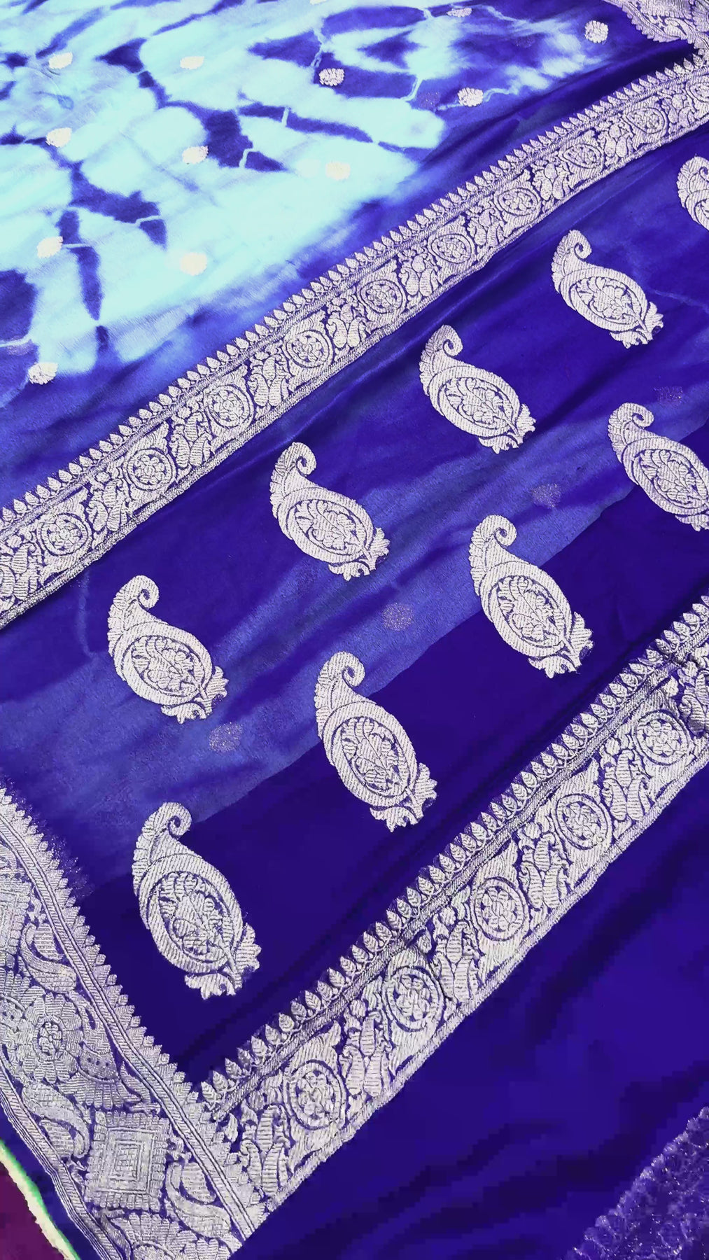 Experience the allure of tradition with a contemporary twist in this captivating Blue Banarasi Shibori Chiffon Silk Saree. Crafted from lightweight chiffon silk, the saree features a mesmerizing Shibori dye pattern, blending beautifully with the soft, flowing texture for a modern yet ethnic appeal.