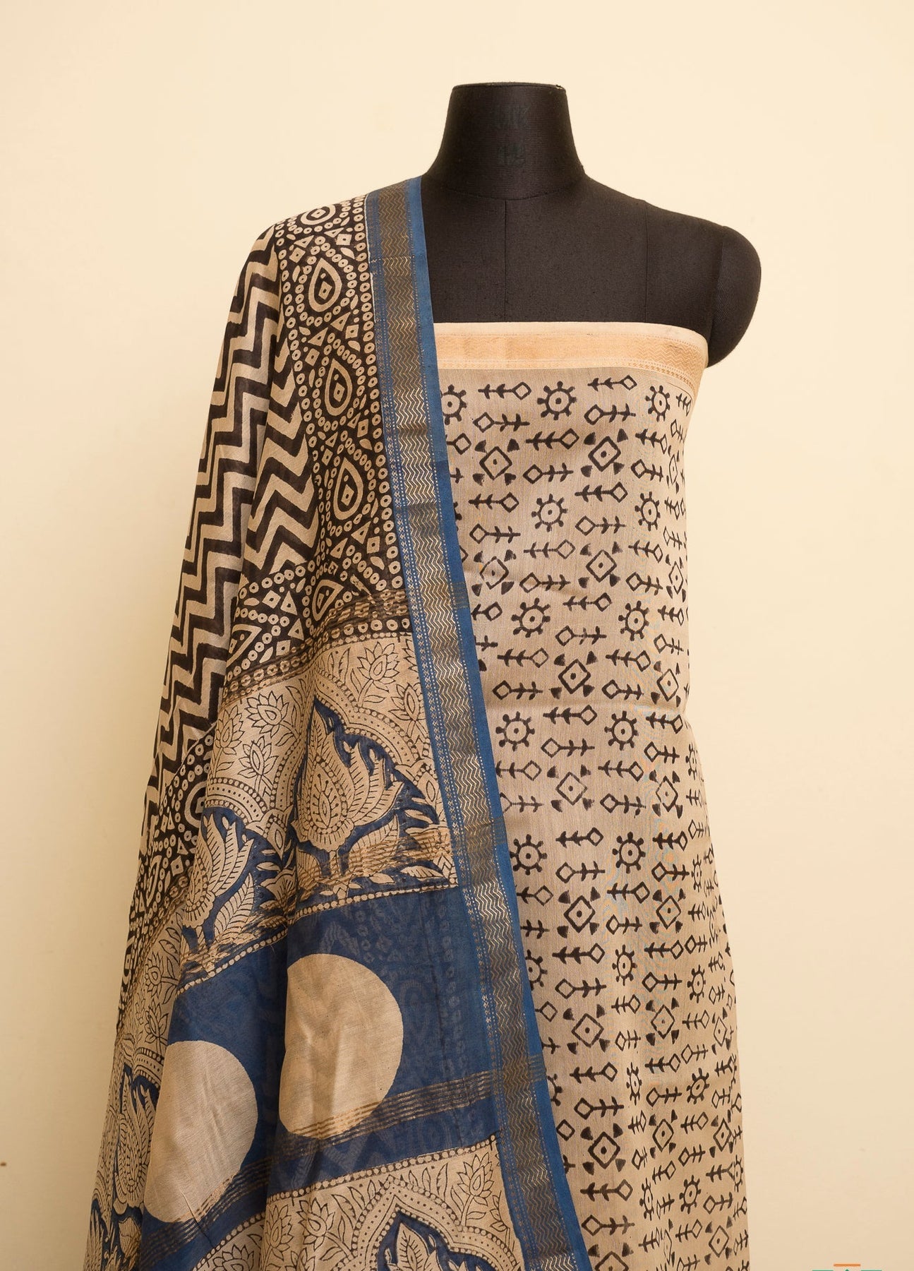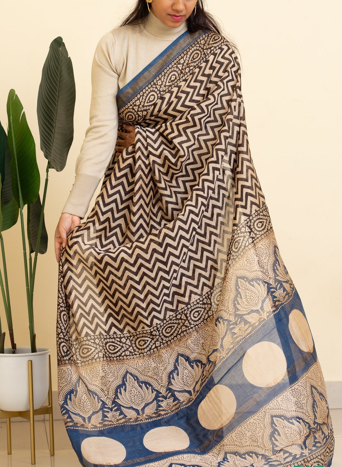 The classic white base paired with bold black accents creates a timeless palette that is both formal and versatile. The blue selvedge adds a subtle contemporary edge, elevating the saree without overpowering its simplicity.