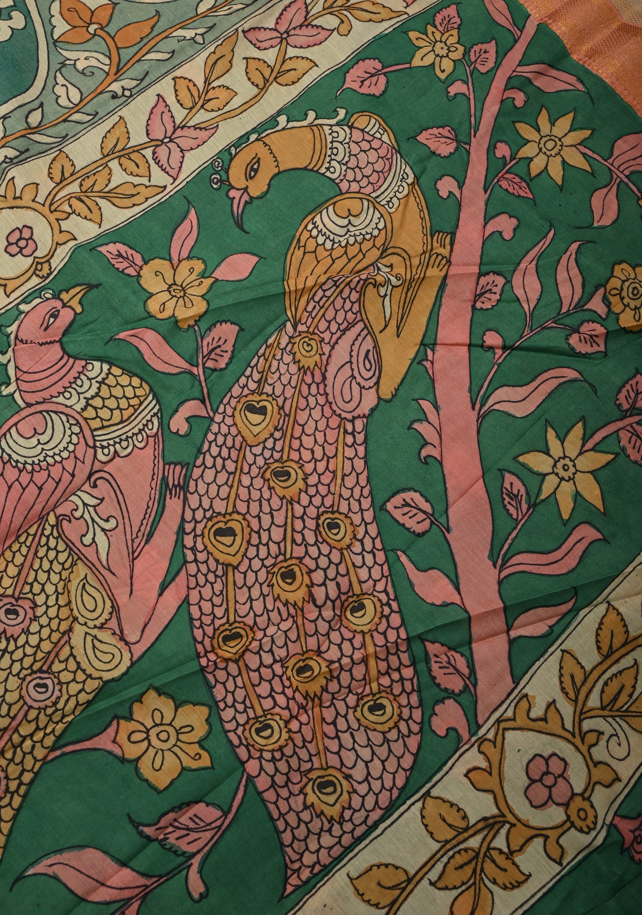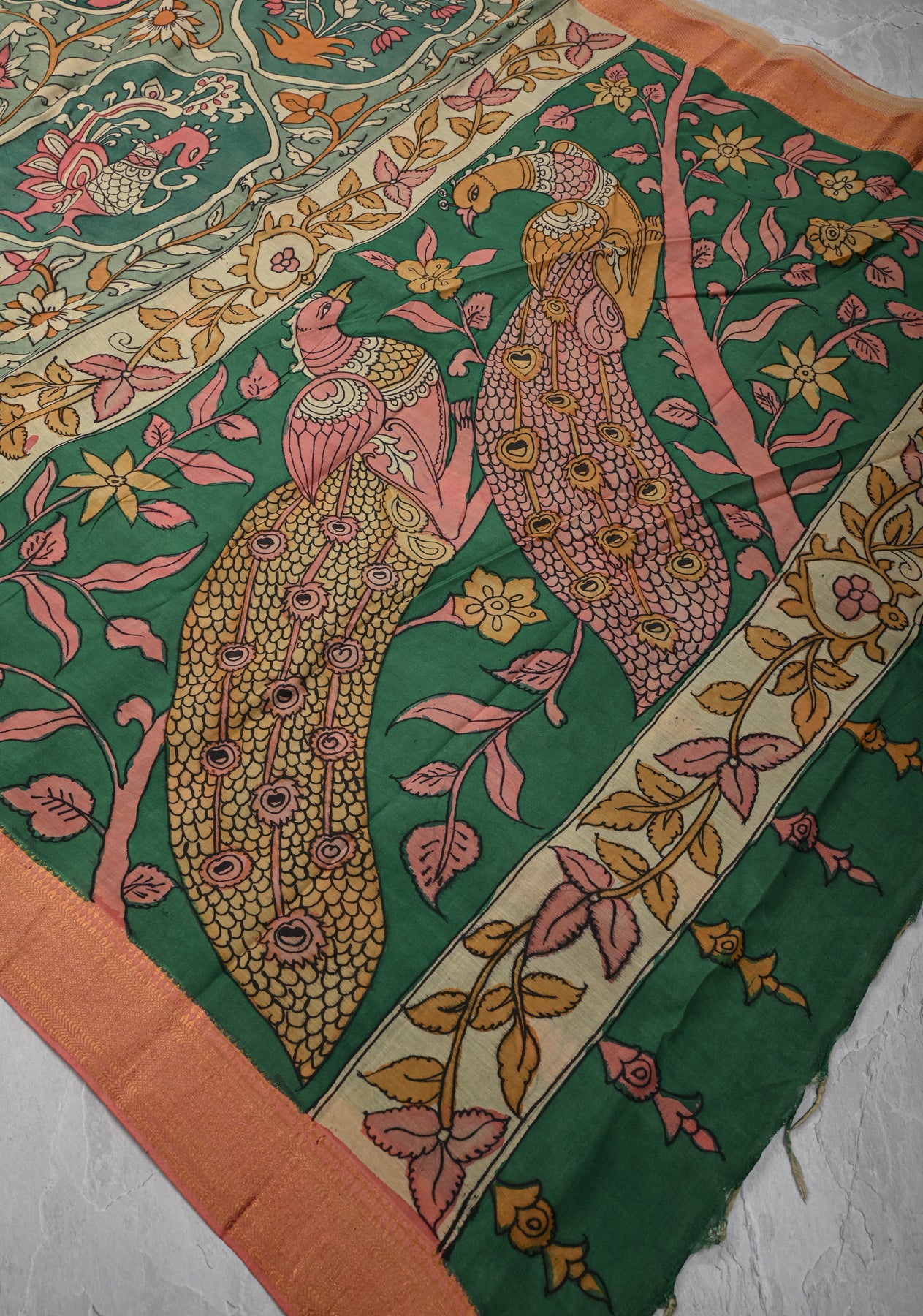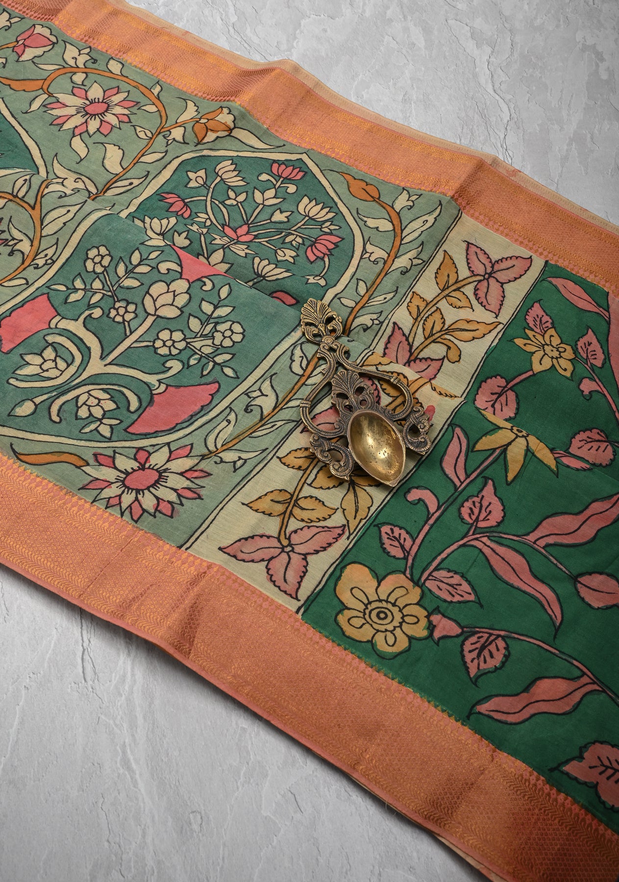 Floral Theme: Sage Green Authentic Pen kalamkari on Mangalagiri Silk Cotton Saree with Zari Border
