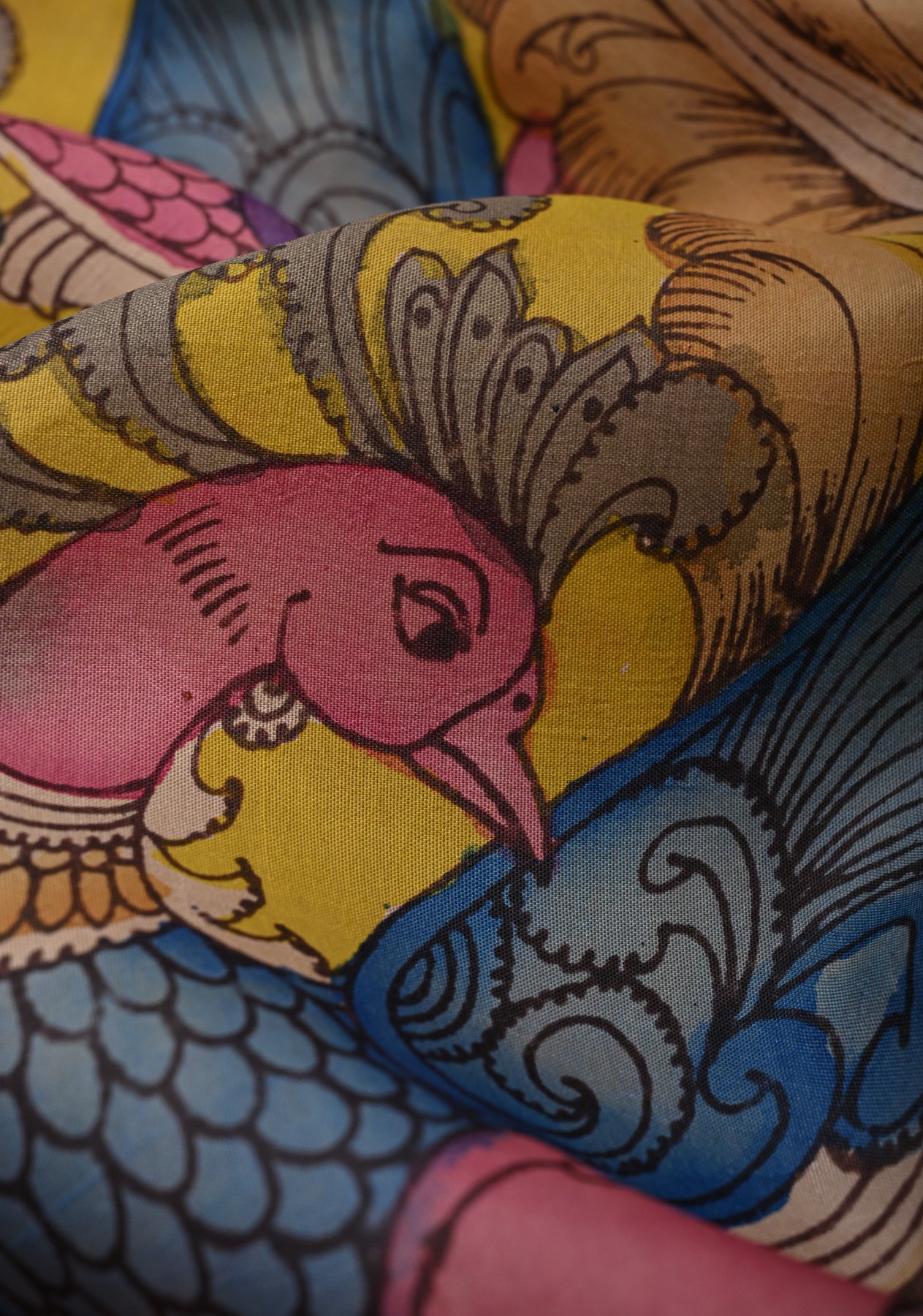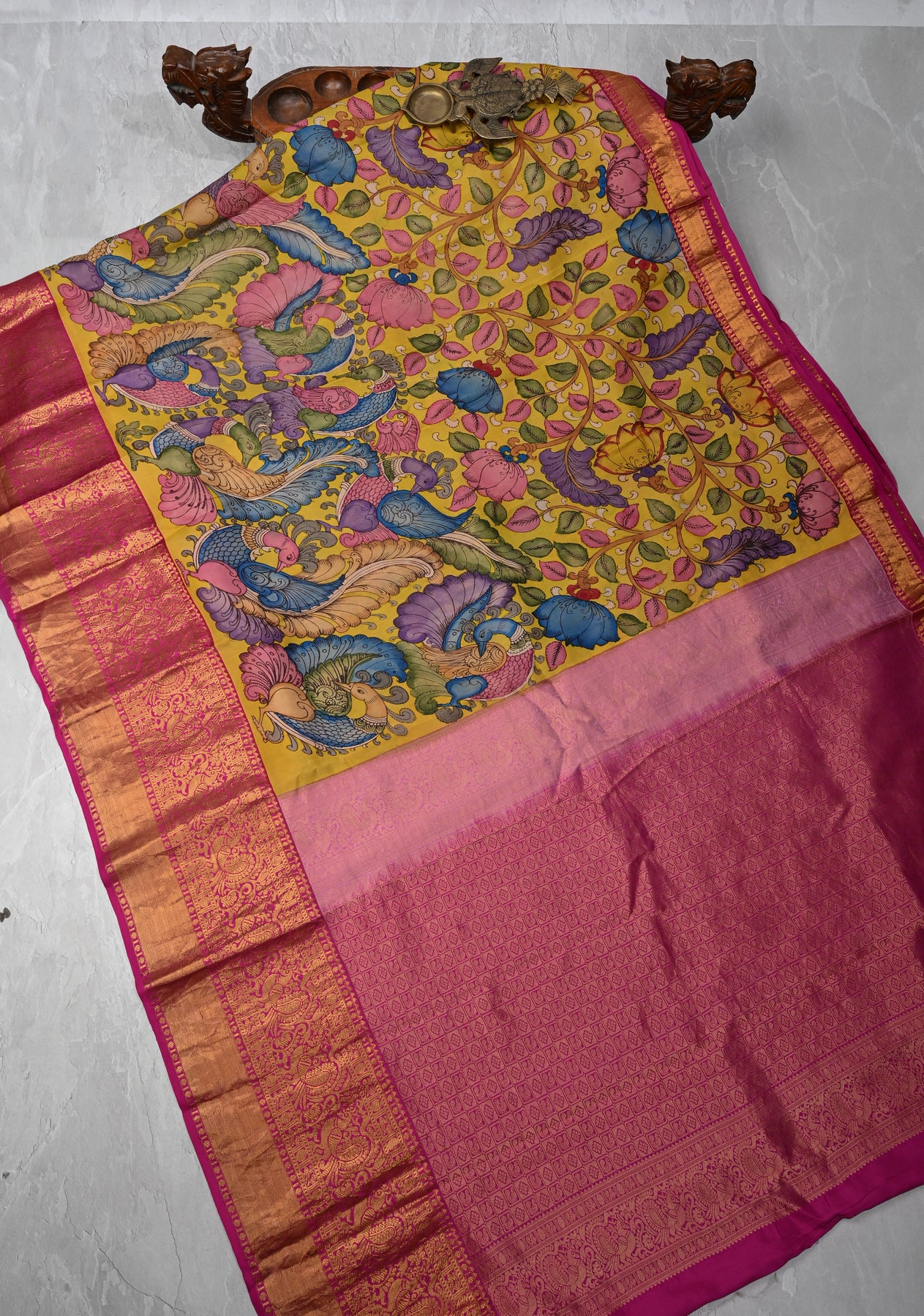 Radiating warmth and tradition, this Yellow Authentic Pen Kalamkari Kanjivaram Silk Saree is a striking statement of heritage artistry. The vibrant yellow base is beautifully hand-embellished with intricate pen kalamkari motifs, meticulously drawn using natural dyes that bring cultural stories to life. Crafted from luxurious Kanjivaram silk, the saree features a lustrous finish and is enhanced with an opulent zari border, adding grandeur to its timeless appeal. Ideal for festive occasions, weddings, and cultural events, this saree blends tradition, craftsmanship, and elegance in every drape