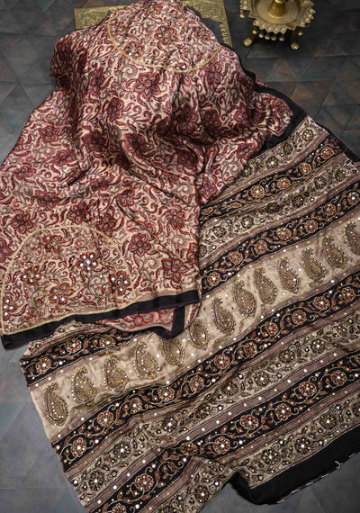 Maroon Modal Silk Saree with Ajrakh Hand Block Print, Sequins, Cutdana and Hand embroidery
