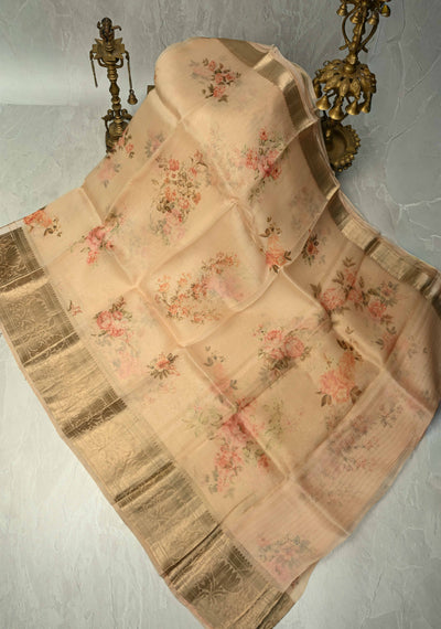 Pale Peach Pure Organza Silk Saree with Floral Digital Print and Zari Border | SILK MARK CERTIFIED