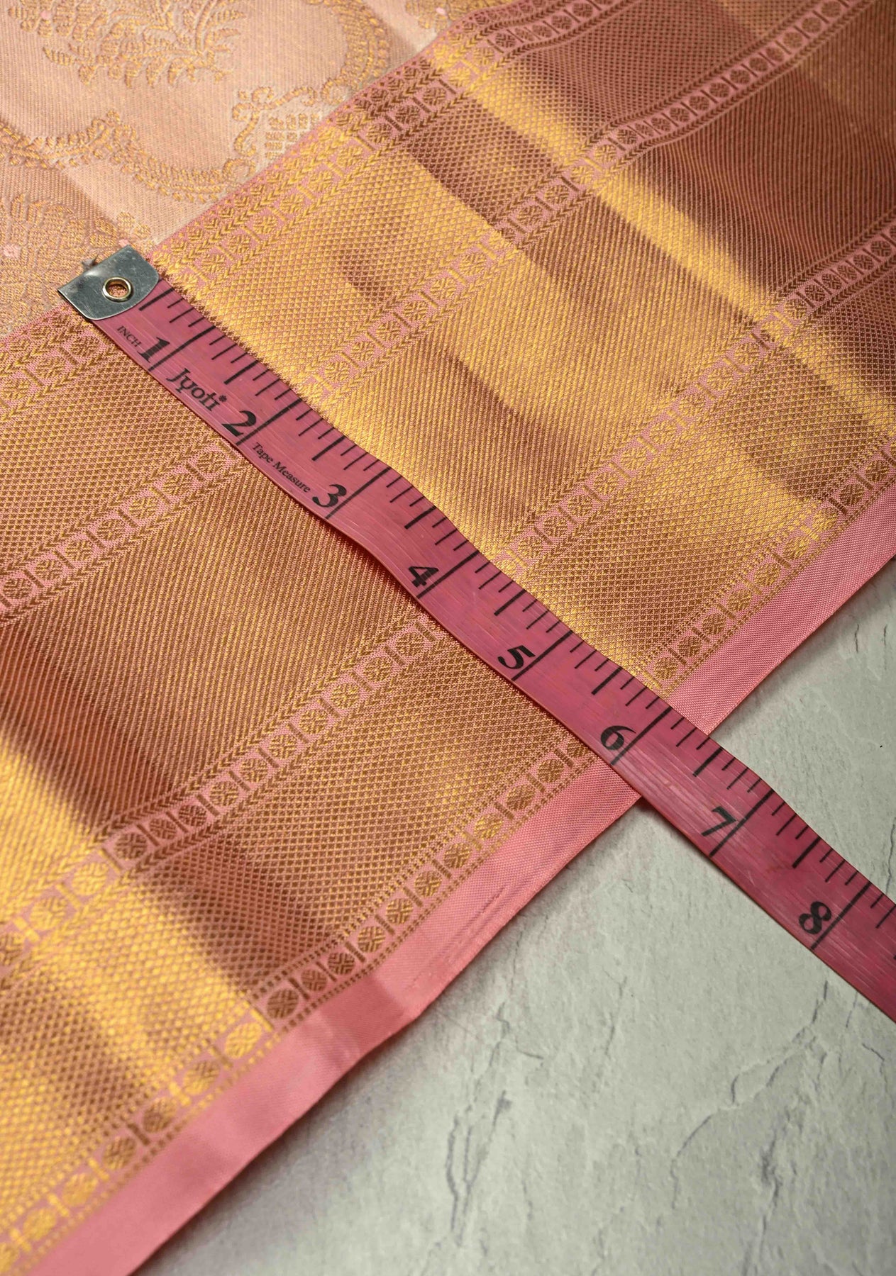 This delicate Blush Pink Kanjivaram Tissue Pure Silk Saree epitomizes elegance and timeless charm. Woven from fine Kanjivaram tissue silk, it features an intricate jaal design throughout, adding a subtle yet sophisticated texture to the fabric. The saree is enhanced with a lustrous zari border, which complements the soft blush pink hue and elevates its festive and ceremonial appeal. Lightweight, graceful, and luxurious, this saree is perfect for weddings, celebrations, and special occasions, combining classic Kanjivaram craftsmanship with modern elegance.