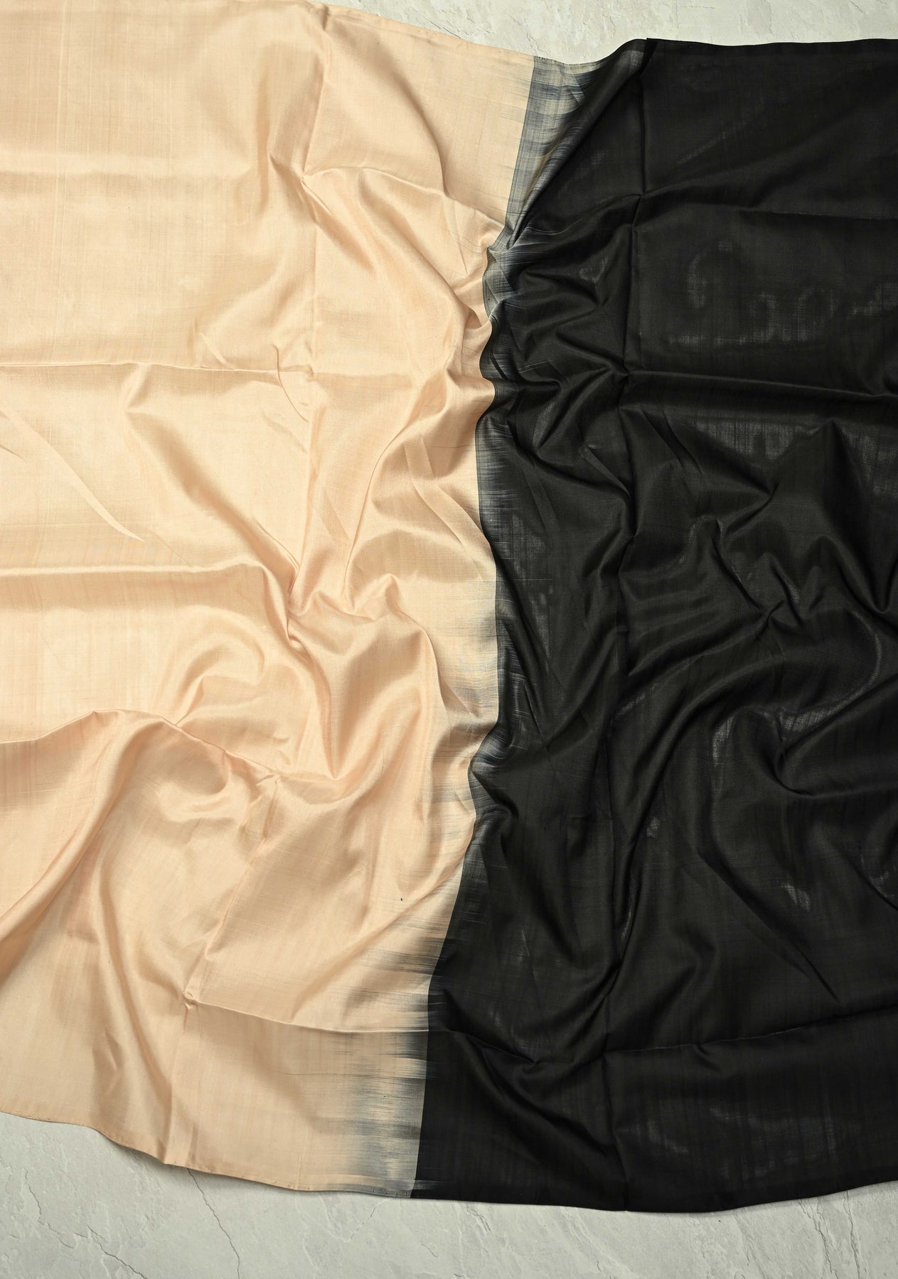 This sophisticated Borderless Off White-Black-Purple Uppada Handloom Pure Silk Saree is a stunning example of delicate South Indian weaving artistry. Handwoven from pure Uppada silk, the saree features a unique panel pattern in contrasting shades of black and purple against a serene off-white base, creating a visually striking and contemporary look. Its borderless design enhances its modern appeal while maintaining the lightweight elegance and soft drape characteristic of Uppada silk. Perfect for festive occasions, weddings, and formal gatherings, this saree is a blend of timeless craftsmanship and chic sophistication.