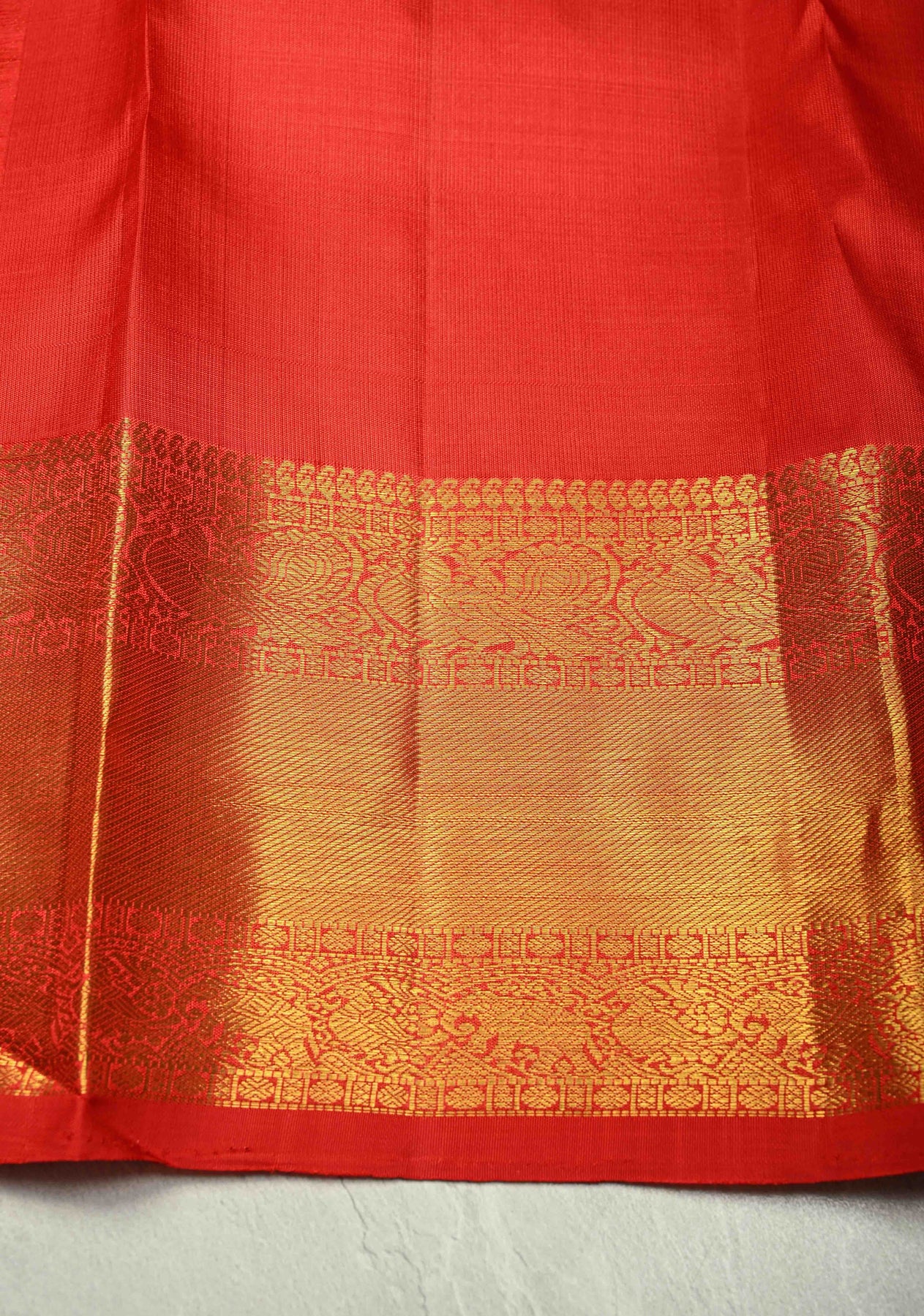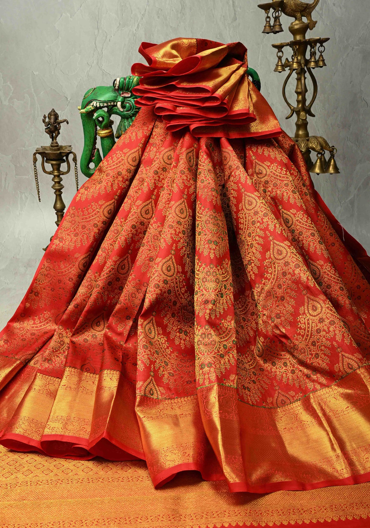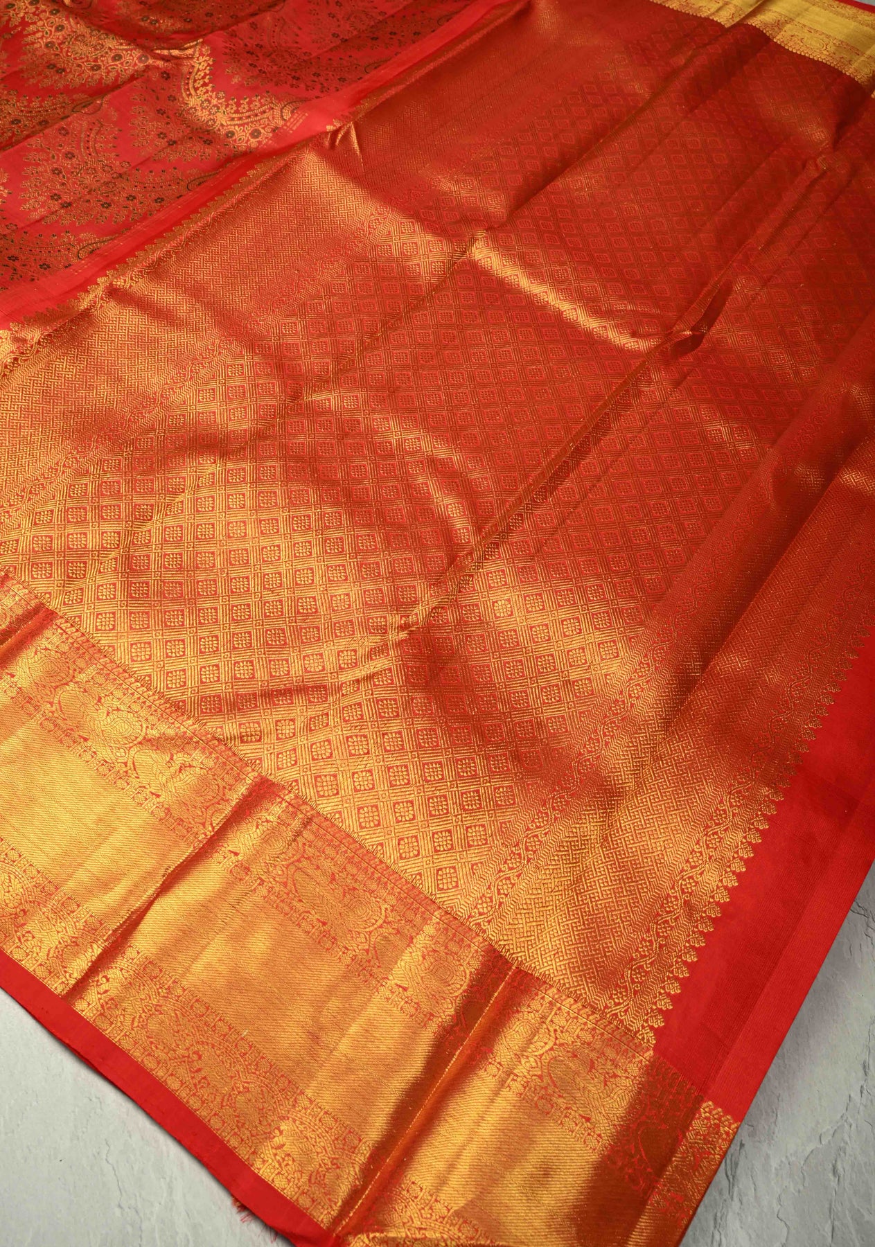 The vibrant bright red hue symbolizes prosperity and grace, while the gold zari border and pallu lend an aura of grandeur and opulence — making it a perfect choice for weddings, festive occasions, and grand celebrations. Its lustrous drape and luxurious texture embody the authentic elegance of the traditional Kanjivaram weave