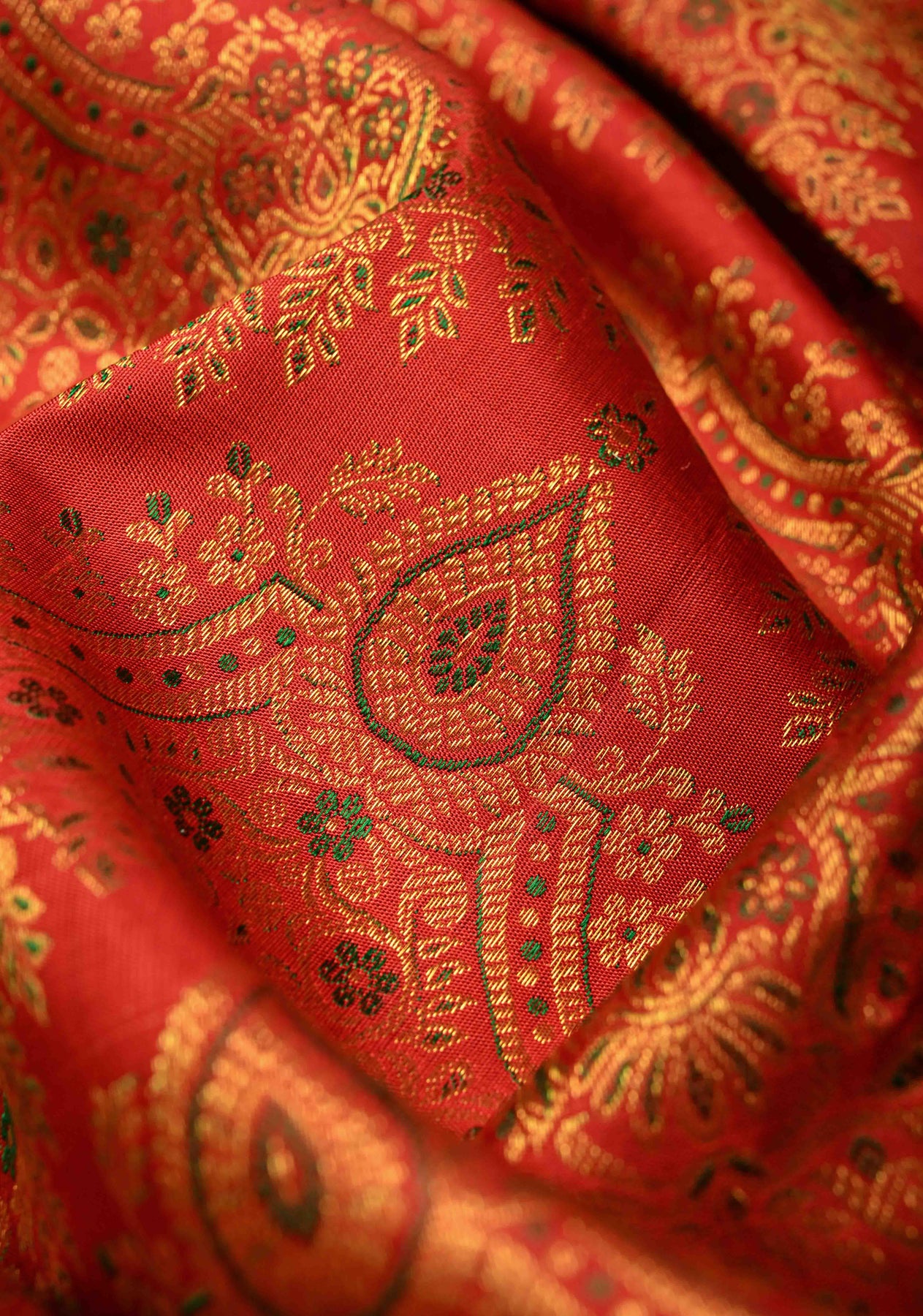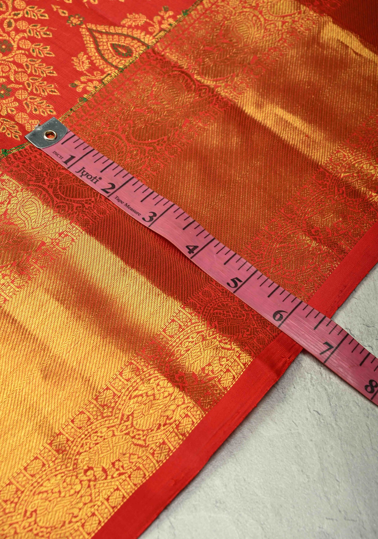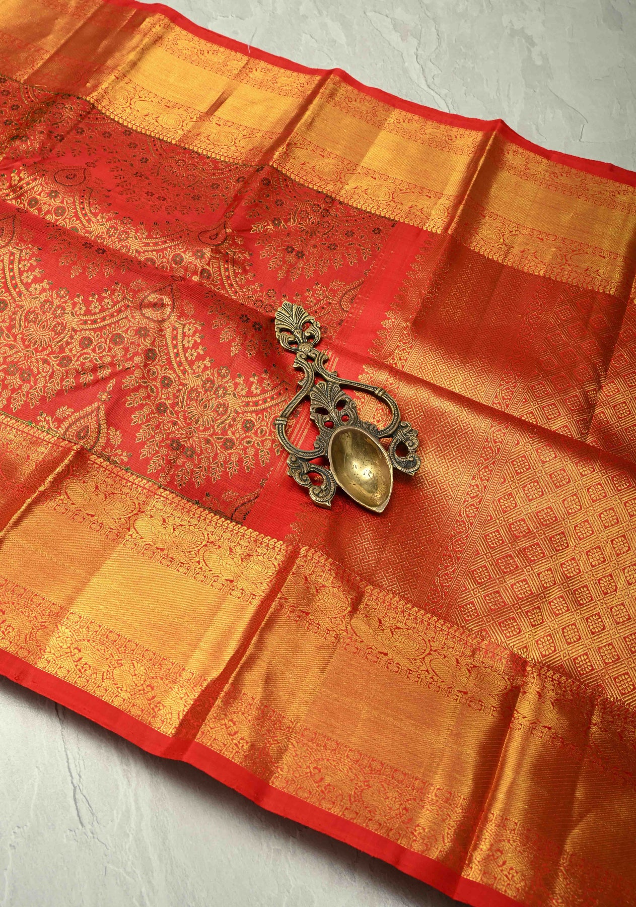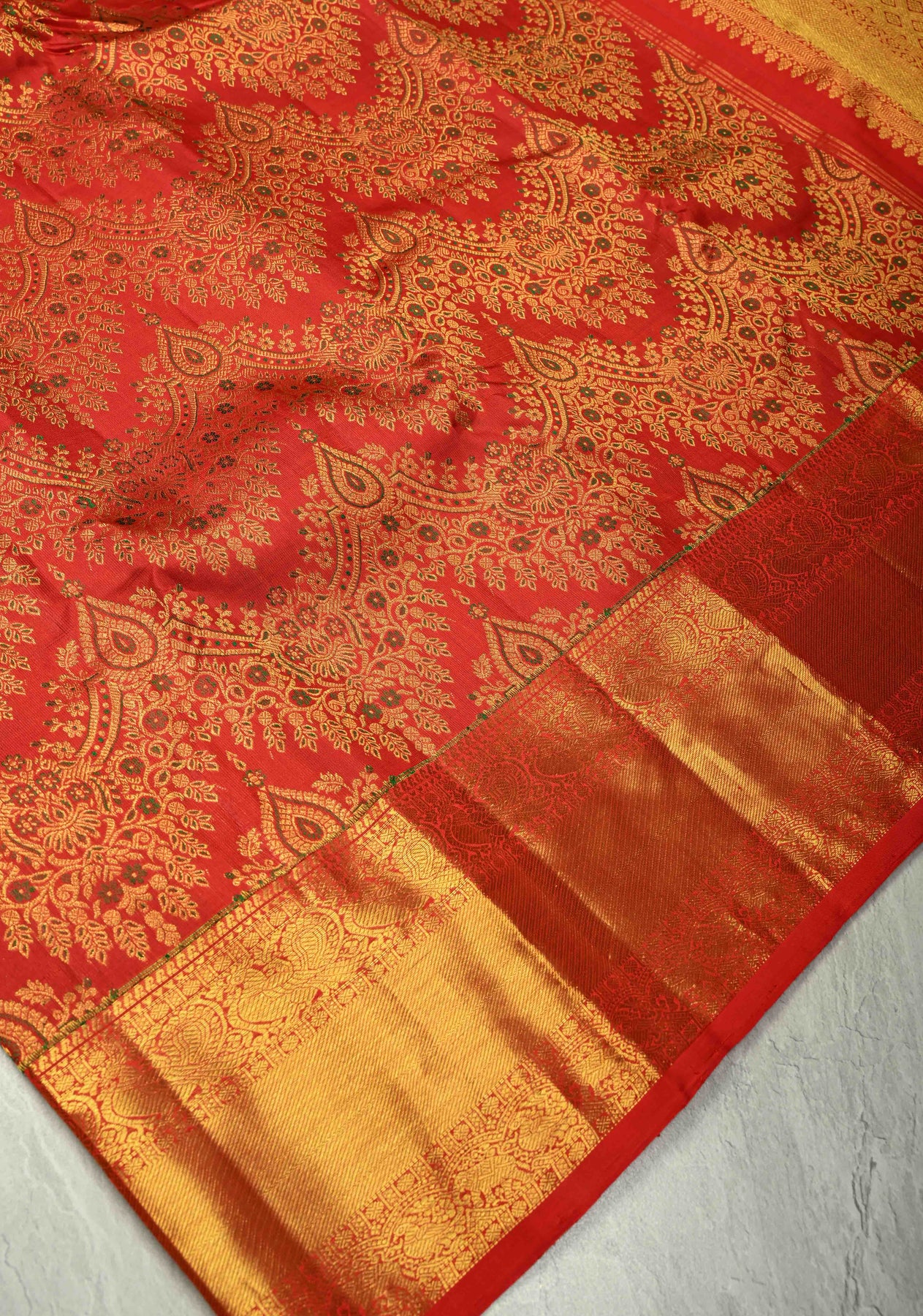 The vibrant bright red hue symbolizes prosperity and grace, while the gold zari border and pallu lend an aura of grandeur and opulence — making it a perfect choice for weddings, festive occasions, and grand celebrations. Its lustrous drape and luxurious texture embody the authentic elegance of the traditional Kanjivaram weave