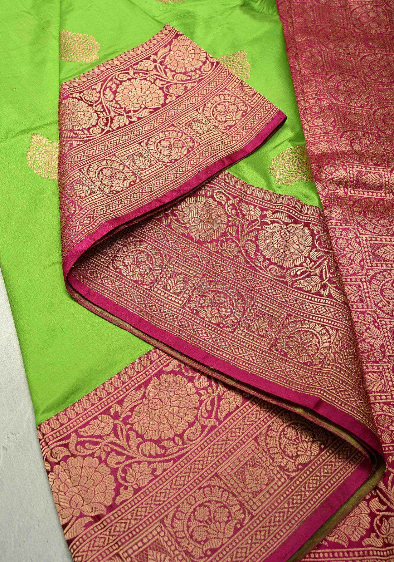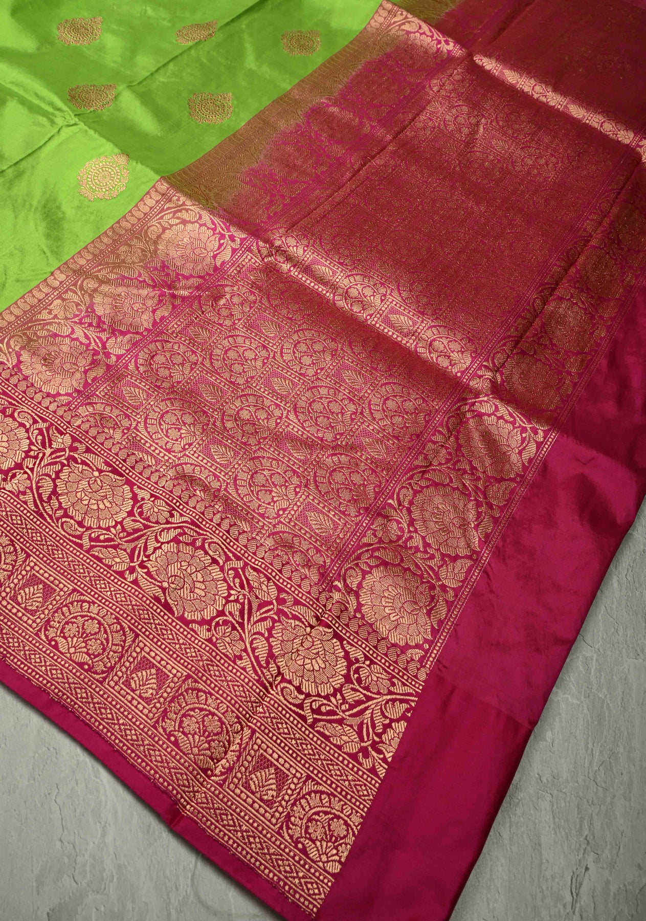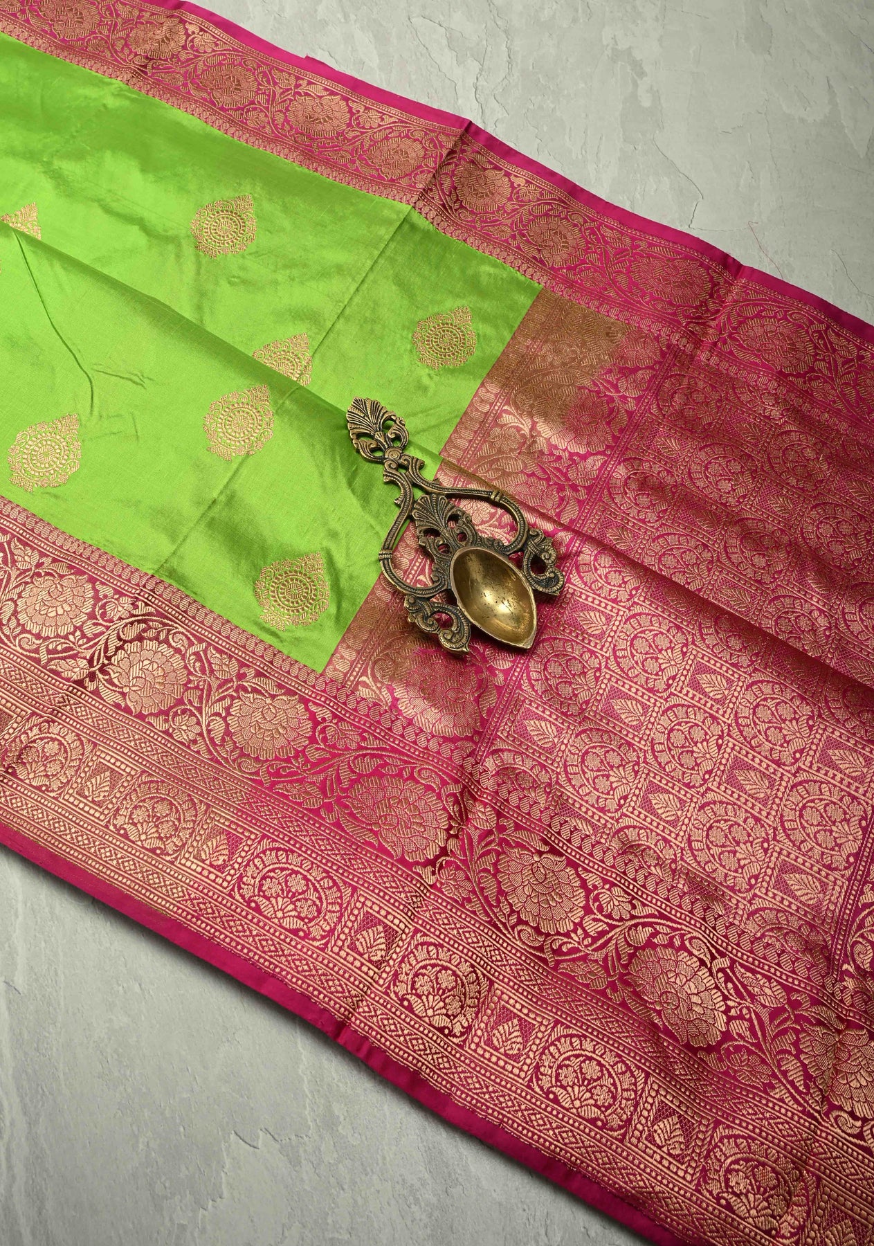 This Chartreuse Katan Silk Handloom Saree radiates vibrance and luxury, making it a perfect statement piece for festive and special occasions. Expertly handwoven in Katan silk, the saree features delicate zari buttas intricately woven across the body, showcasing the finesse of traditional craftsmanship. The striking contrast zari border enhances its brilliance, adding a regal touch to the contemporary neon hue. Lustrous, smooth, and lightweight, this saree beautifully balances tradition with modern elegance.