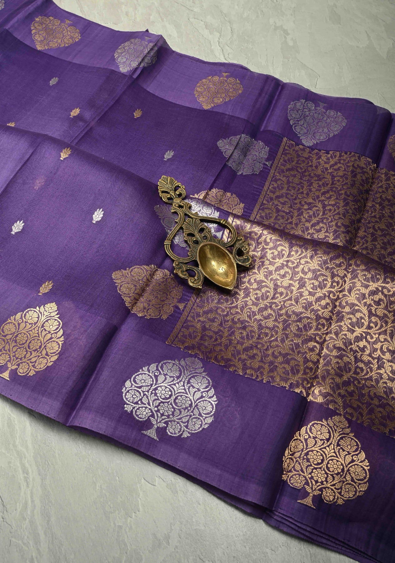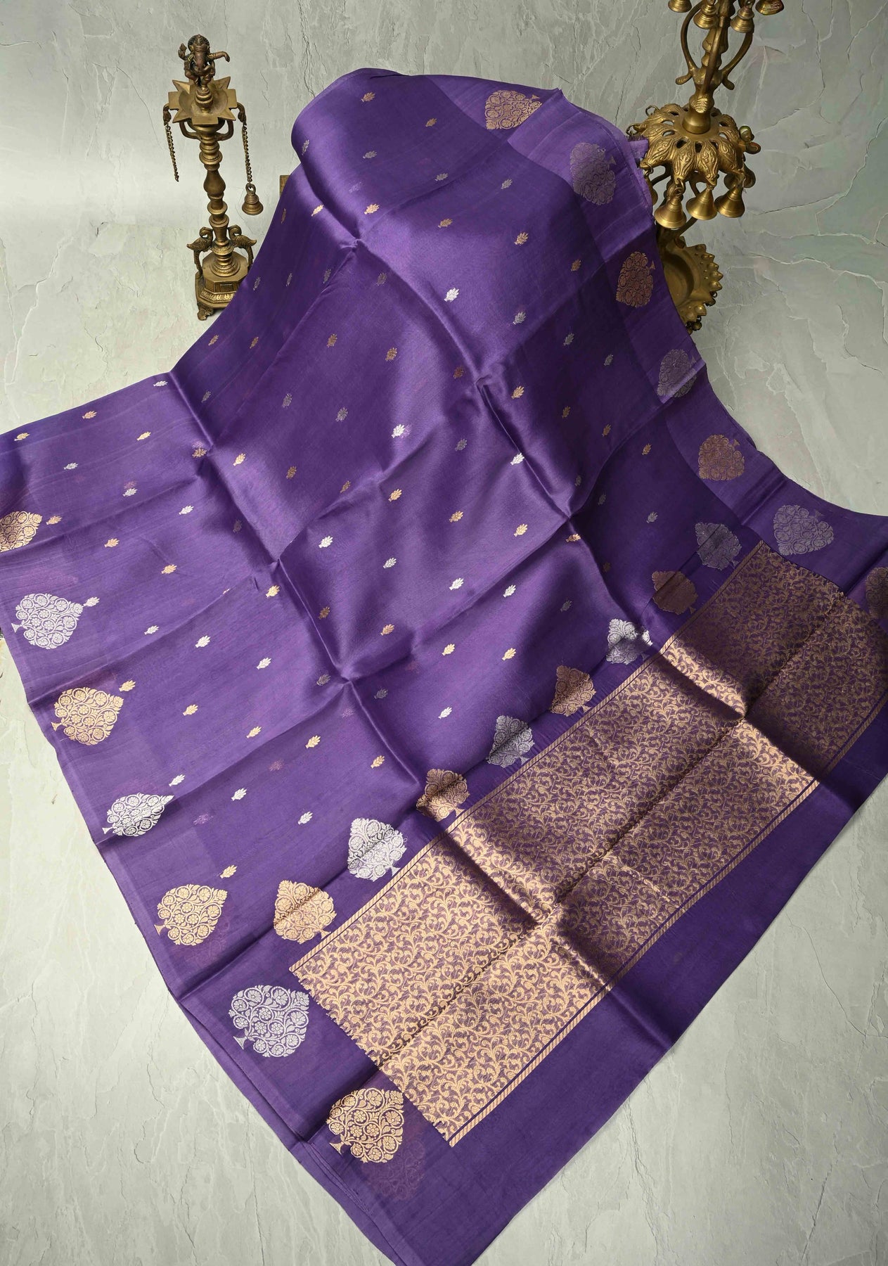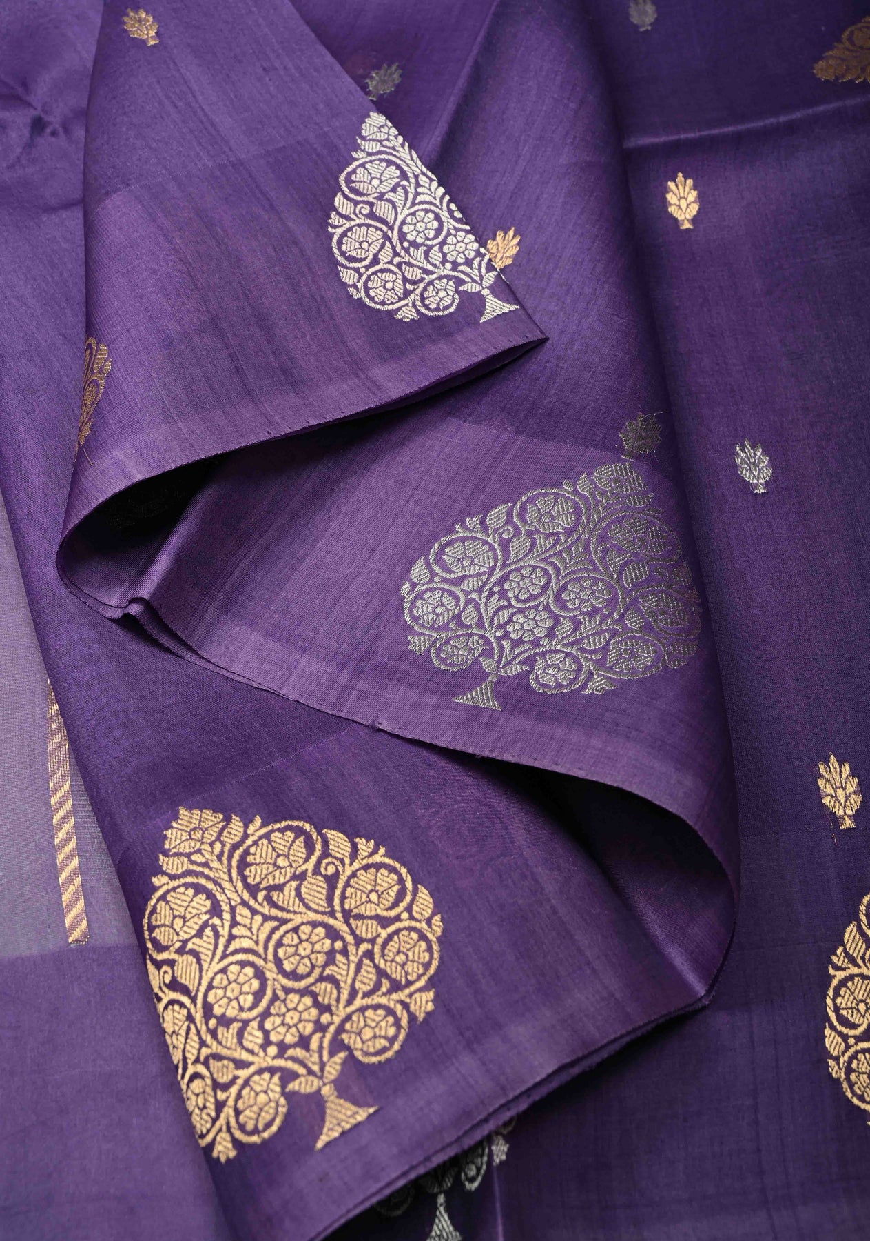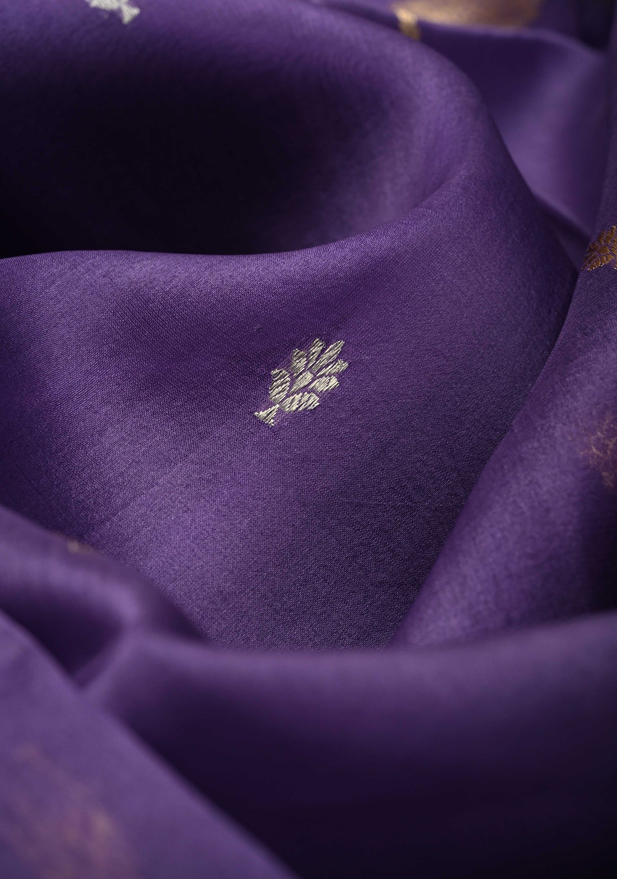 Dark Amethyst Pure Banarasi Organza Silk Saree with Sona Rupa Buttas and Distinct Floral Motifs | SILK MARK CERTIFIED