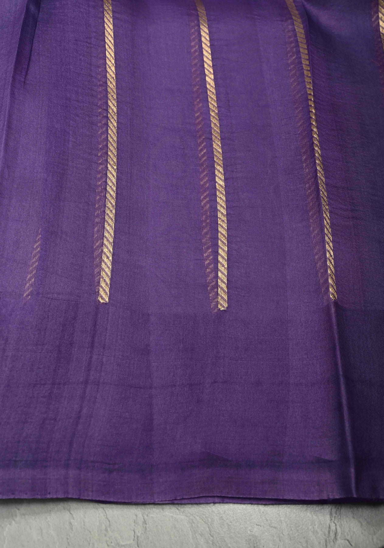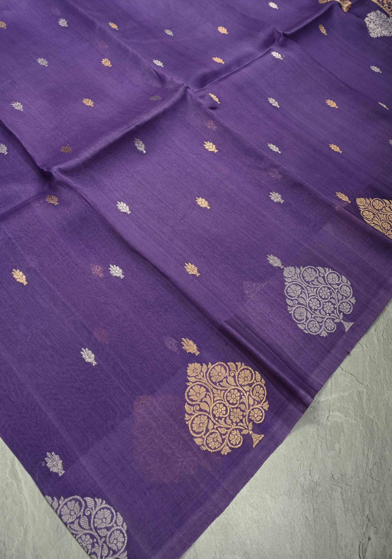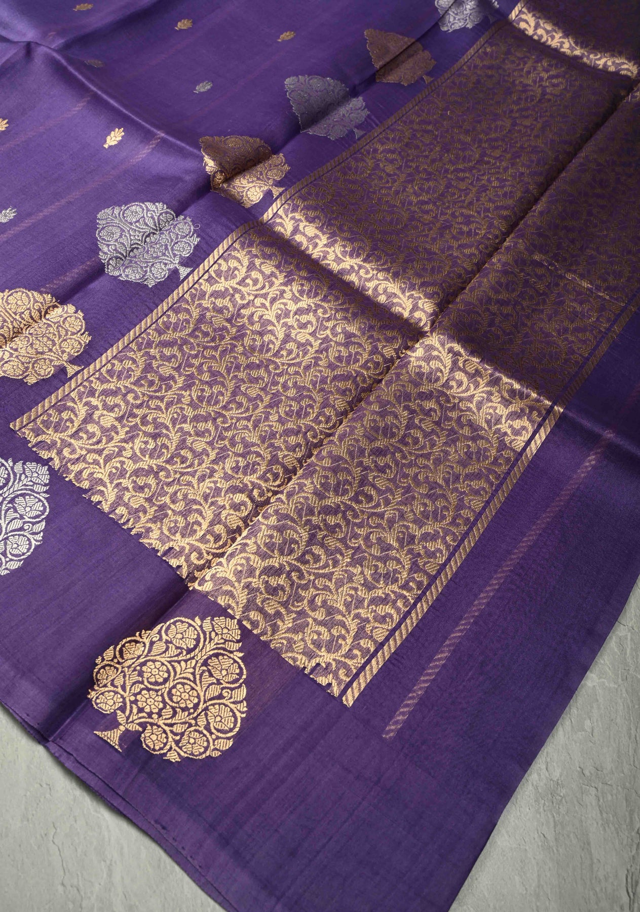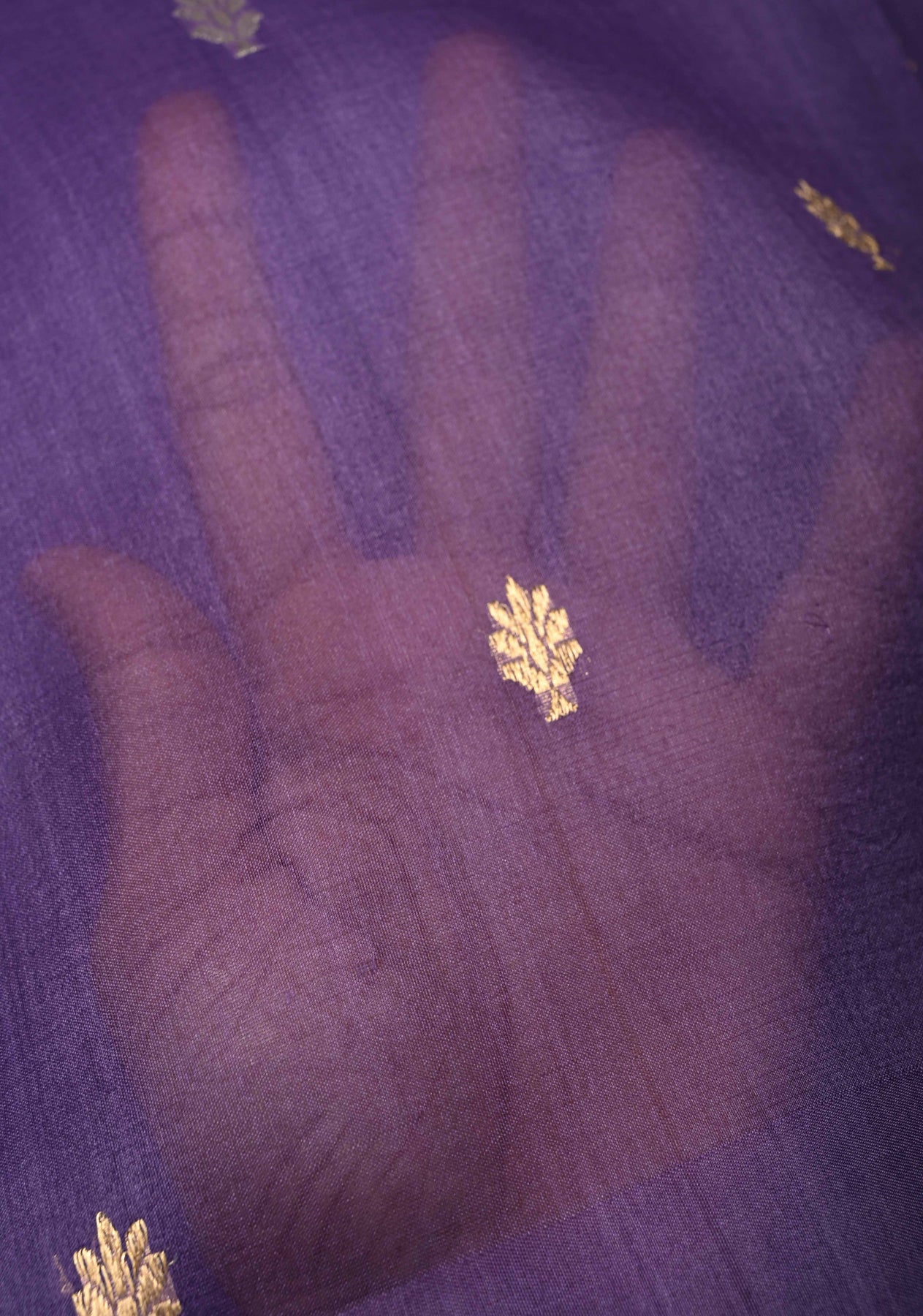 Dark Amethyst Pure Banarasi Organza Silk Saree with Sona Rupa Buttas and Distinct Floral Motifs | SILK MARK CERTIFIED