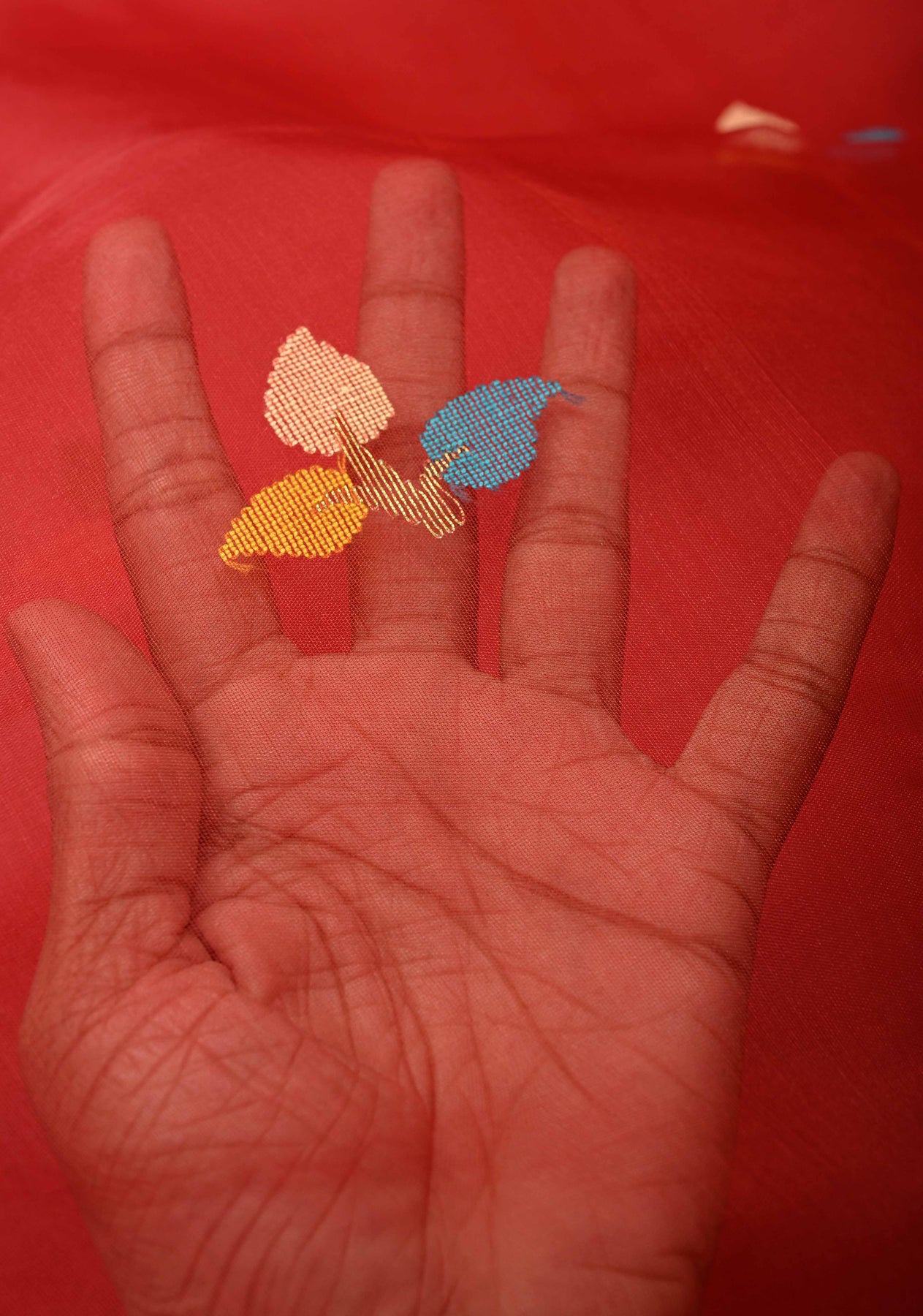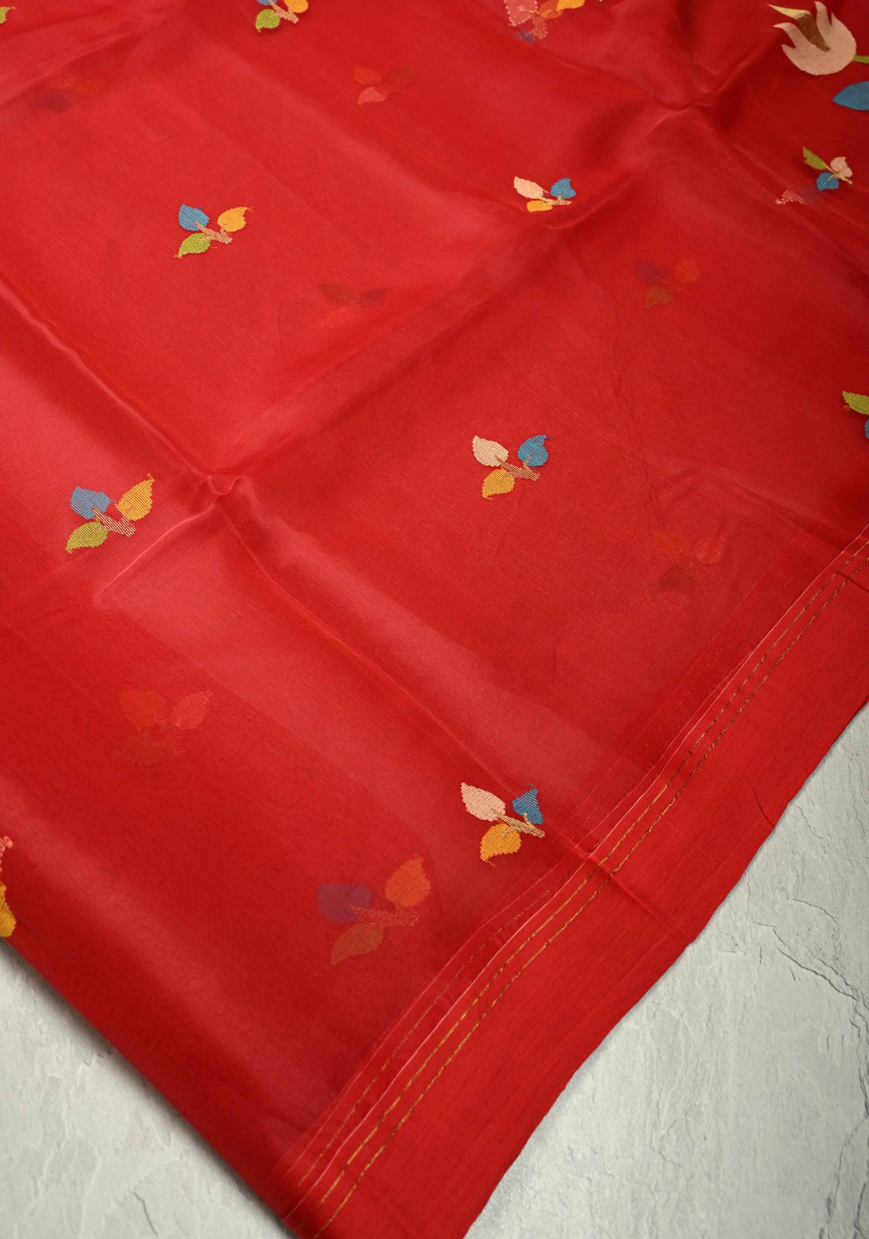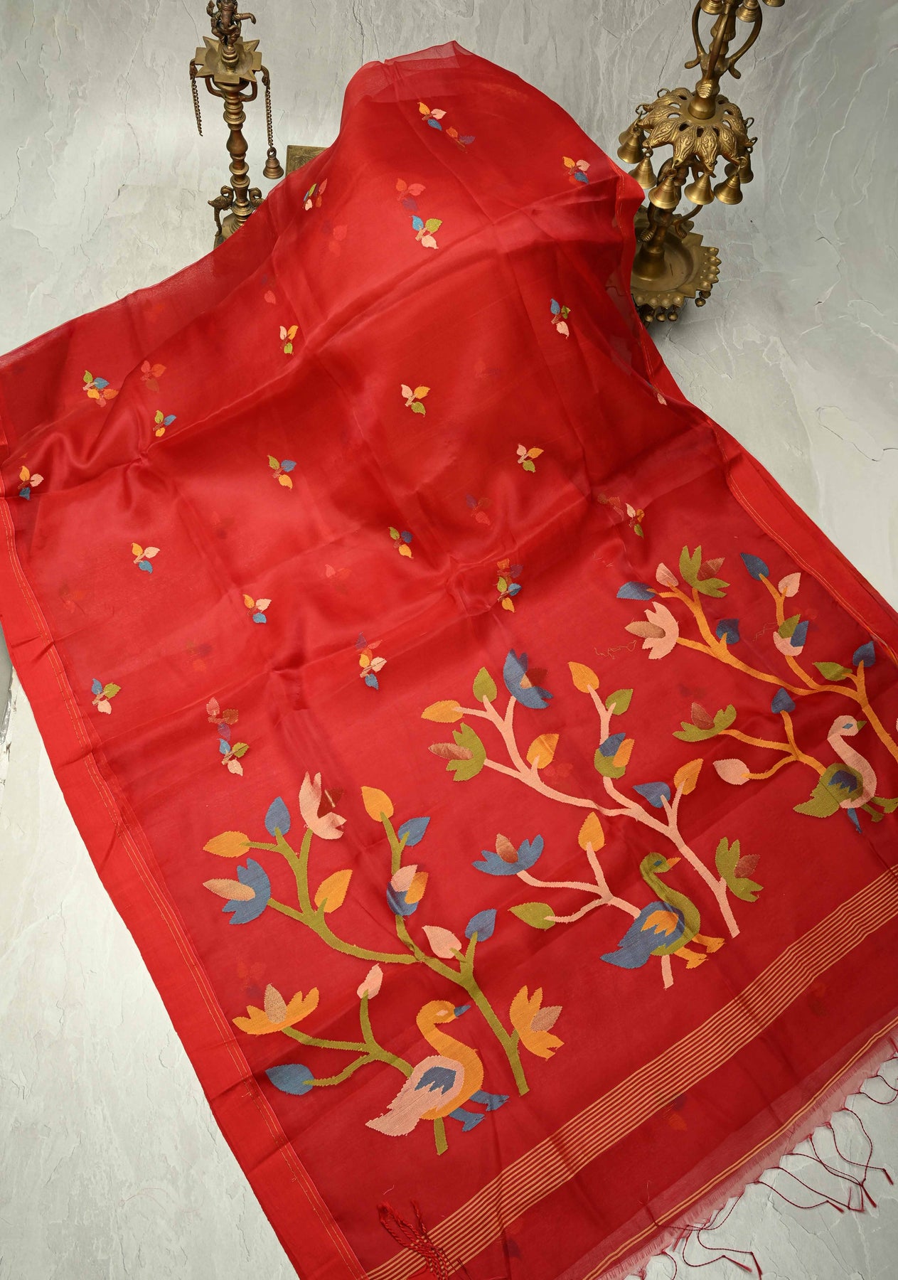 Radiate regal charm with this exquisite Deep Red Muslin Silk Saree, featuring intricate Meenakari design beautifully complemented by Resham Jamdani weaving. Handcrafted by skilled artisans, this saree is a true representation of traditional artistry and luxurious craftsmanship.