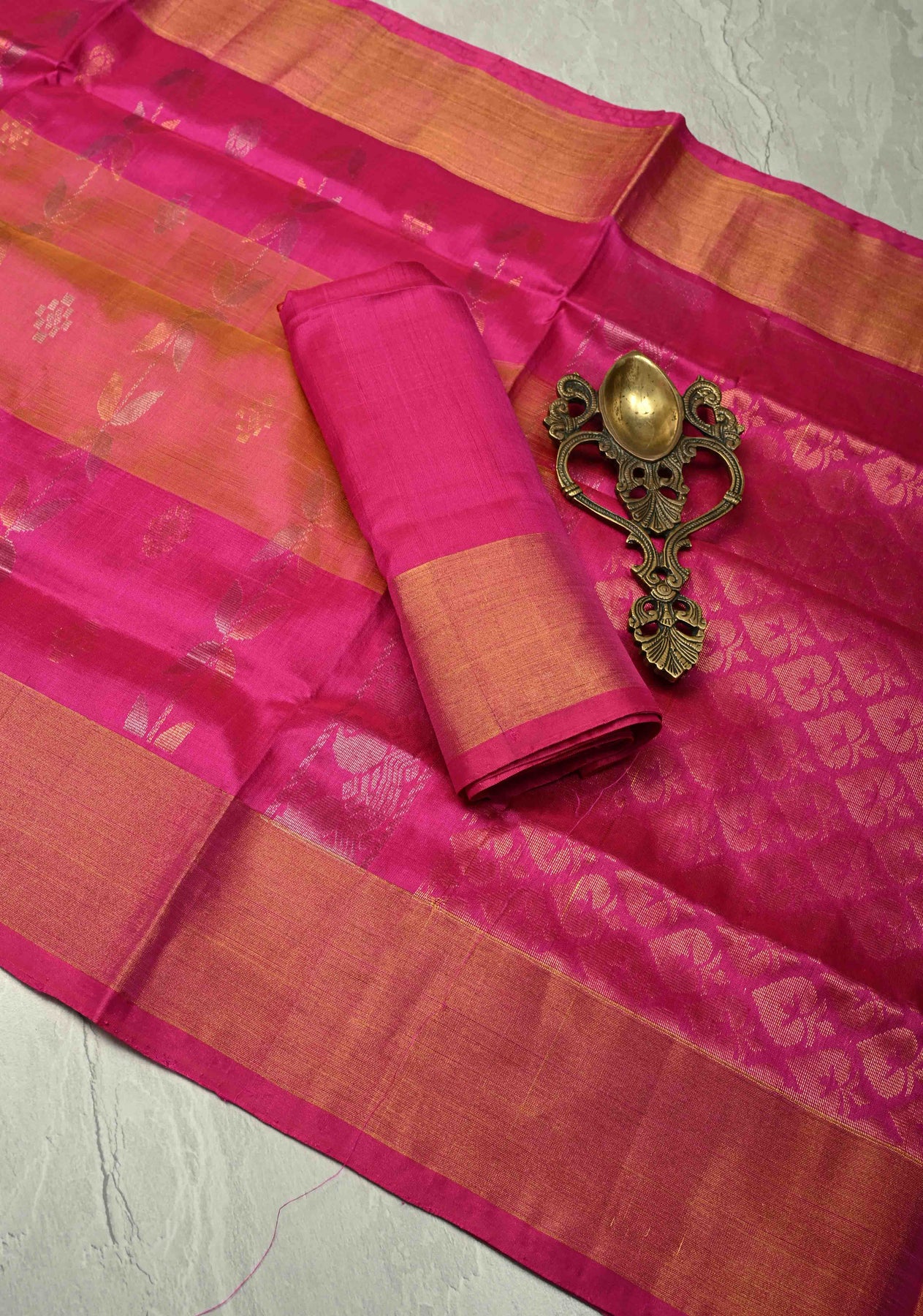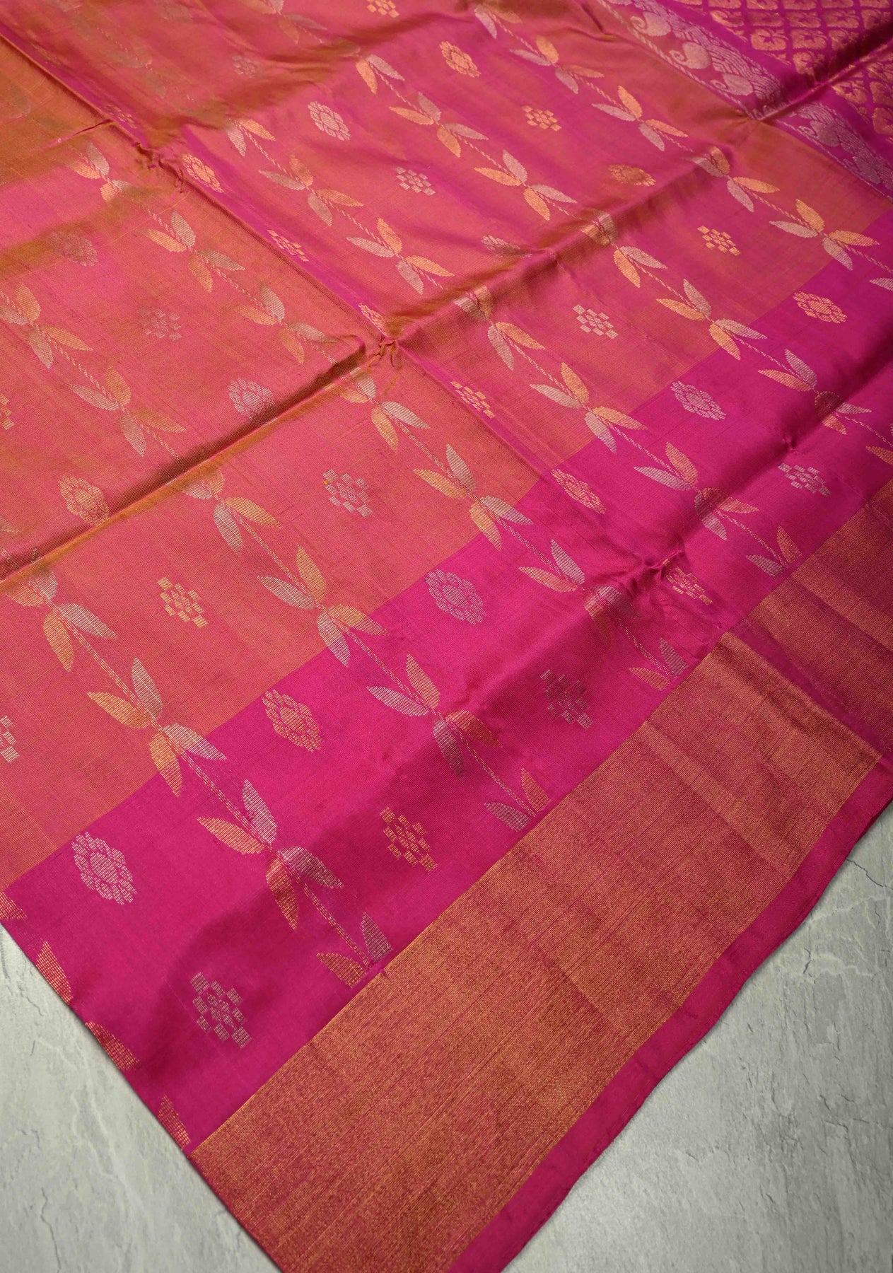 Radiate soft sophistication with this  Pink Dual Tone Uppada Handloom Silk Saree, featuring delicate gold and silver stripes that lend a graceful shimmer to its rich texture. Handwoven from luxurious Uppada silk, it offers a lightweight drape and a subtle sheen. The tissue border adds a touch of refined elegance, making it perfect for weddings, festive occasions, and cultural celebrations.