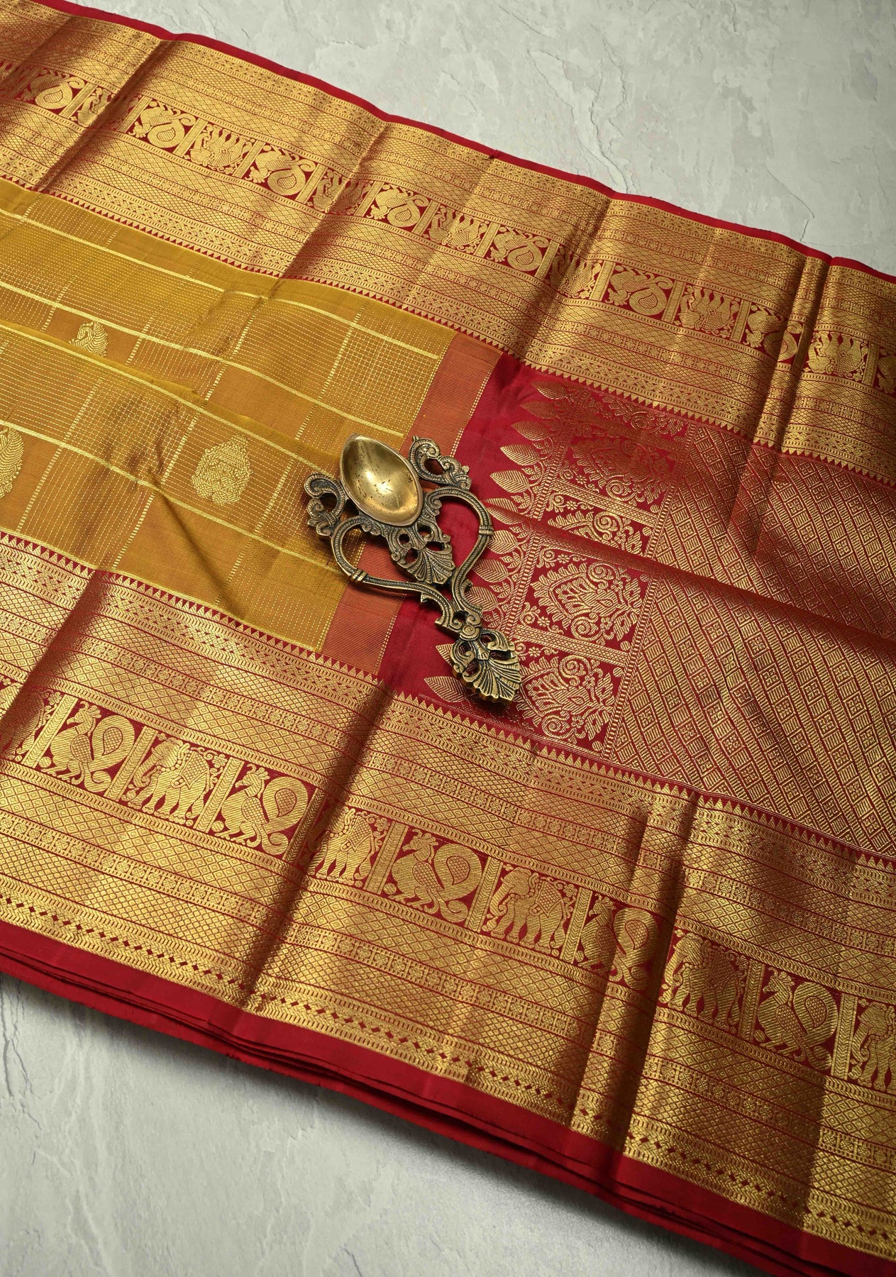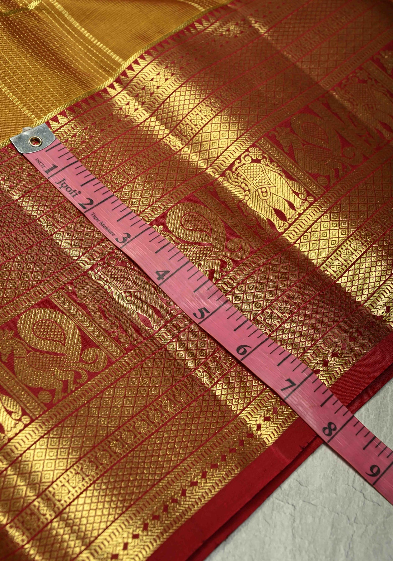The lightweight pure silk fabric ensures a graceful drape, perfect for weddings, festive occasions, and cultural events. Its warm honey hue paired with shimmering zari work makes it a classic and sophisticated choice.