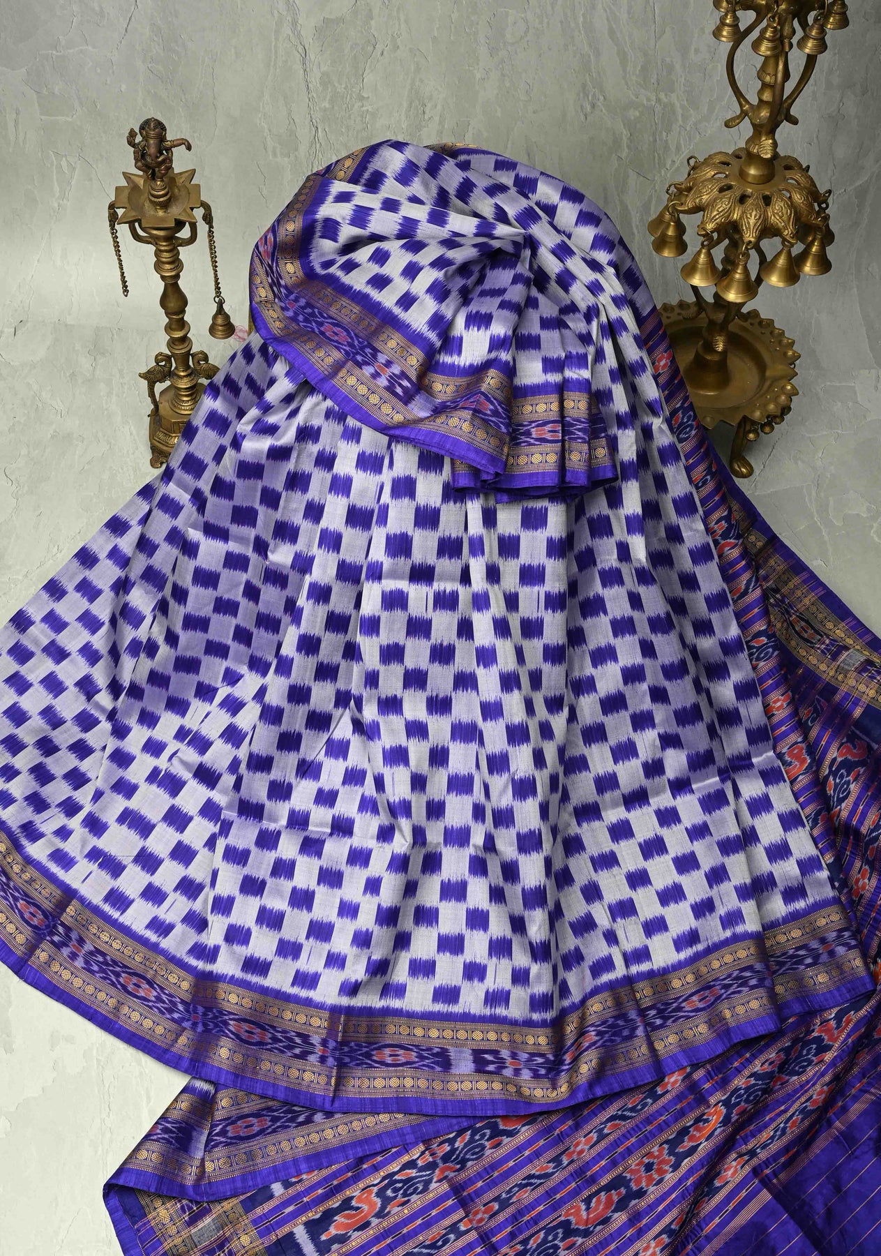 This Ink Purple-Gray Handloom Sambalpuri Ikkat Silk Saree is a beautiful blend of tradition and contemporary style. Handwoven by skilled artisans, it features a subtle yet elegant checks pattern across the body, creating a sophisticated visual texture. The saree is complemented by a matching border that enhances its dual-tone charm. Lightweight, soft, and gracefully draping, this saree is perfect for festive occasions, cultural events, and formal gatherings, reflecting the timeless artistry of Sambalpuri weaving.