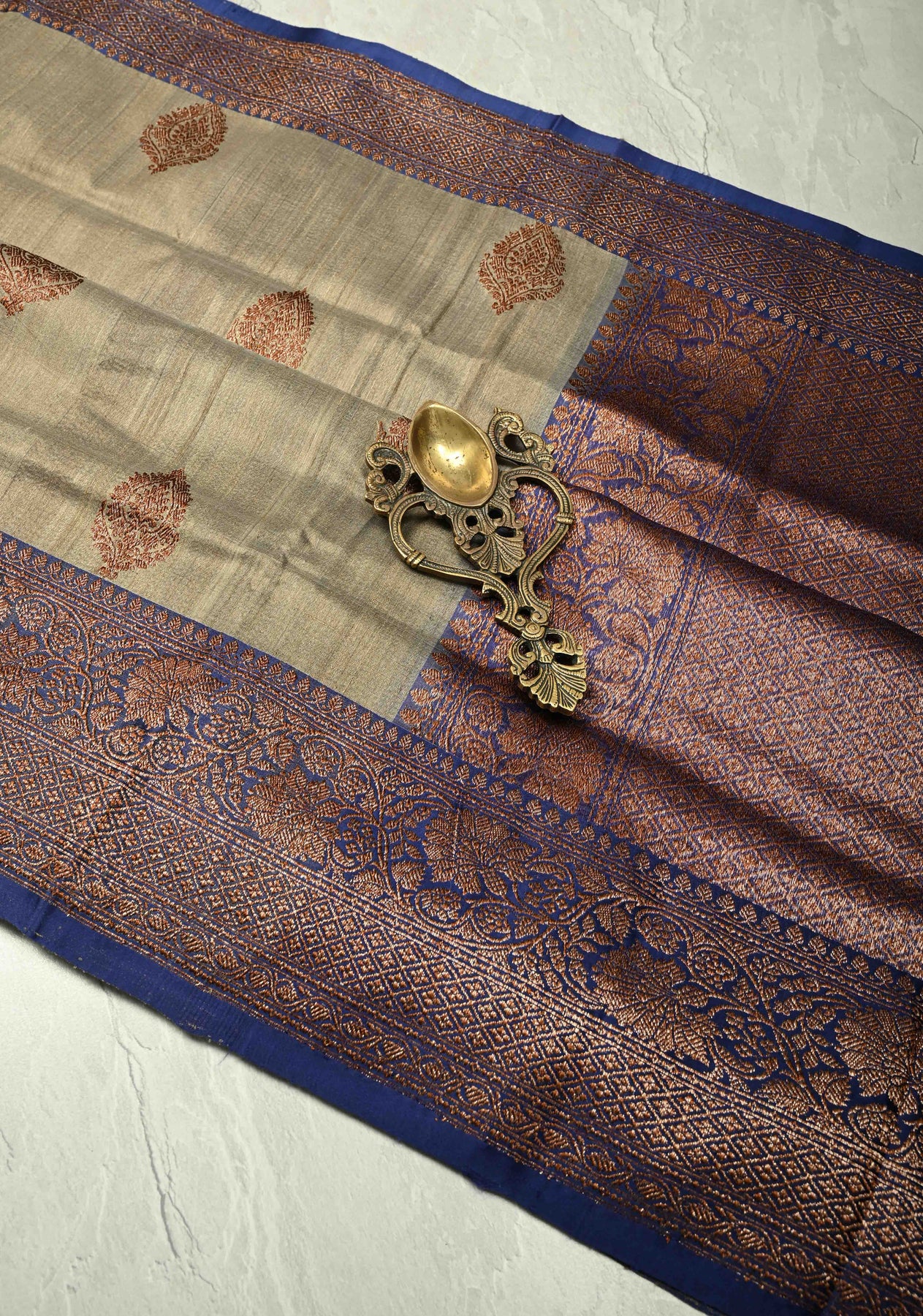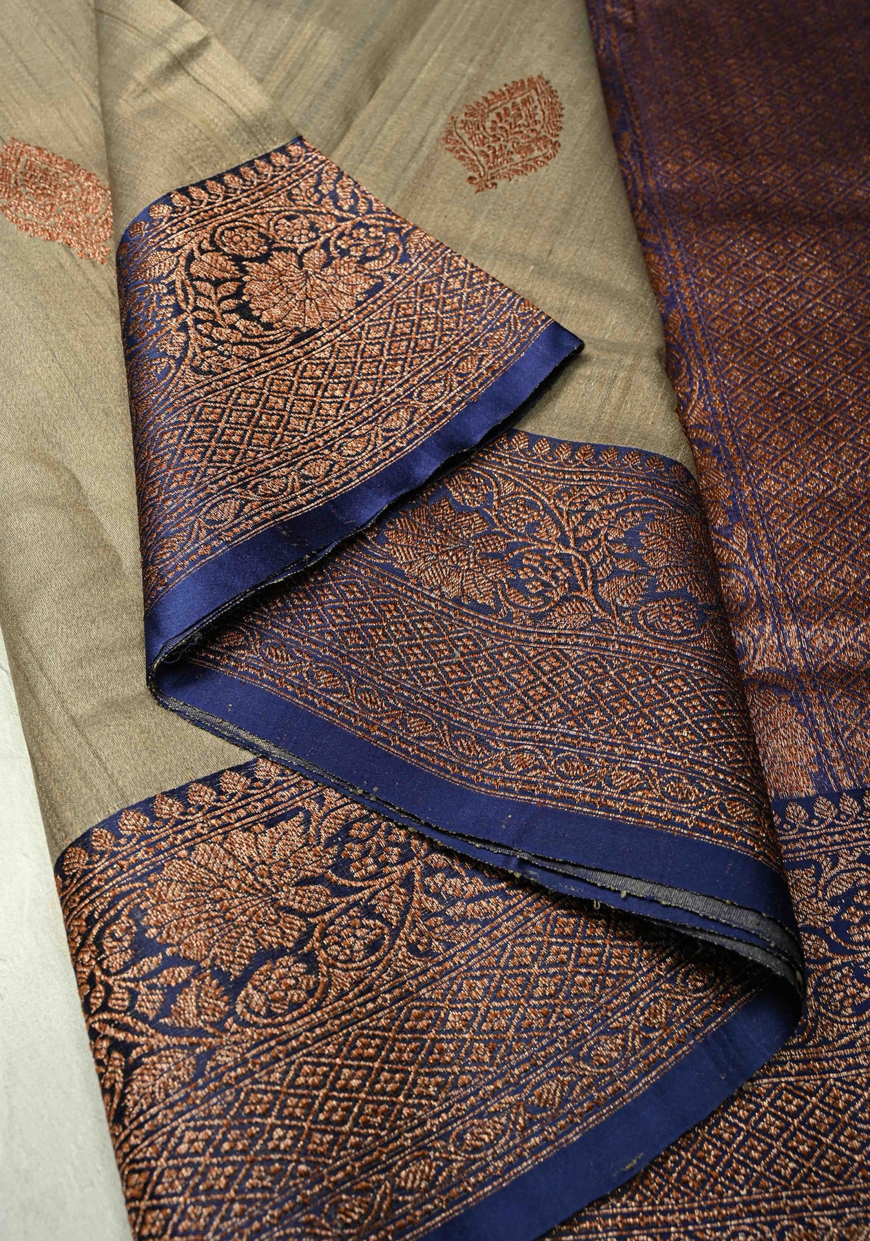 This Khaki Banarasi Tussar Silk Saree combines subtle elegance with traditional craftsmanship, making it perfect for refined celebrations. Woven from tussar silk, the saree features delicate antique zari buttas that add a graceful shimmer and intricate detailing across the fabric. The contrasting zari border beautifully highlights the khaki base, lending a regal and sophisticated finish. Ideal for weddings, festive occasions, and formal events, this saree reflects the timeless charm and artistry of Banarasi weaving.