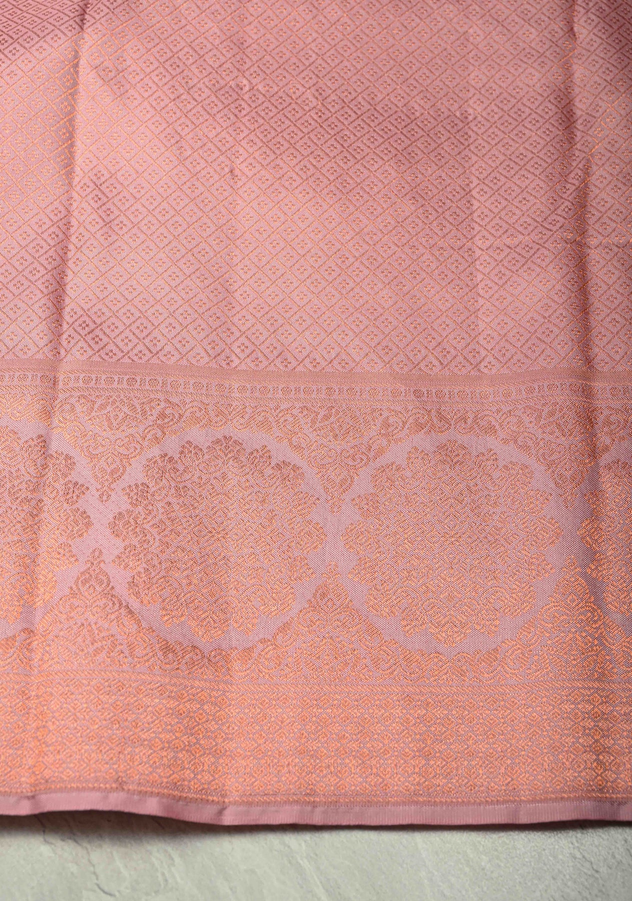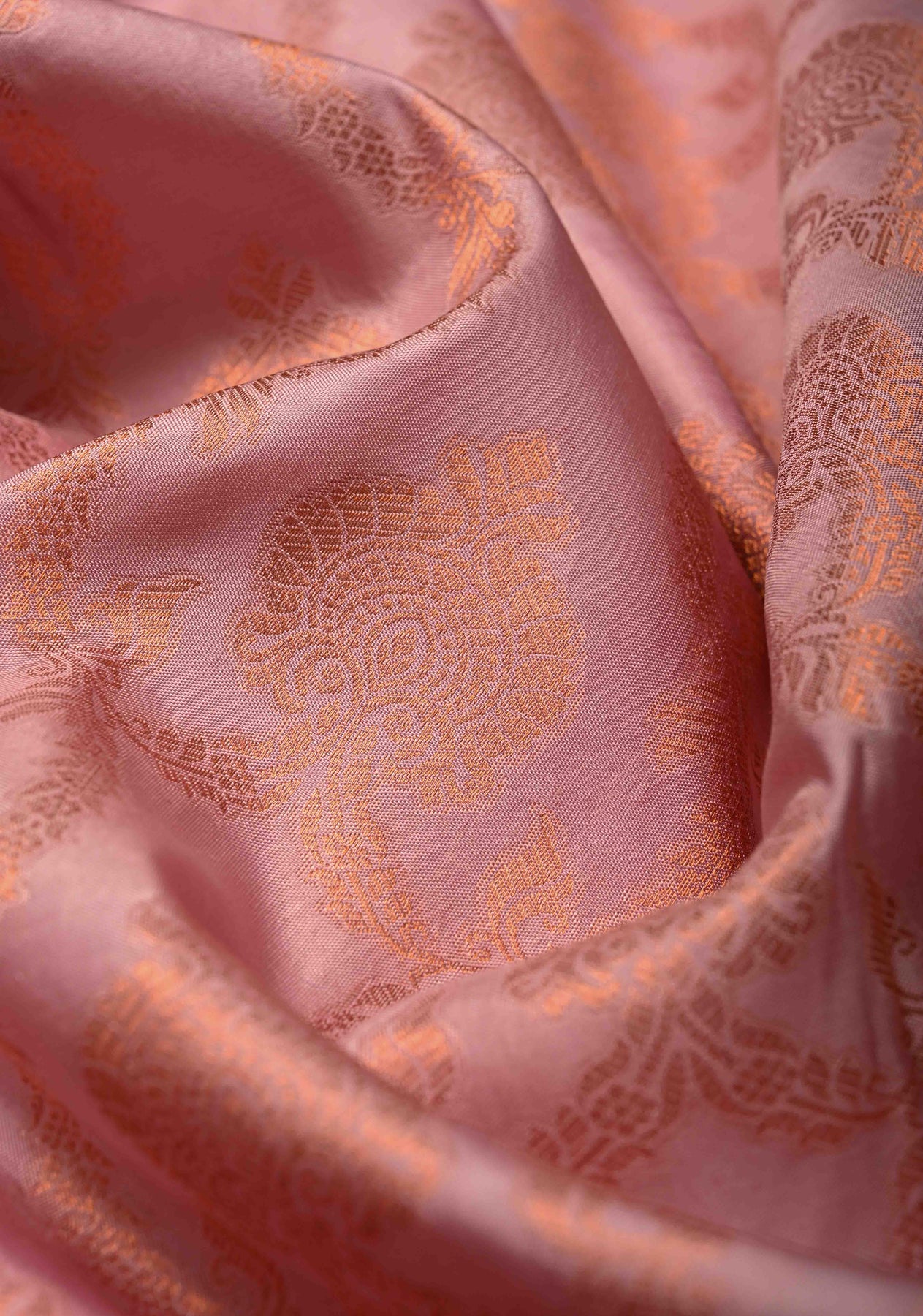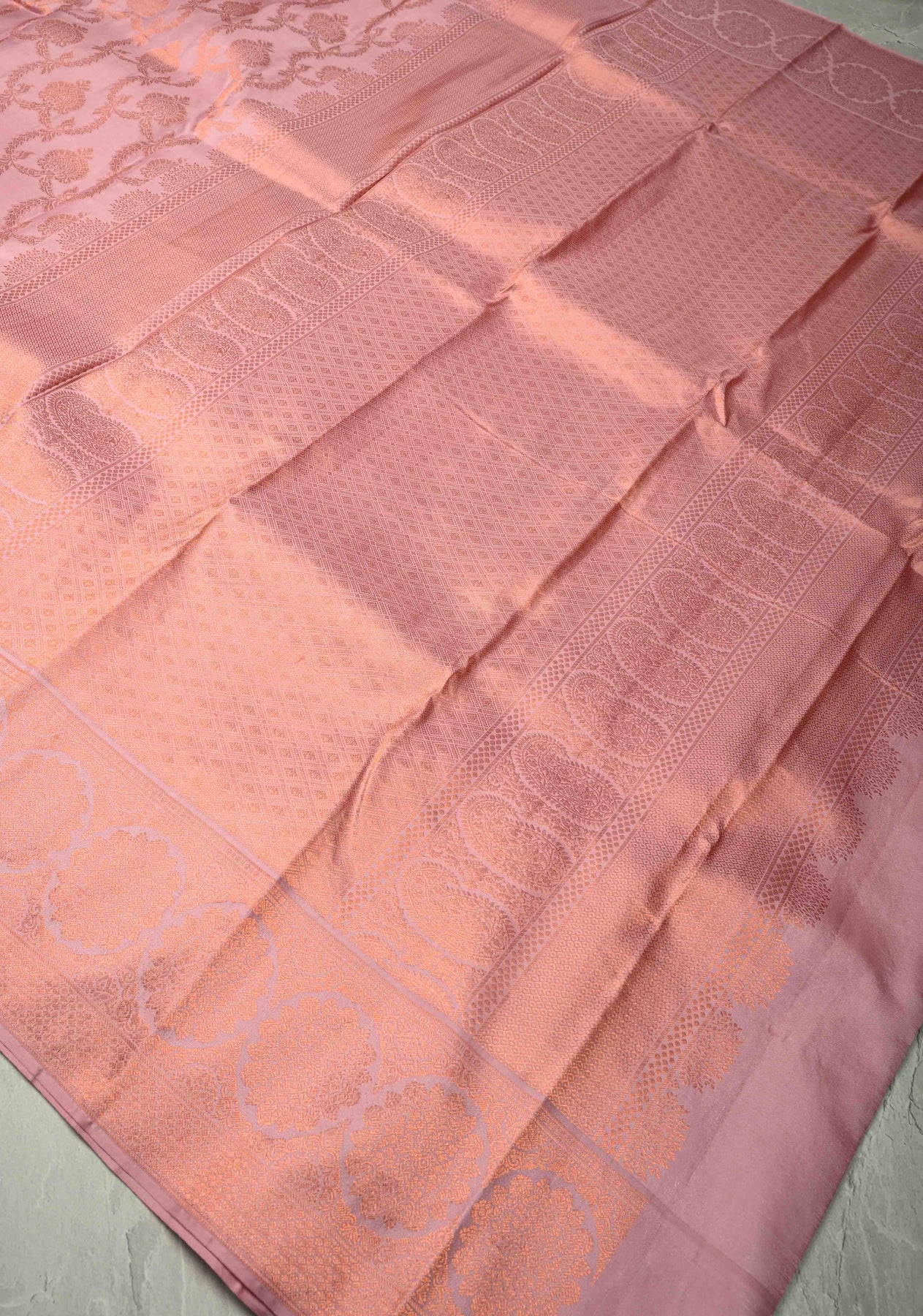 Exude grace and sophistication with this Light Rose Pink Pure Kanchi Silk Saree, a masterpiece of traditional Indian craftsmanship. Woven from authentic Kanchipuram silk, it features a delicate brocade jaal pattern that adds elegance and texture. The golden zari border and pallu enhance its regal charm, making it ideal for weddings, festive occasions, and special celebrations. This saree is perfect for those who love timeless beauty with a soft, feminine hue.