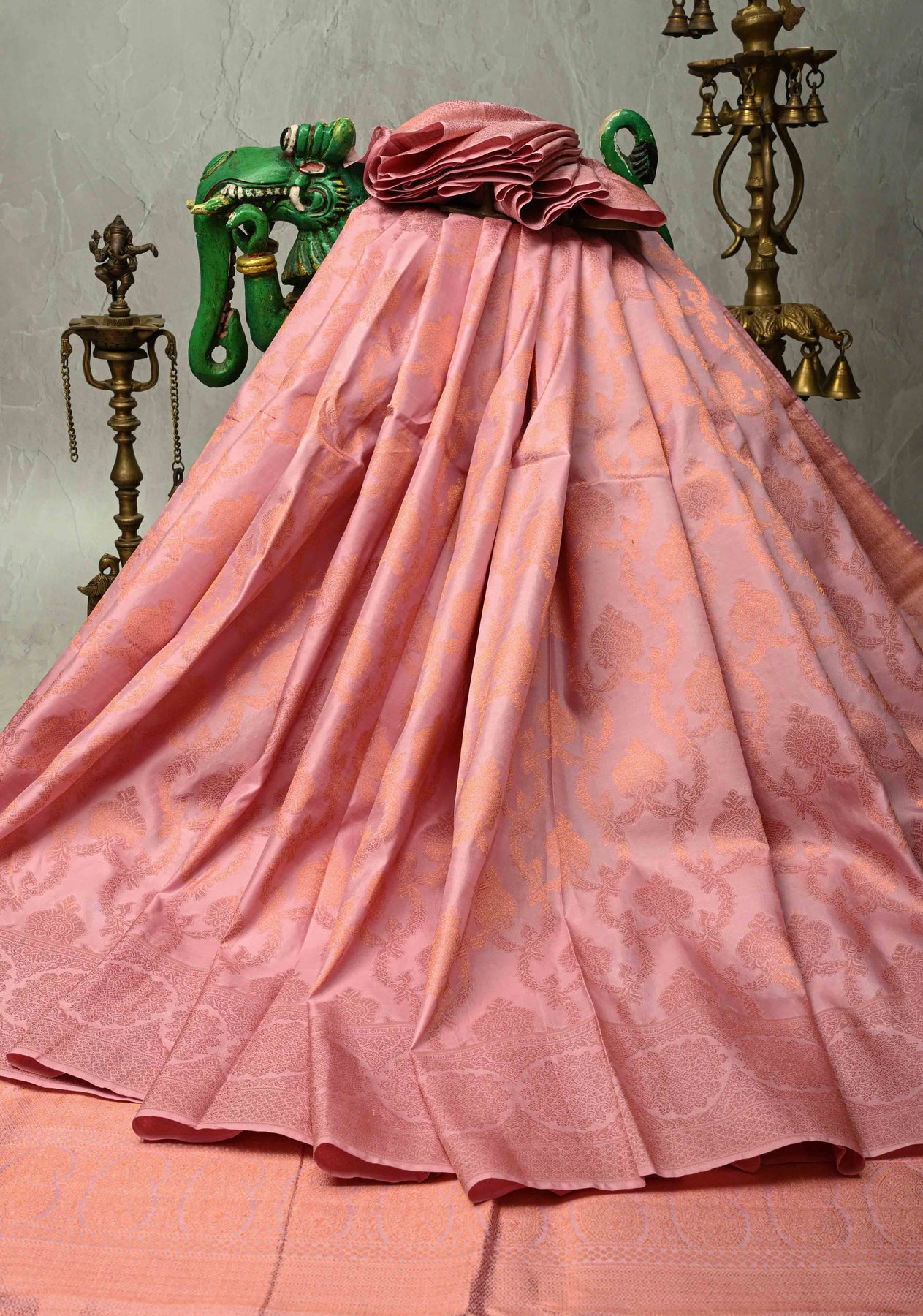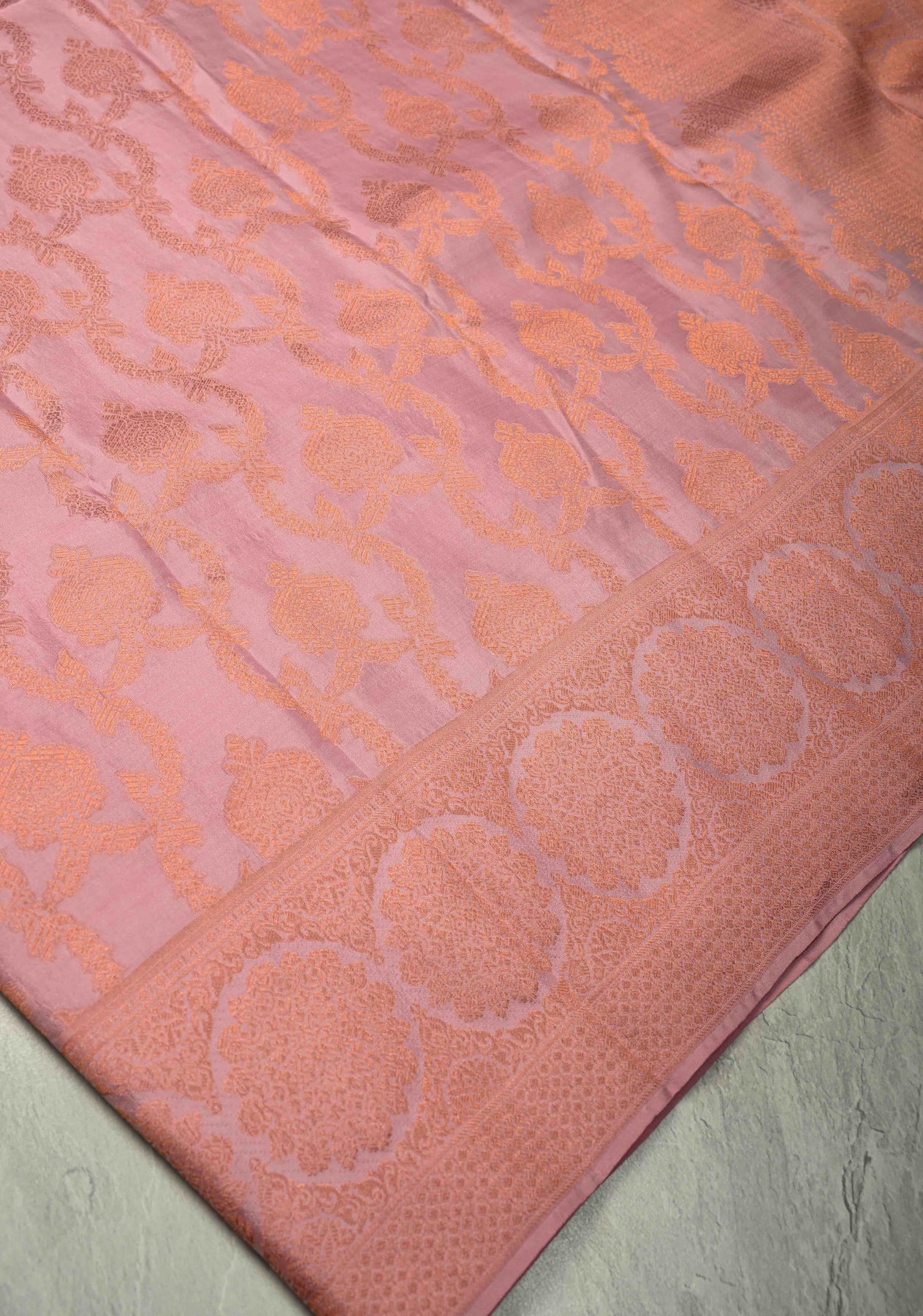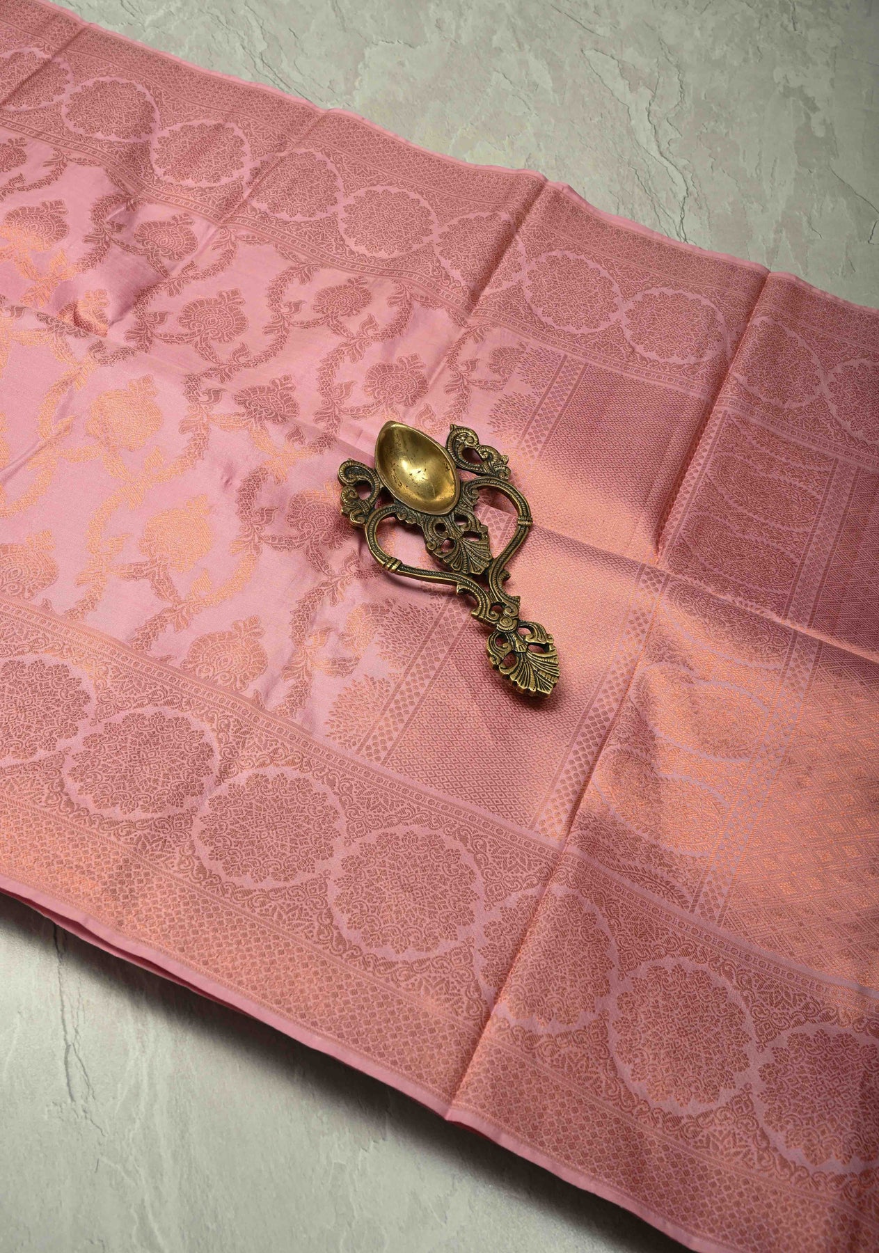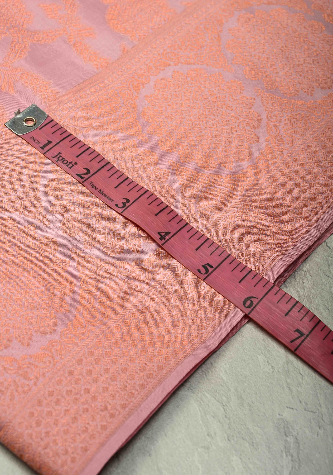 Exude grace and sophistication with this Light Rose Pink Pure Kanchi Silk Saree, a masterpiece of traditional Indian craftsmanship. Woven from authentic Kanchipuram silk, it features a delicate brocade jaal pattern that adds elegance and texture. The golden zari border and pallu enhance its regal charm, making it ideal for weddings, festive occasions, and special celebrations. This saree is perfect for those who love timeless beauty with a soft, feminine hue.