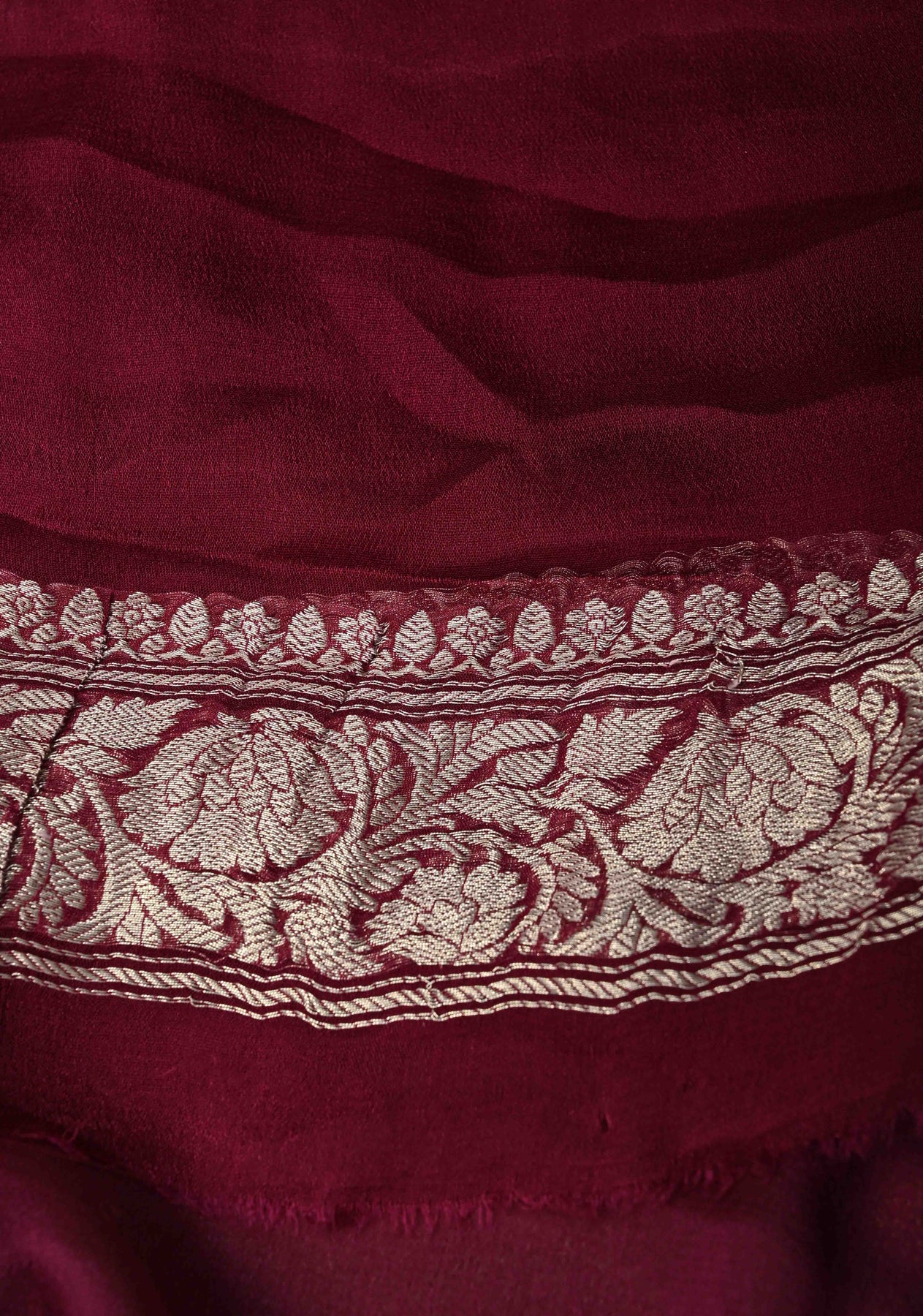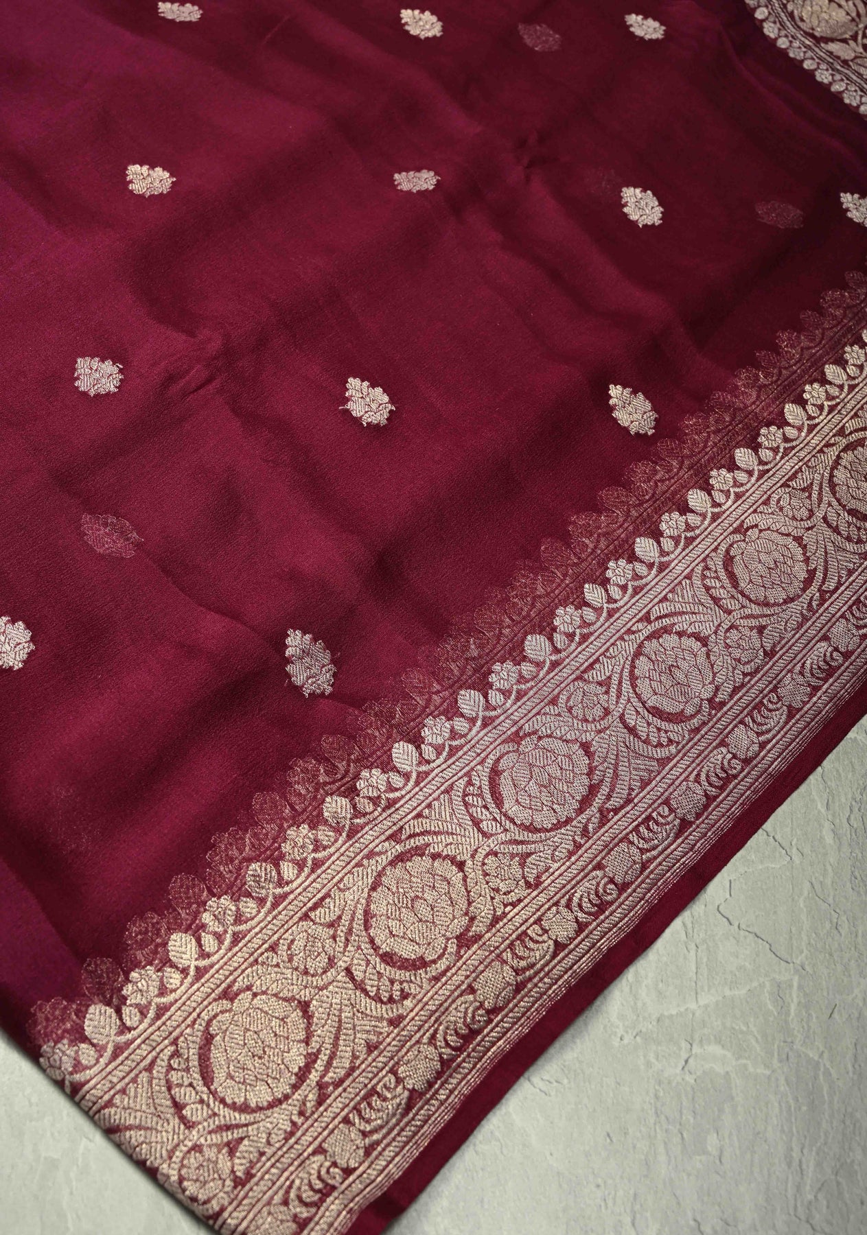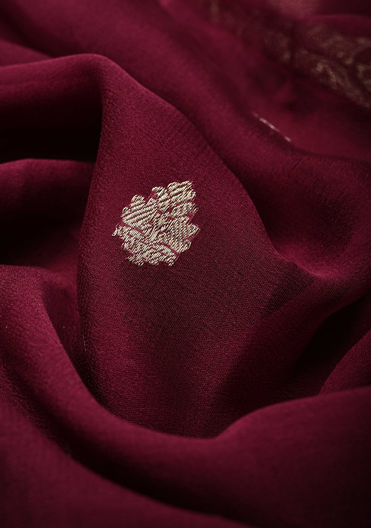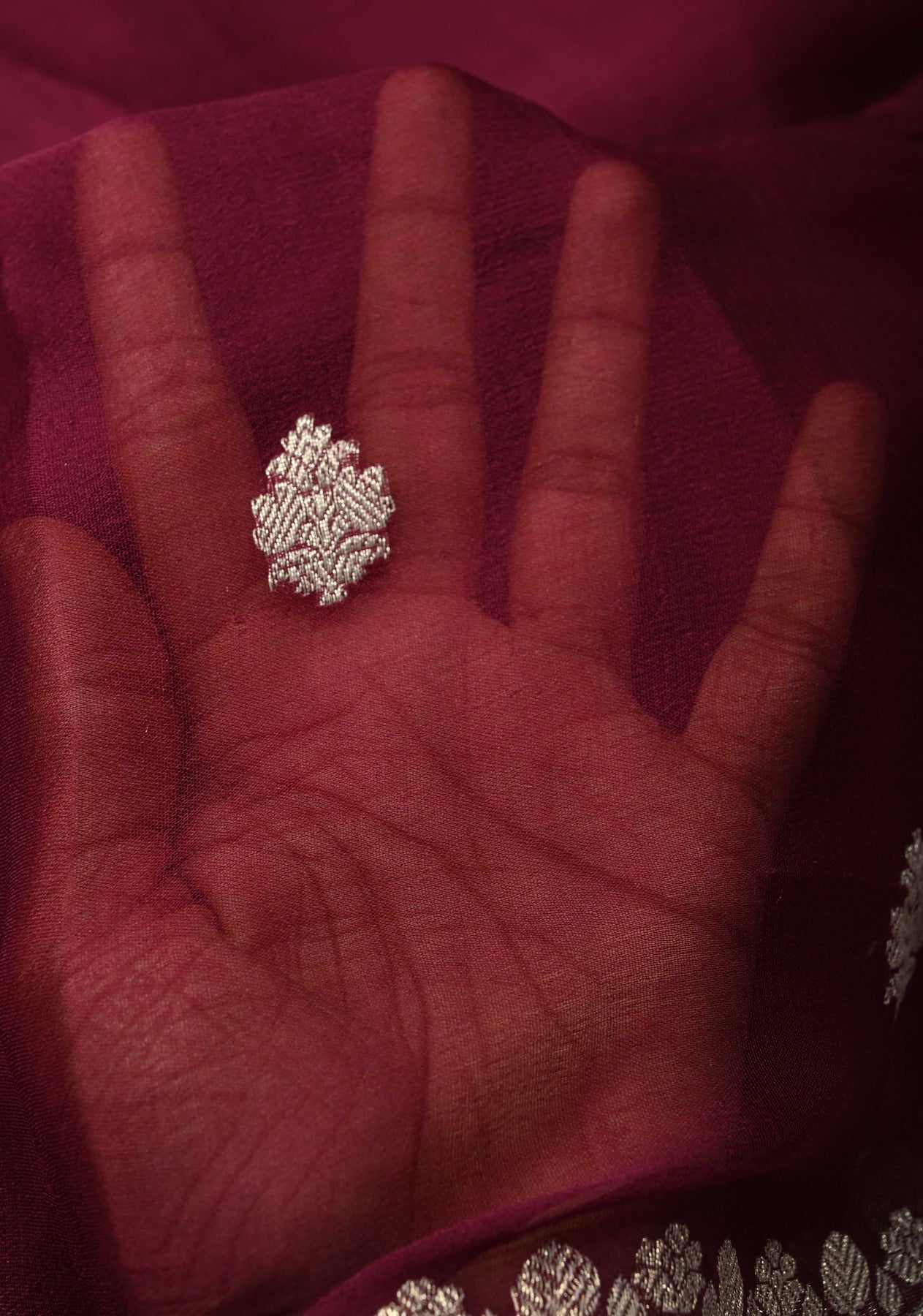 This Maroon Banarasi Chiffon Silk Saree with Silver Tone Zari Buttas and Zari Border exudes timeless grace and refined elegance. Handwoven from chiffon silk, it features a soft, airy texture that drapes beautifully, creating a flowing and flattering silhouette. The deep maroon body is adorned with delicate silver-tone zari buttas, adding a subtle sparkle that enhances its rich hue. A finely crafted silver zari border and pallu complete the look, lending a touch of regal sophistication. Perfect for festive occasions, weddings, or evening celebrations, this saree blends Banarasi tradition with understated glamour.