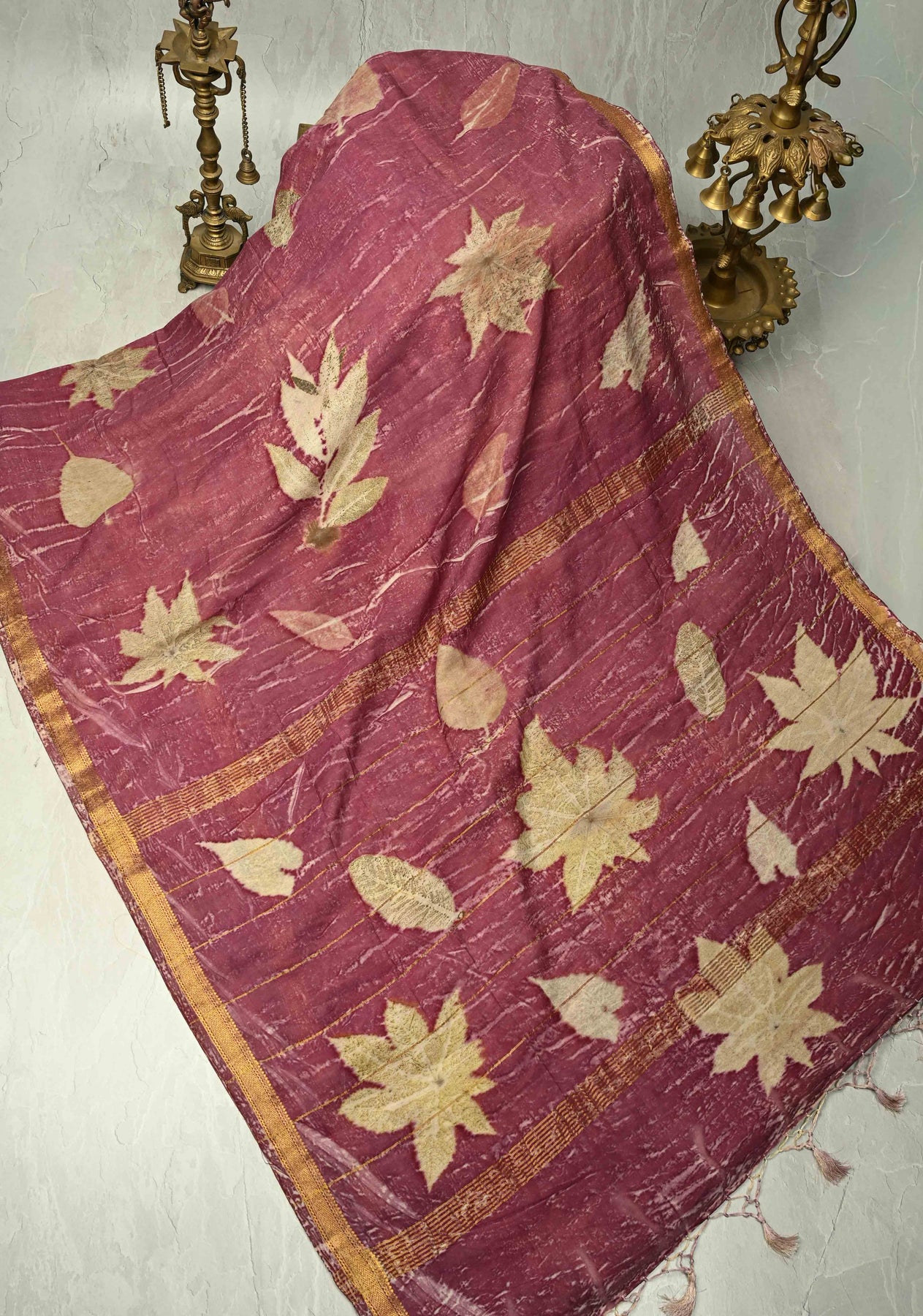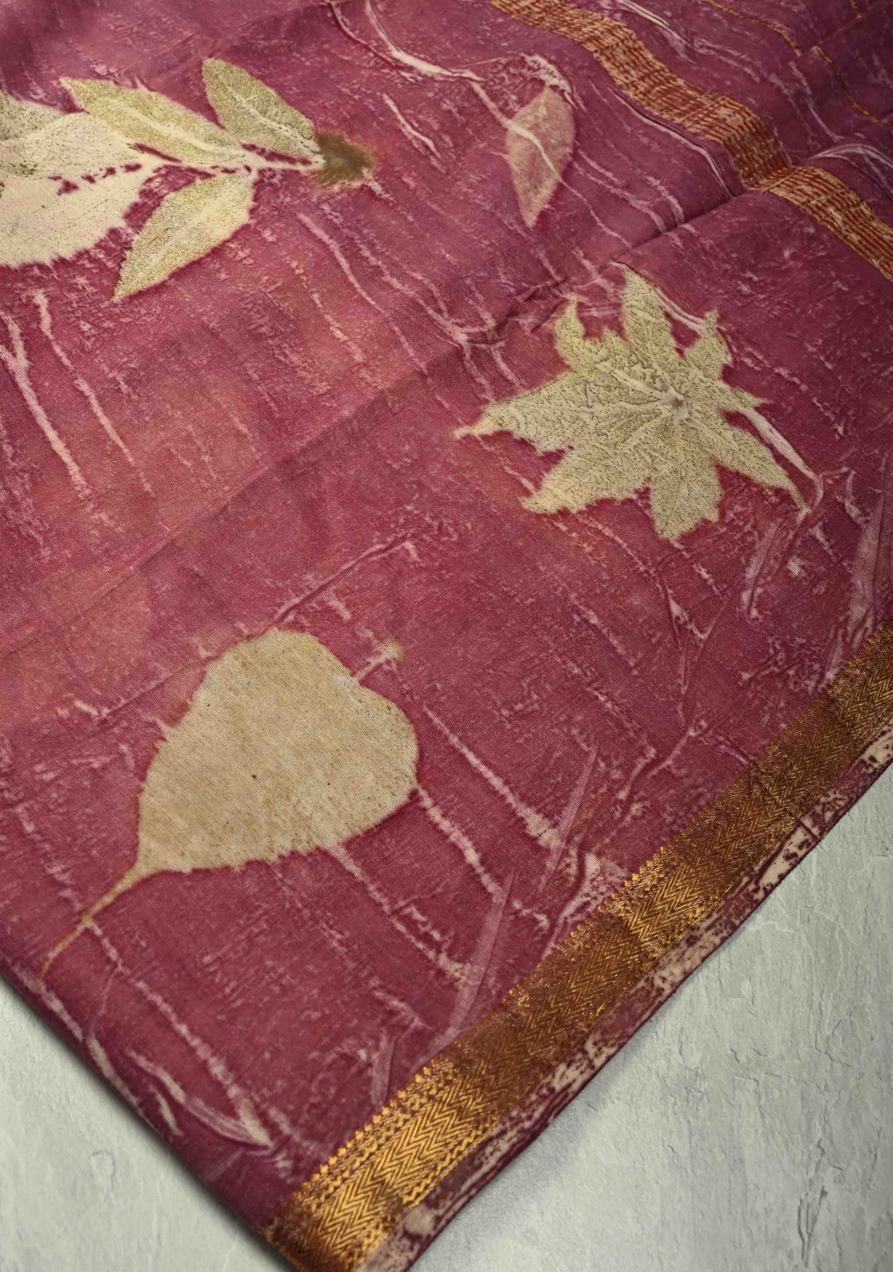 This Mauve Eco-Printed Chanderi Silk Saree showcases a perfect blend of tradition and eco-conscious artistry. Crafted from lightweight, sheer Chanderi silk, it drapes elegantly, offering a graceful silhouette. The saree is adorned with delicate leaf buttas throughout, adding a natural charm and subtle texture. Its minimal zari border enhances the overall design without overpowering the soft mauve hue, making it versatile for both festive and casual occasions. Perfectly pairing elegance with comfort, this saree is an ideal choice for those who appreciate sustainable fashion with timeless appeal..