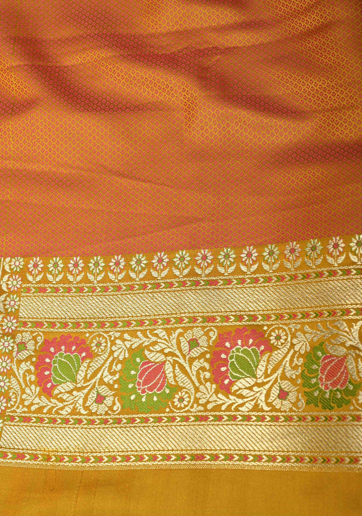 This elegant Mustard Yellow Semi Tanchoi Banarasi Satin Silk Saree is a true celebration of timeless craftsmanship and regal charm. Expertly woven on luxurious satin silk, it features an exquisite Meenakari floral brocade jaal that adds a touch of intricate artistry to its vibrant mustard hue. Soft, lustrous, and beautifully detailed, this Banarasi saree is an ideal choice for weddings, festive occasions, and grand celebrations, exuding grace and opulence in every drape.