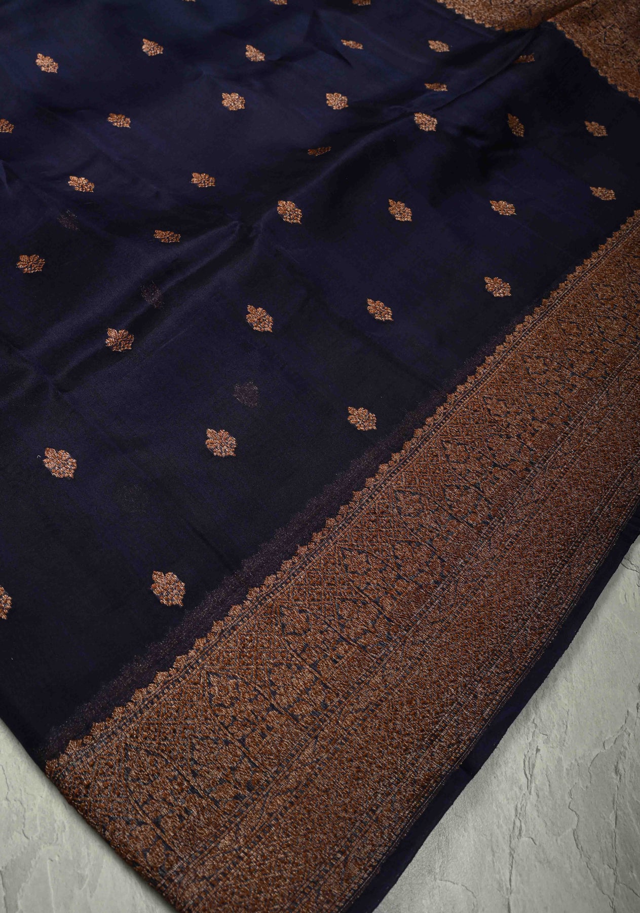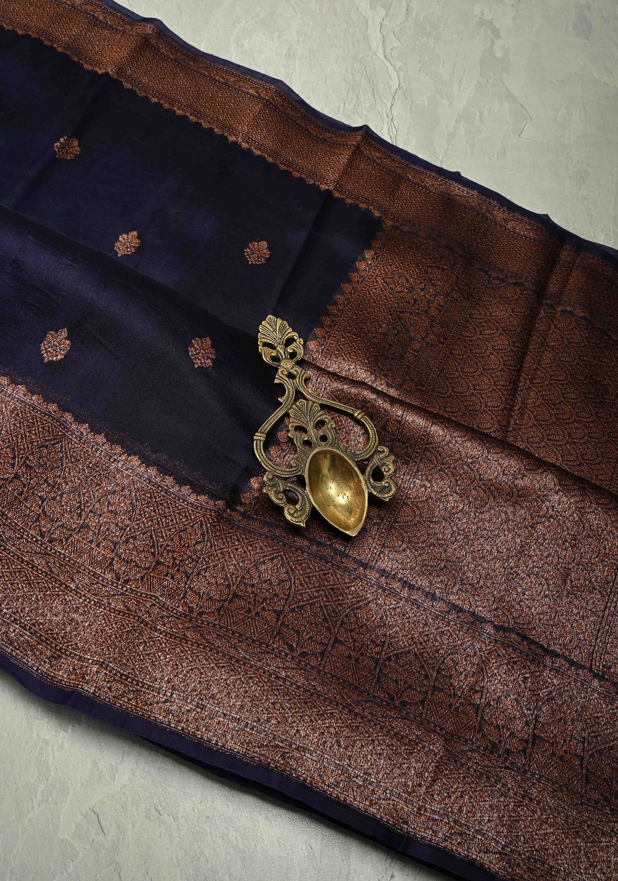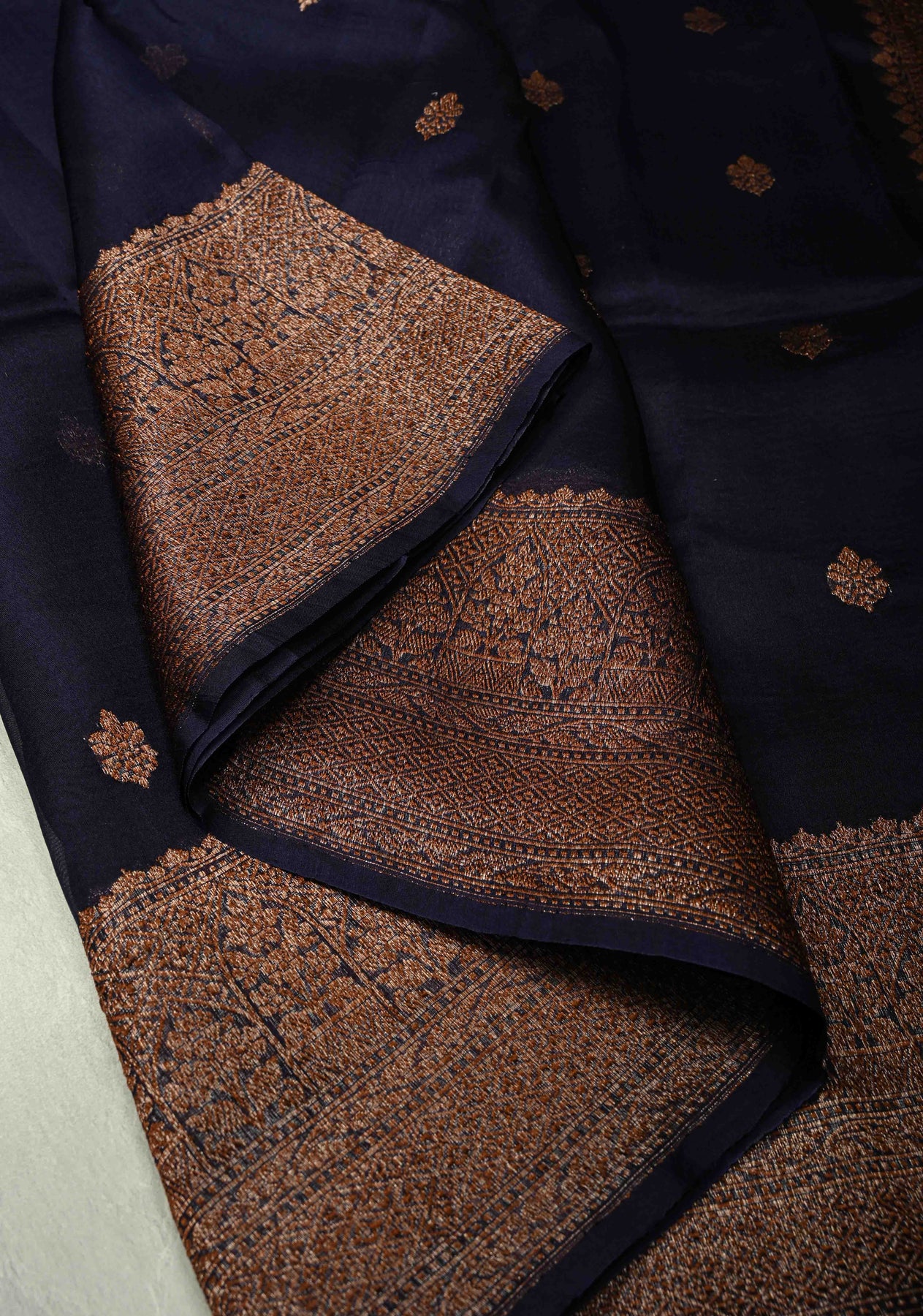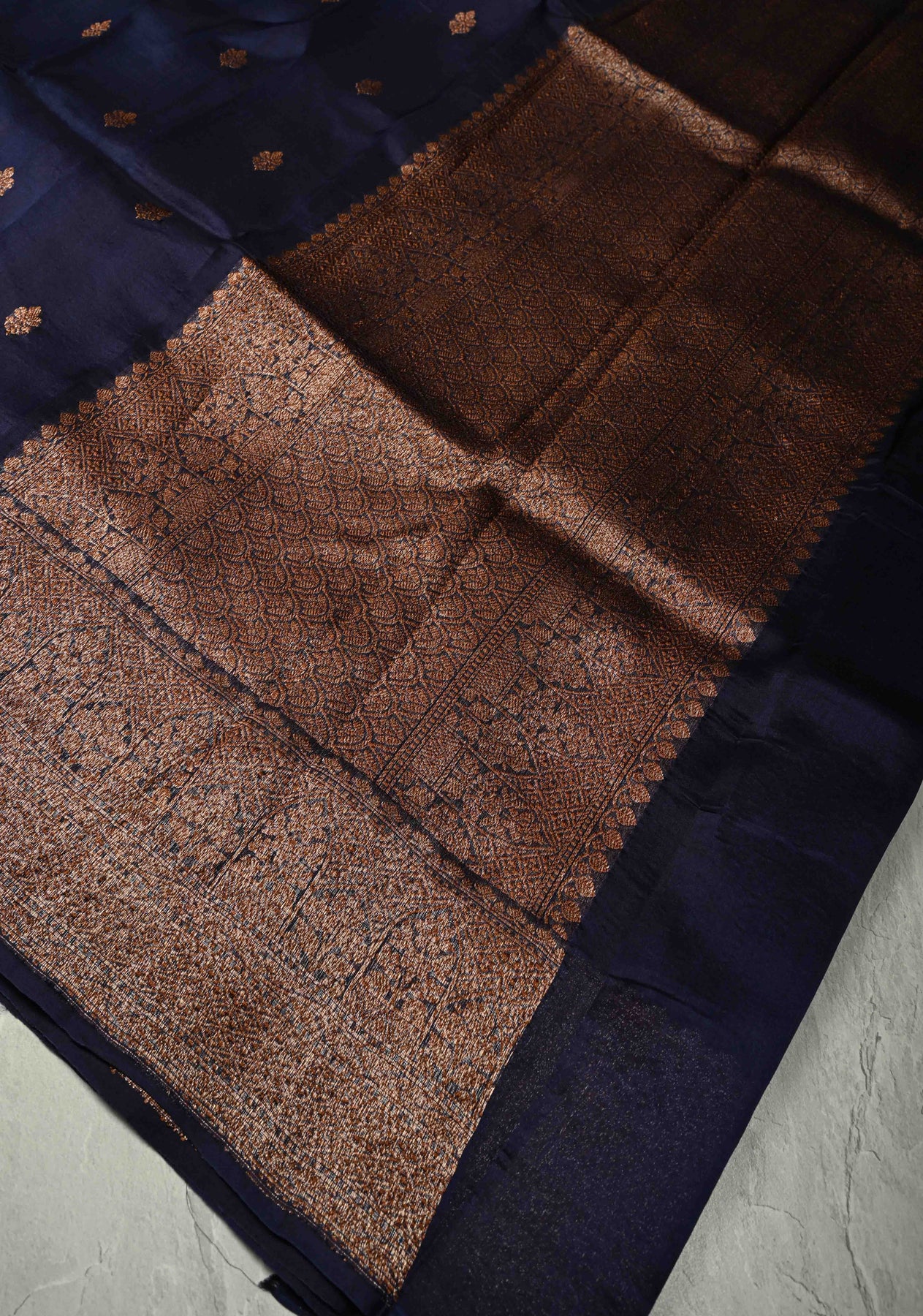 Step into timeless elegance with this Navy Blue Organza Silk Saree, adorned with delicate antique floral buttas that add a touch of sophistication. Crafted from lightweight organza silk, it offers a graceful drape and subtle sheen. The zari border enhances its regal charm, making it perfect for weddings, festive occasions, and traditional celebrations.
