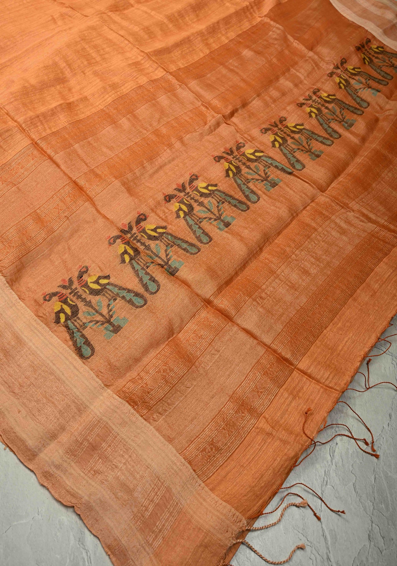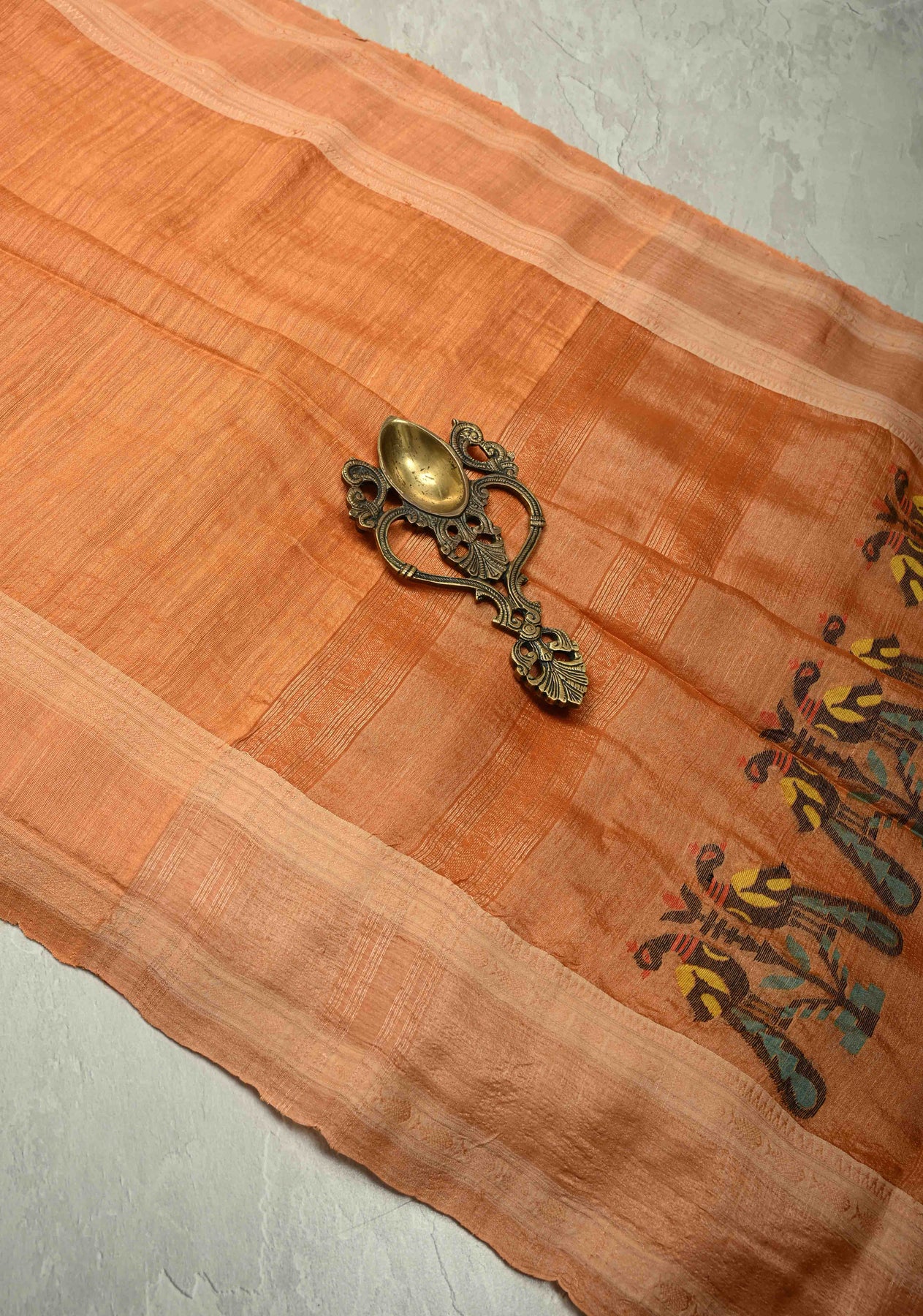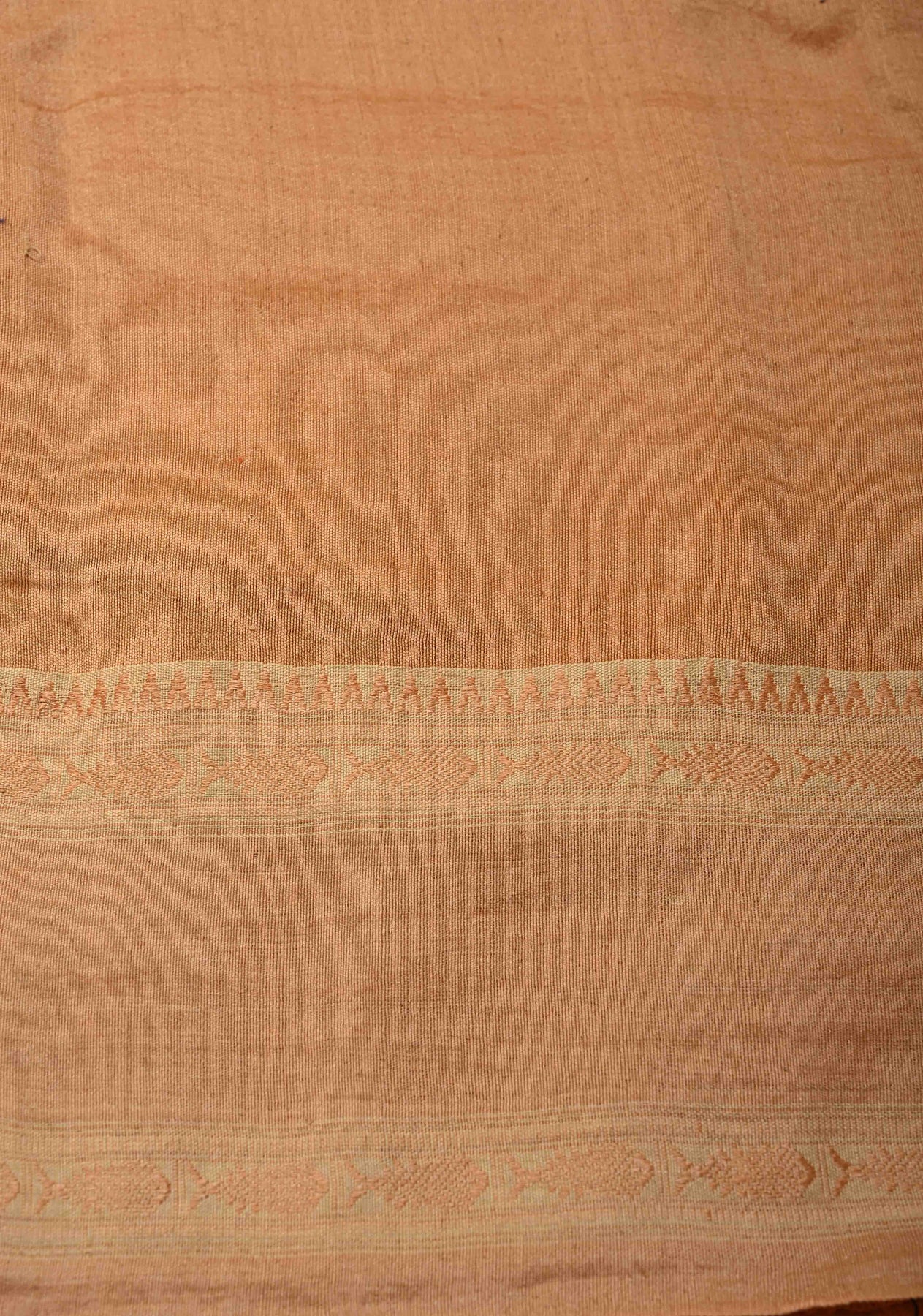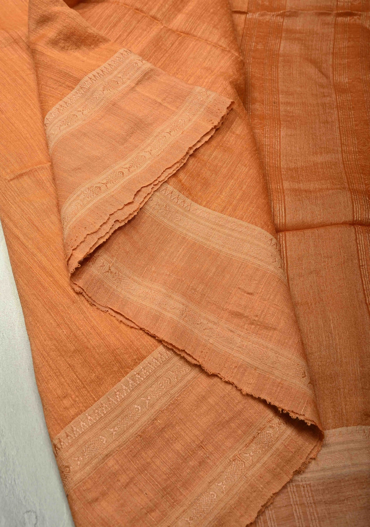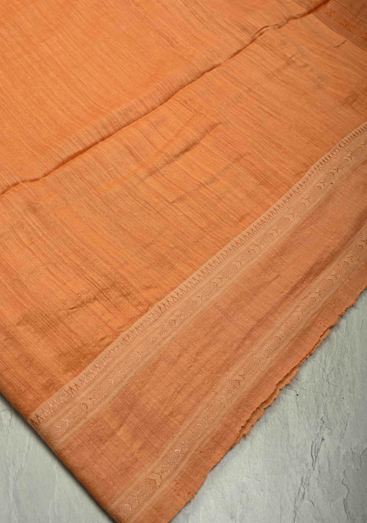 Step into timeless elegance with this Peach Orange Ghicha Tussar Silk Saree, a graceful blend of traditional craftsmanship and subtle luxury. Handwoven from premium Ghicha Tussar silk, it features a naturally textured weave with a gentle sheen that enhances its sophisticated appeal.